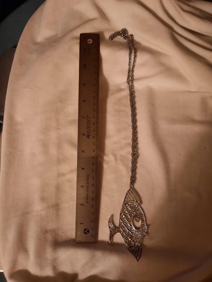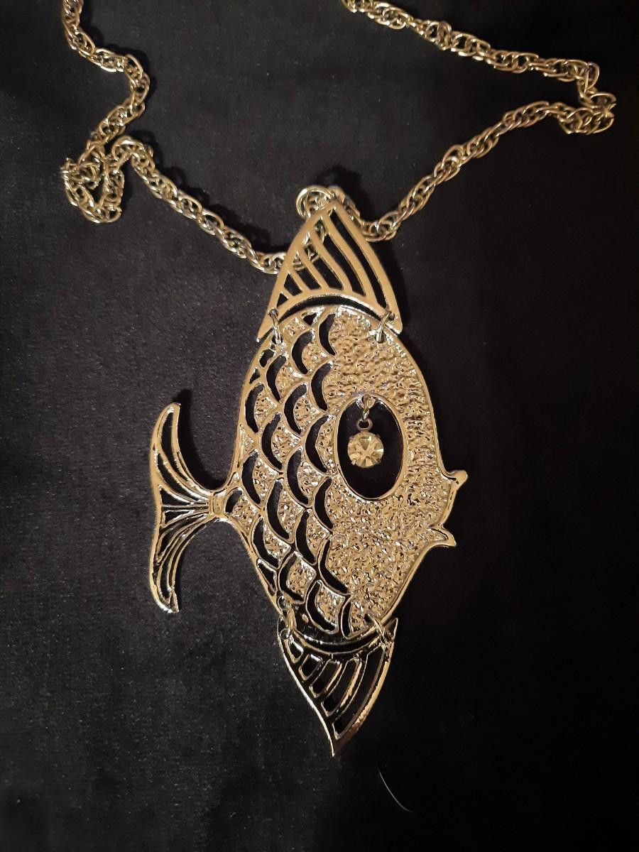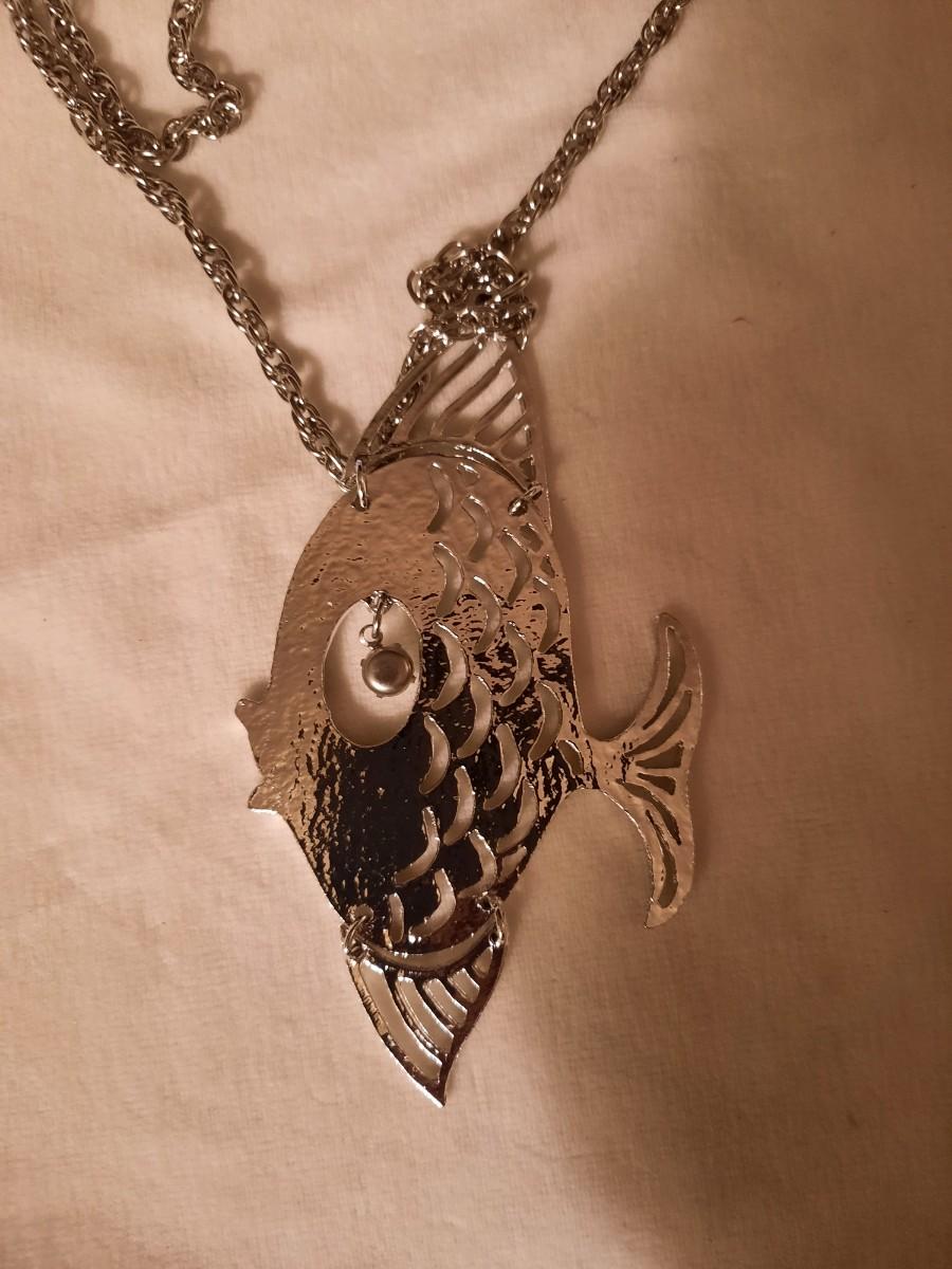 Silver tone hinged angle fish necklace with dangley rhinestone eye.