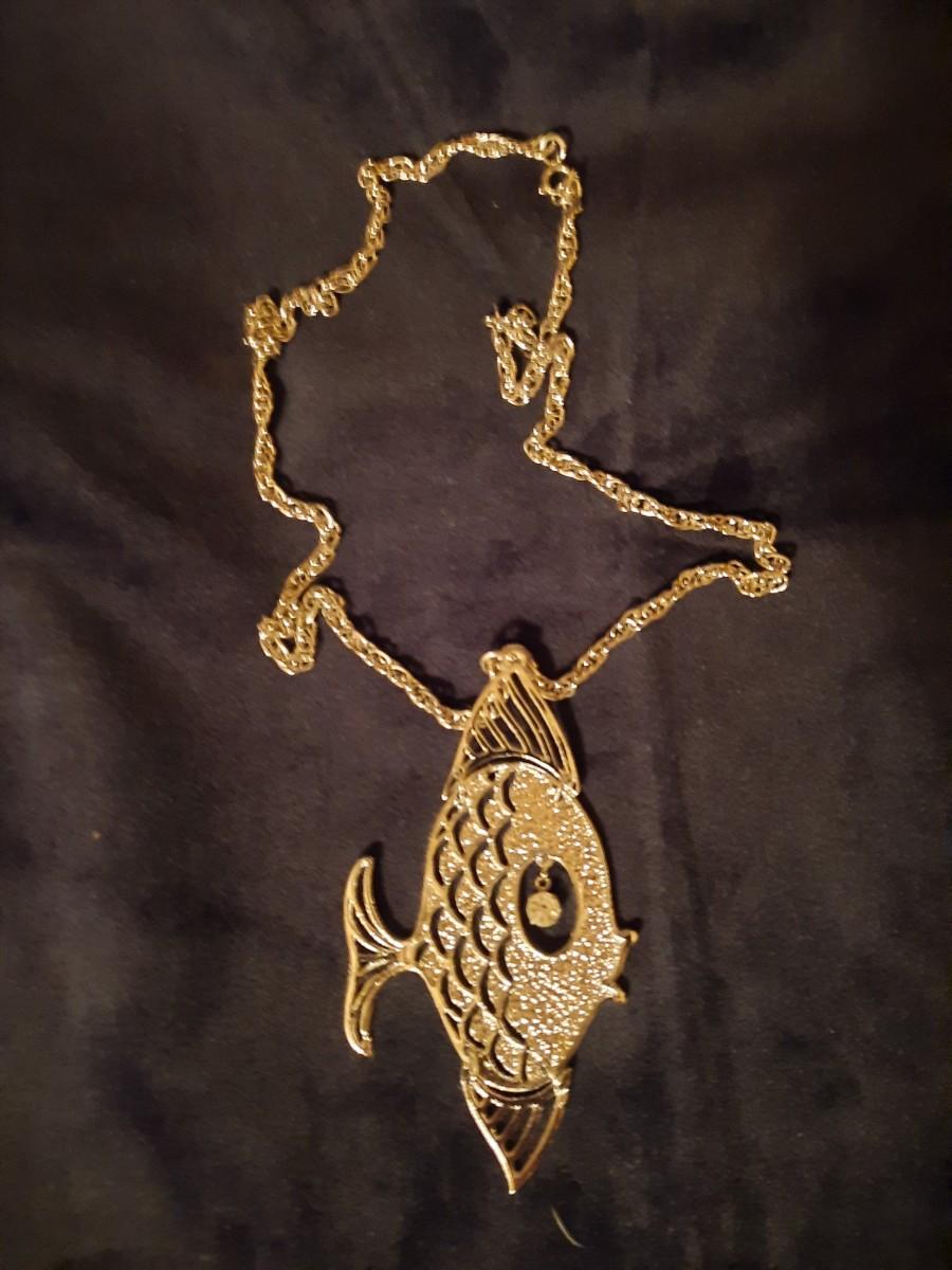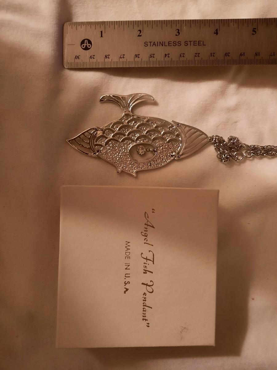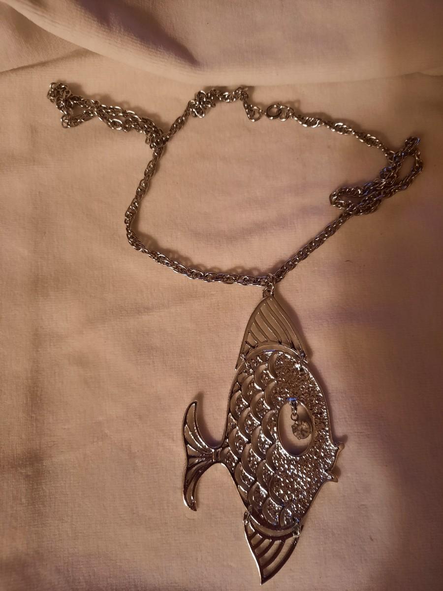 Silver tone hinged angle fish necklace with dangley rhinestone eye.