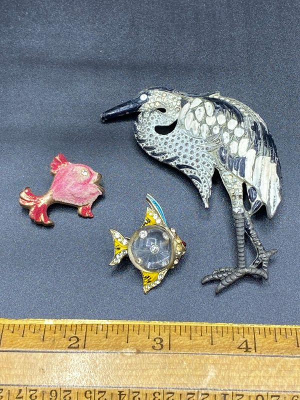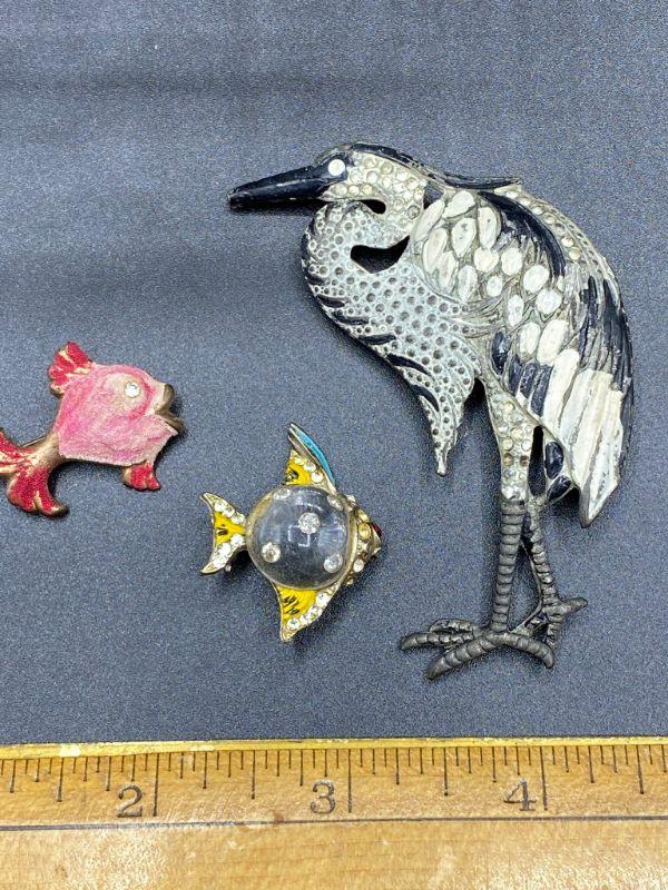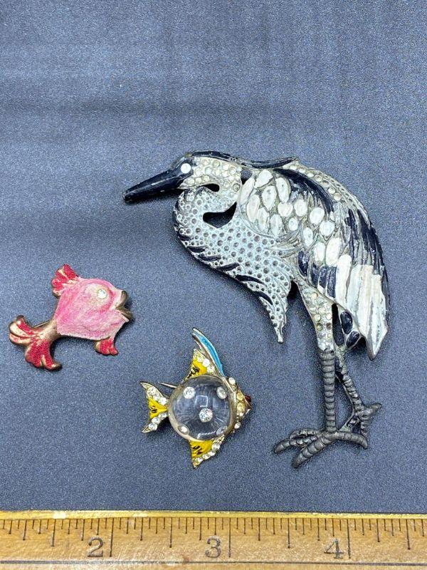 Set of 3 animal pins. A large stork pin and 2 small fish pins. All have signs of age and wear. Great refab pieces or for projects.