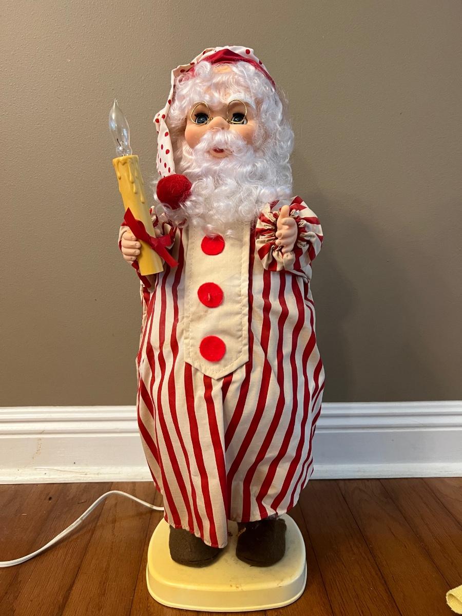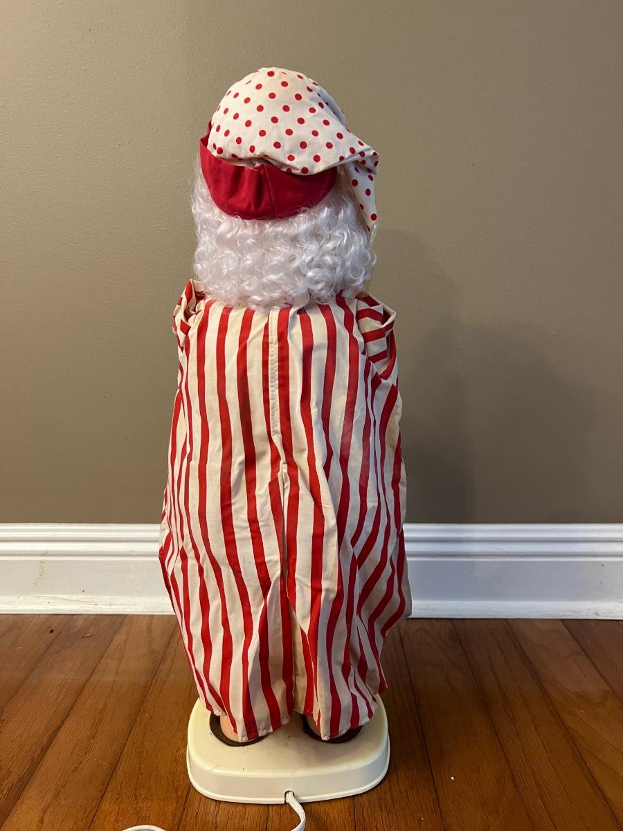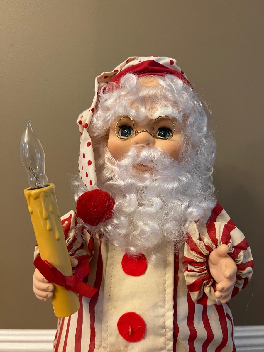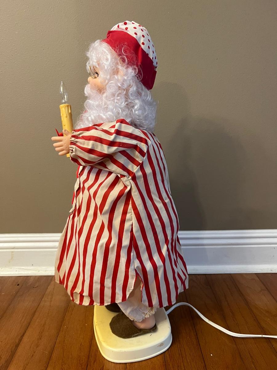 Vintage Christmas Santa animated Doll 25 inches tall. Works as he should. Some discoloration on his clothes and base as he was stored in the attic. See pictures for condition.
