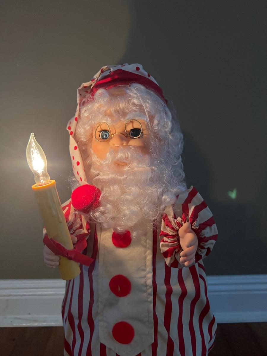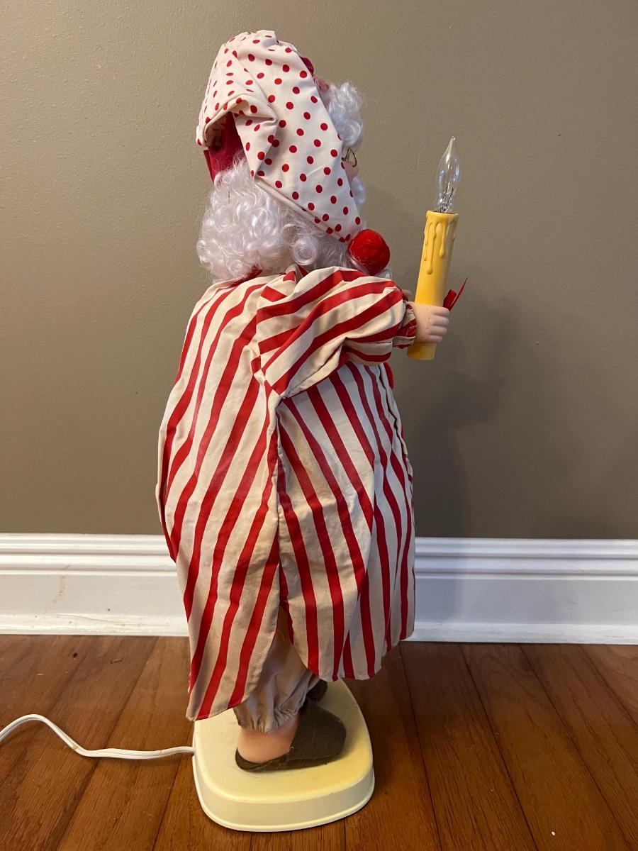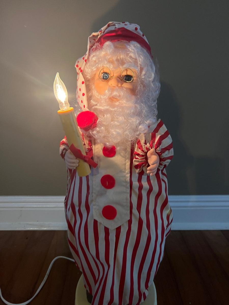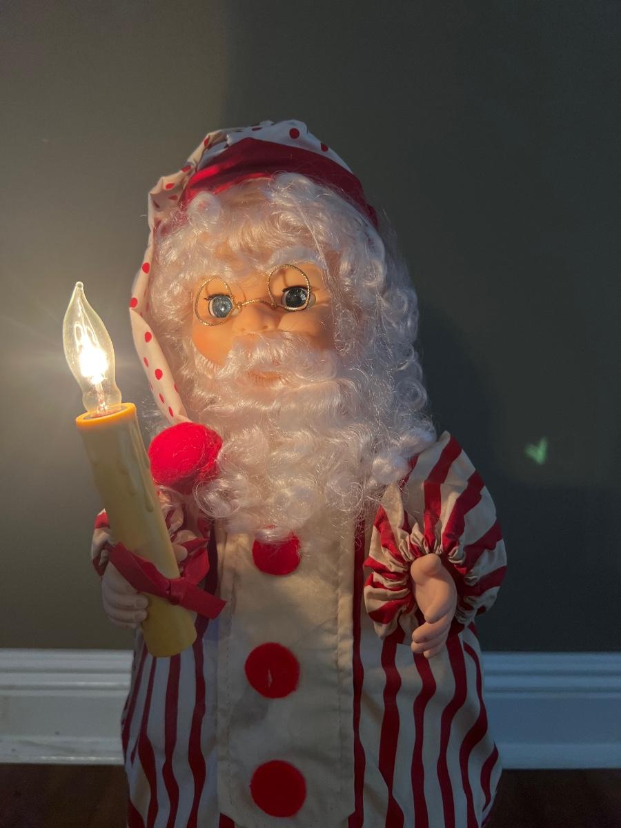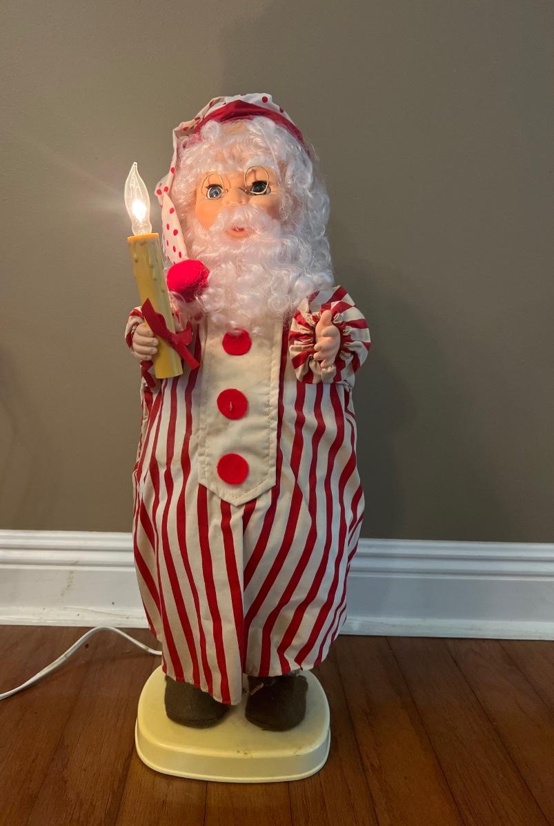 Vintage Christmas Santa animated Doll 25 inches tall. Works as he should. Some discoloration on his clothes and base as he was stored in the attic. See pictures for condition.