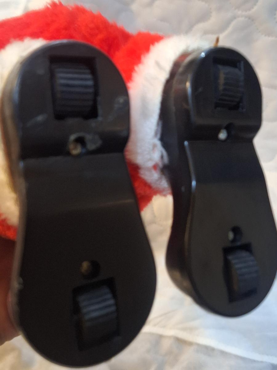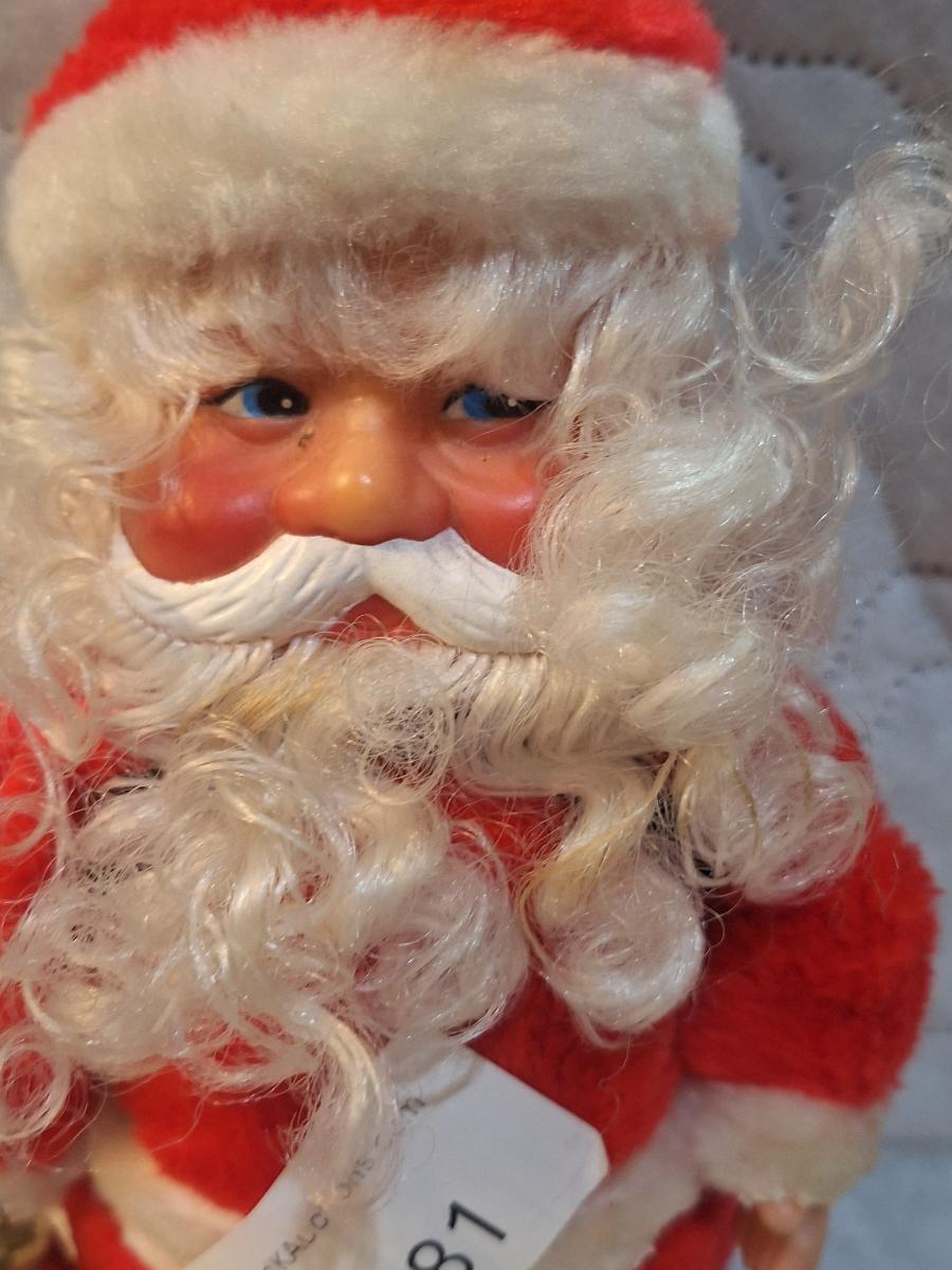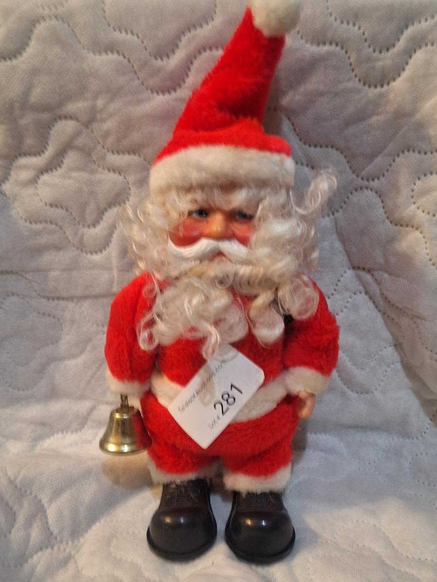 vintage animated Santa Claus doll with a rubber face and a bell. - has wheels on feet