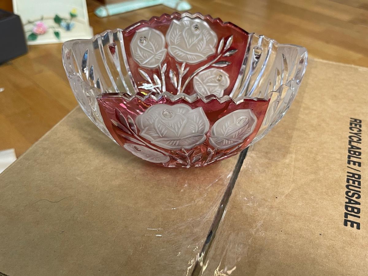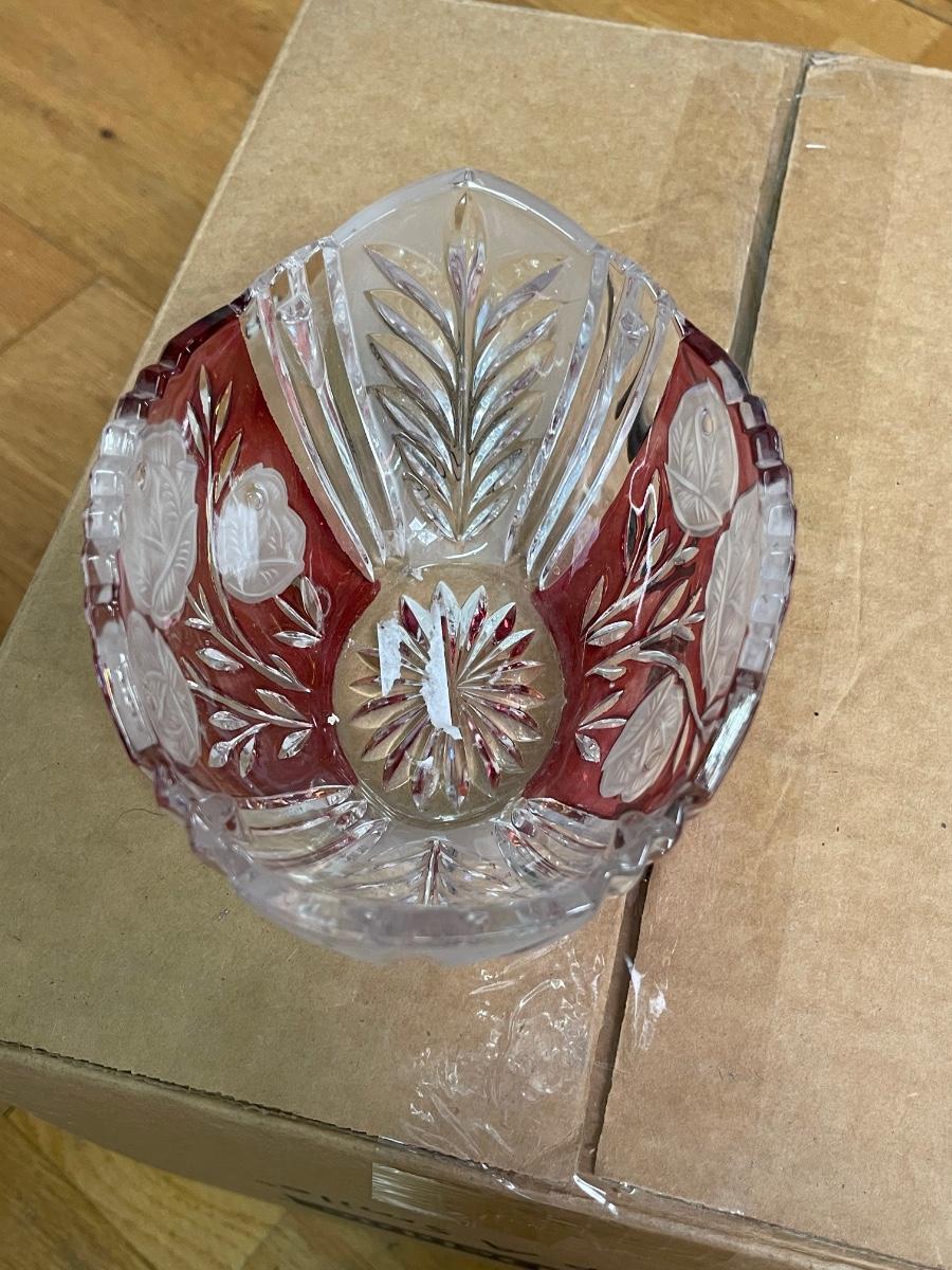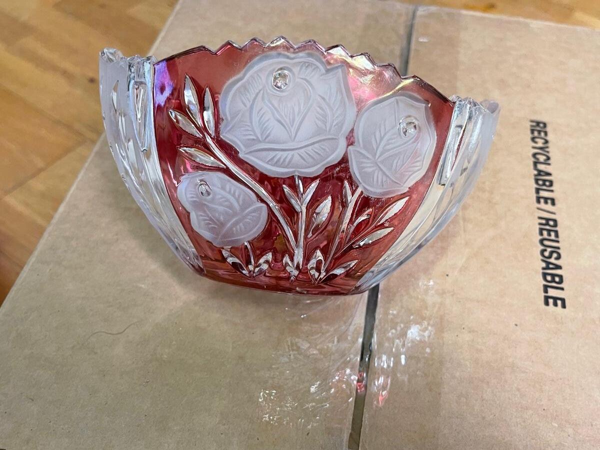 Vintage Anna Hutte Rose Design Lead Crystal 6” Bowl Ruby Red Panels Germany