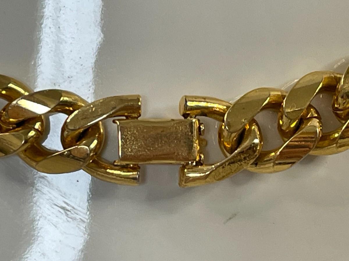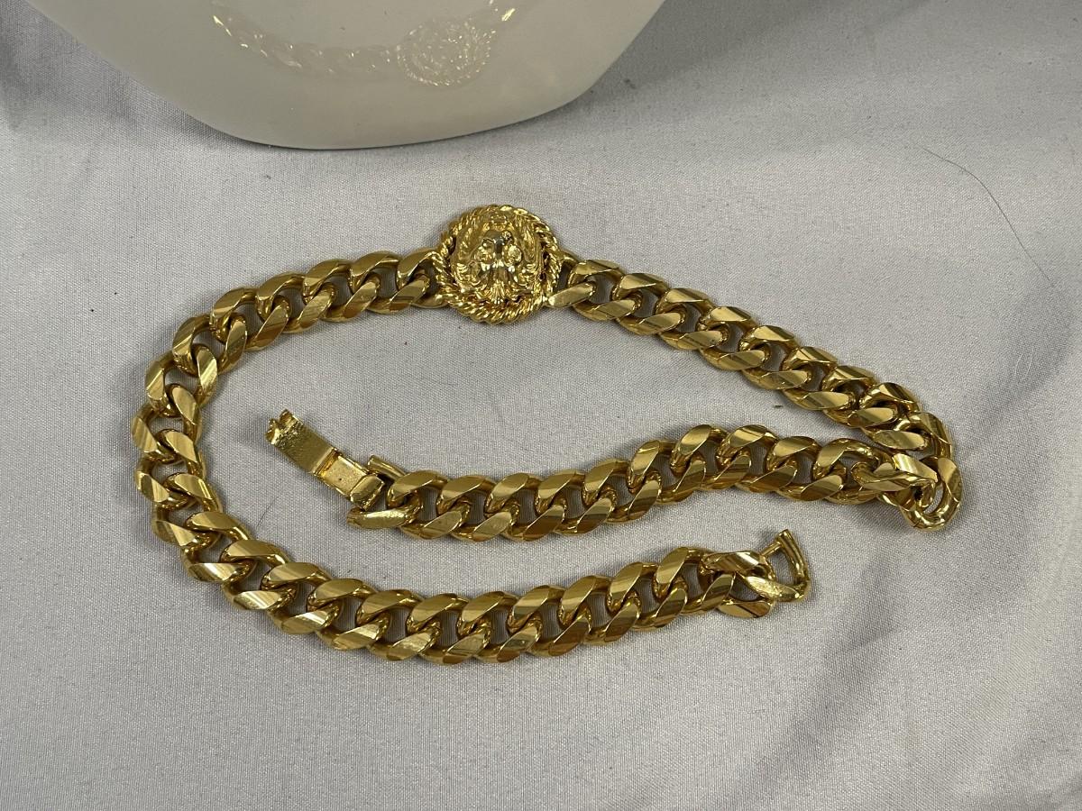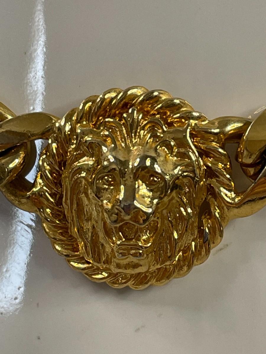 This piece is in excellent condition. It has a lions face at the front and a lions face on the clasp. It is about 16.5 inches long.