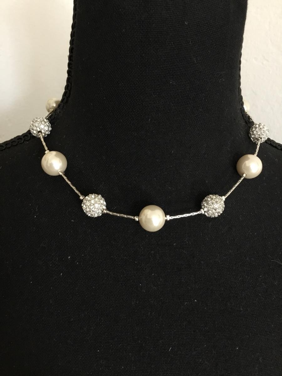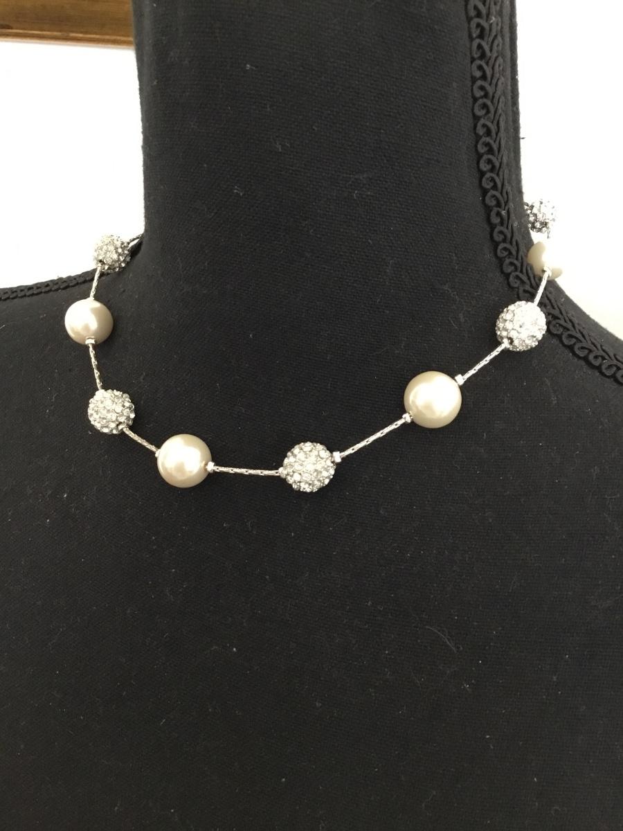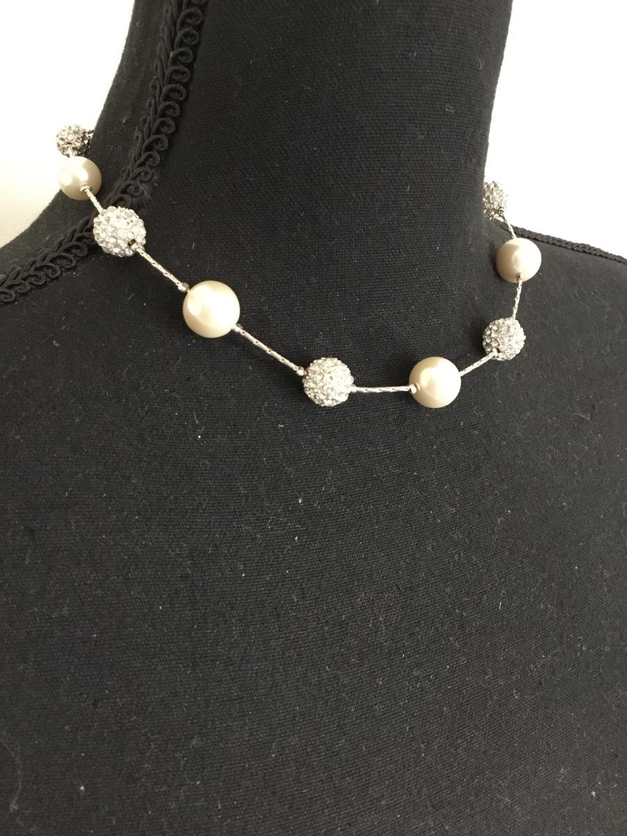 Vintage Anne Klein silver tone rhinestone ball beads with faux pearl statement necklace