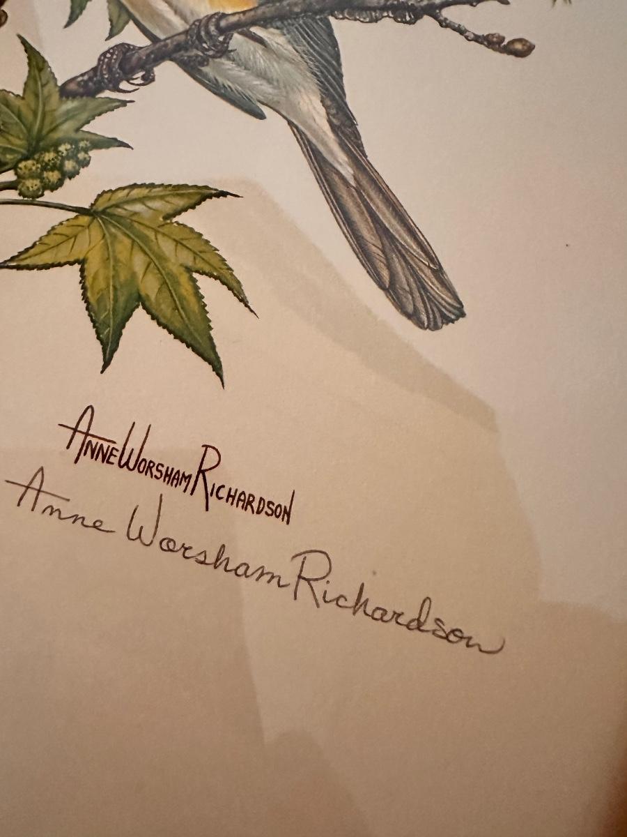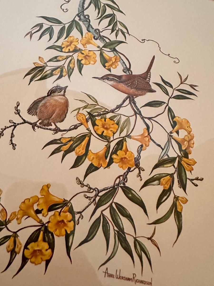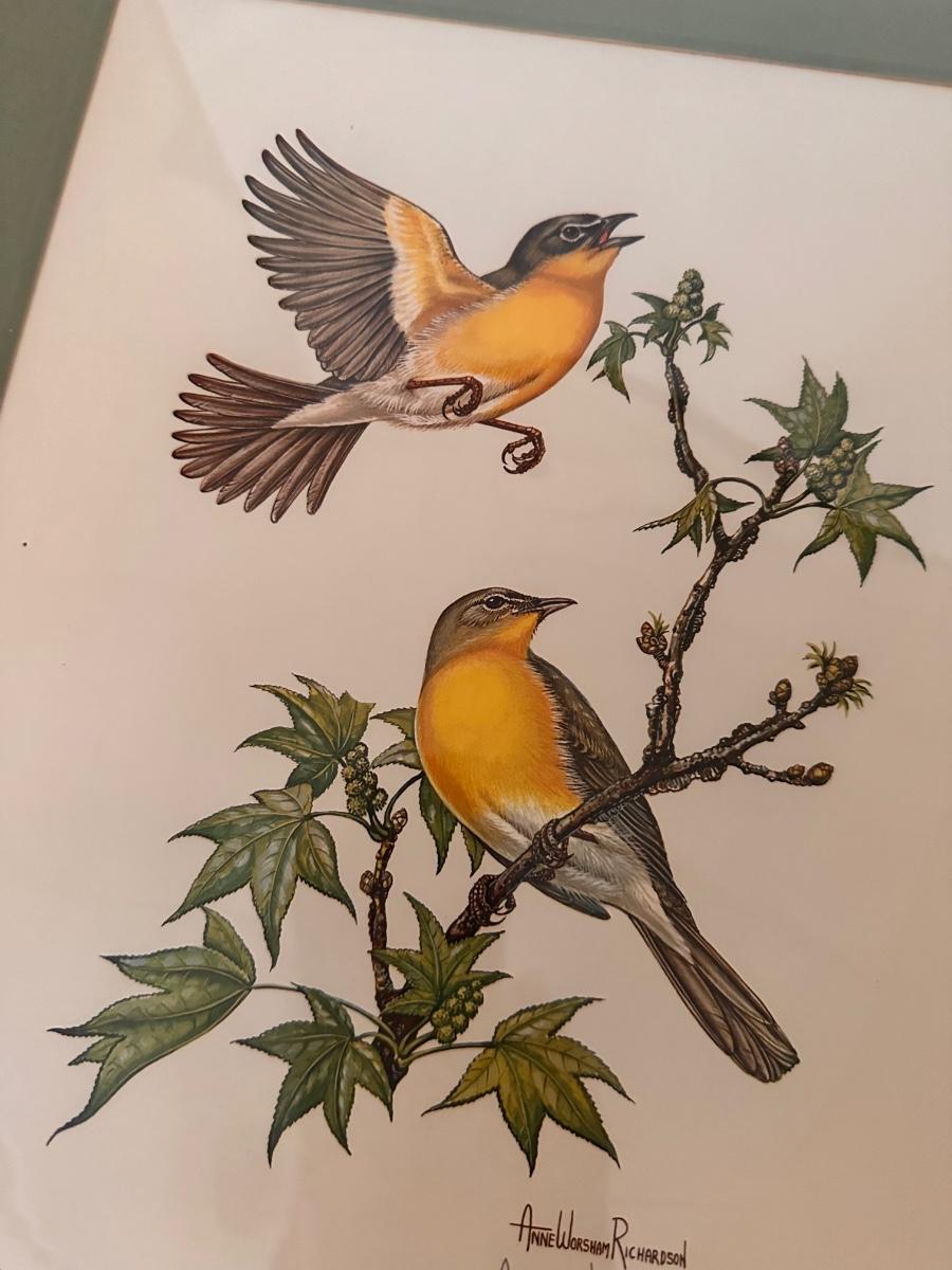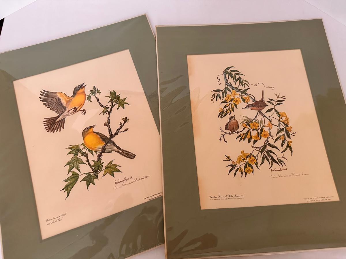 VINTAGE ANNE WORSHAM RICHARDSON UNFRAMED PRINT LOT, CAROLINA WREN, 1969 COPYRIGHT,16X20, YELLOW BREASTED CHAT WITH SWEET GUM COPYRIGHT 1974 16X20 AS PICTURED