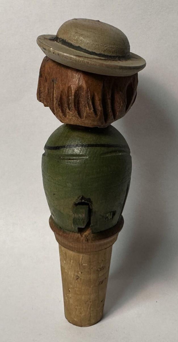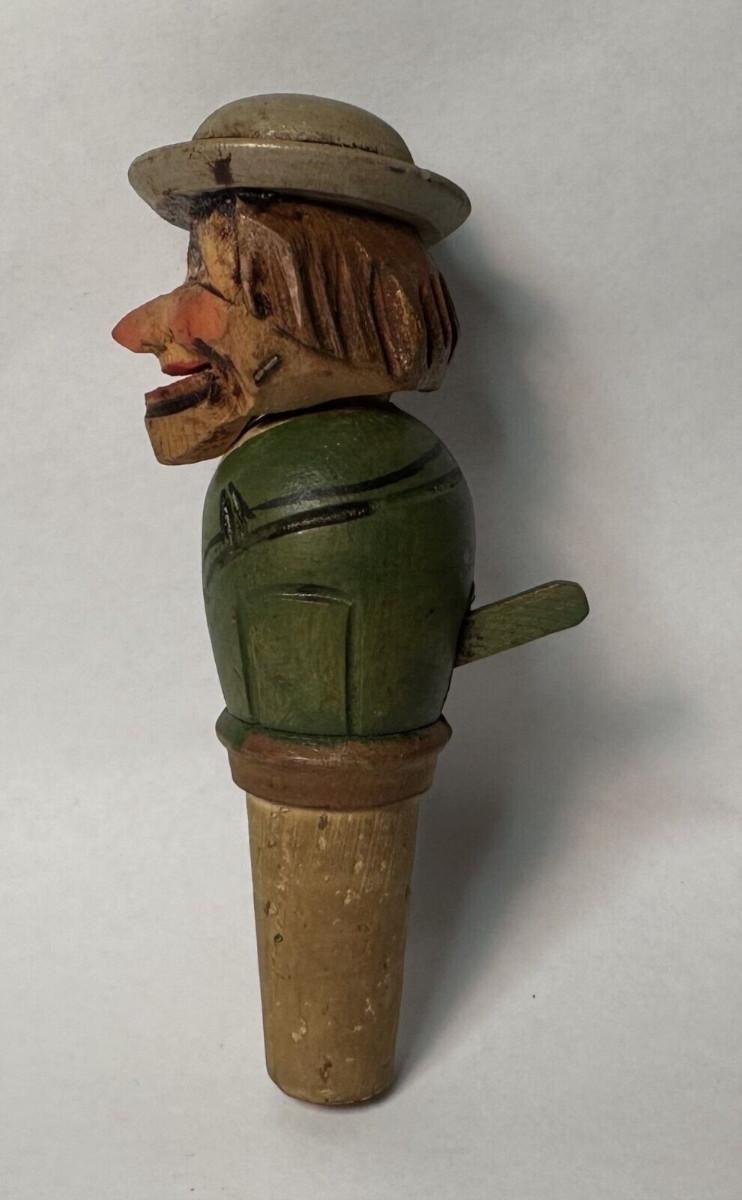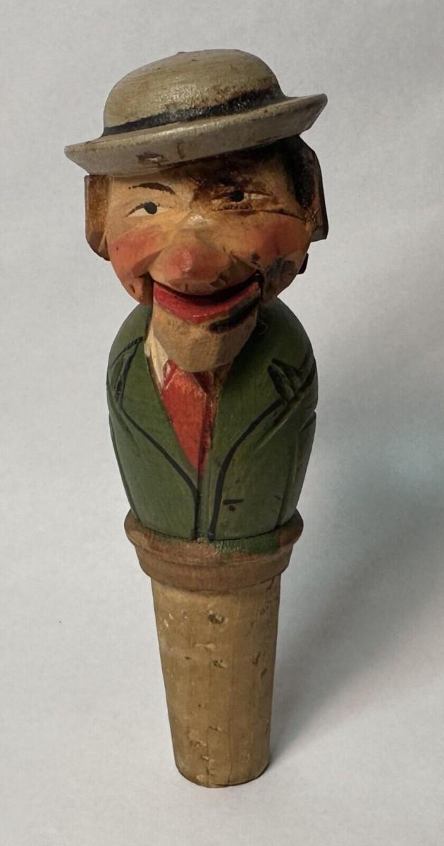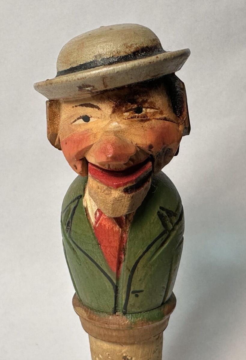 handcarved and painted figural bottle stopper made by ANRI I believe in Val Gardena, Italy...Circa 1950's on this character piece...Mechanical function on head working well...4.5"