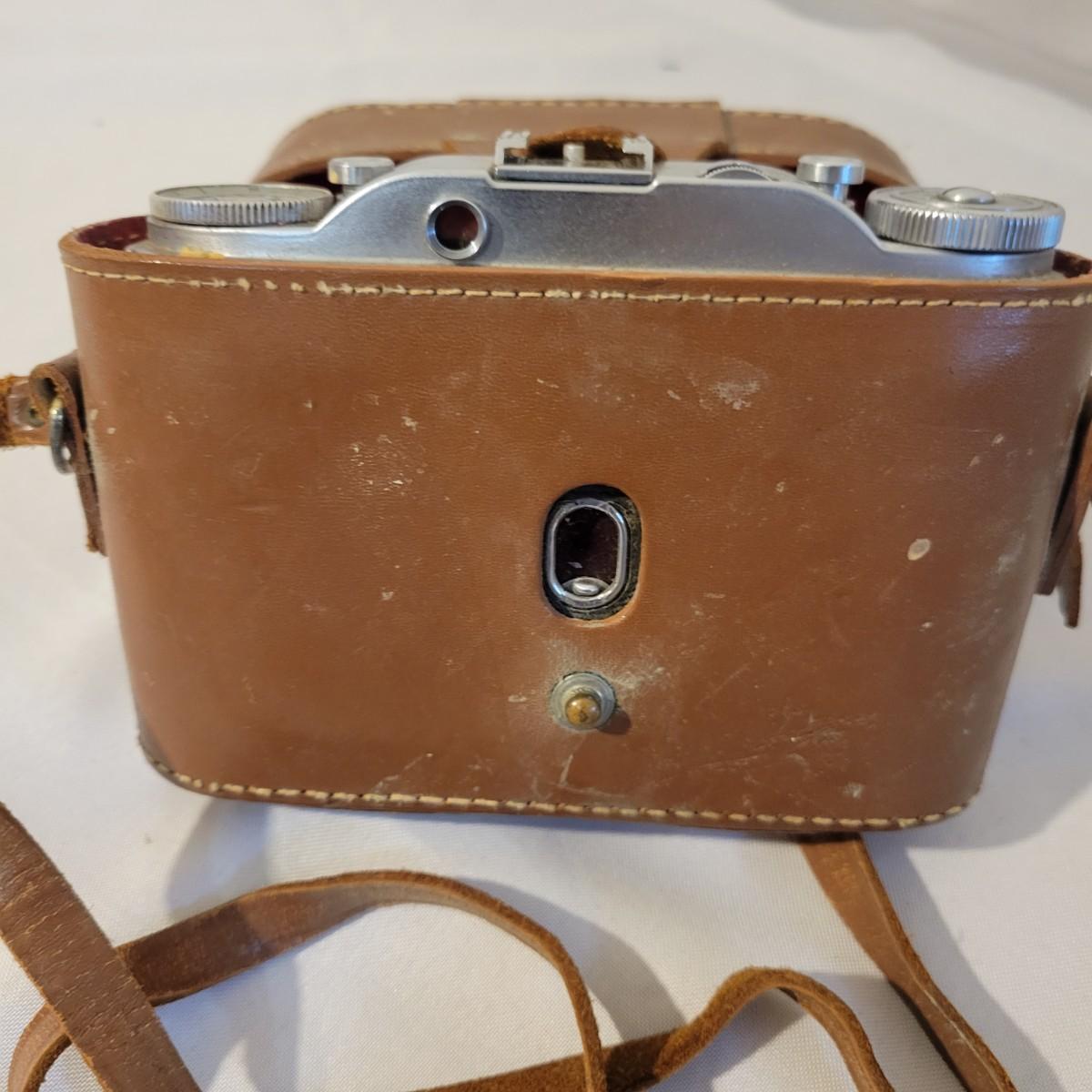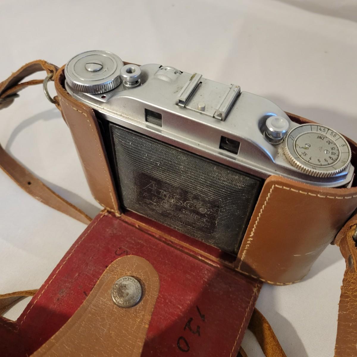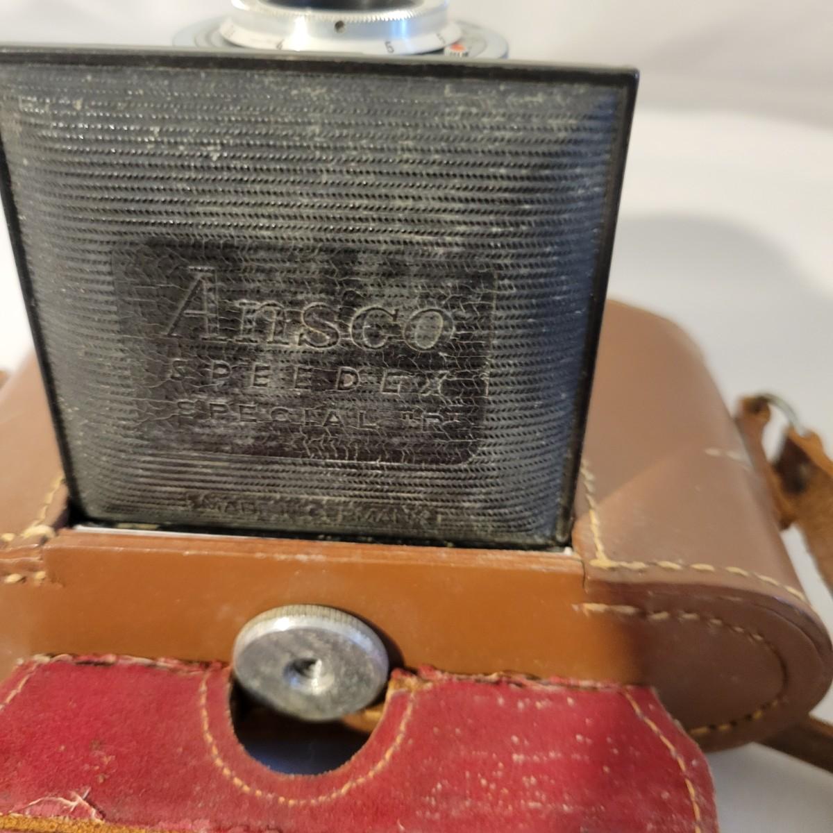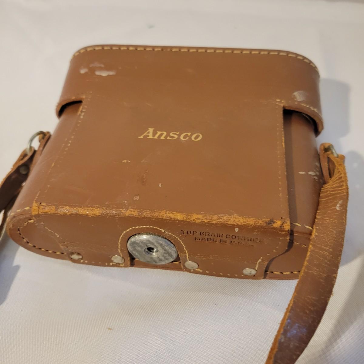A vintage Ansco camera in an attached leather case in good condition. Included is an adjustable tripod, 2 photo memory boxes and a package of lens cleaning wipes. Tripod is 34.5" long and expands to 61" with legs extended. Shipping available