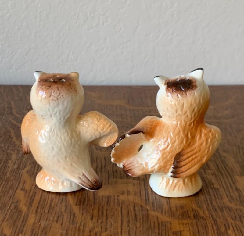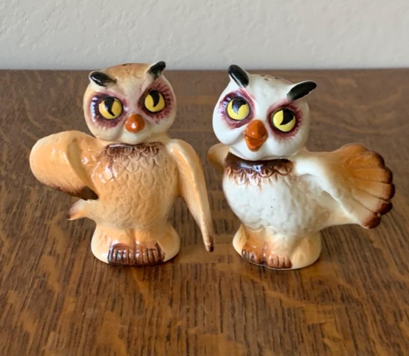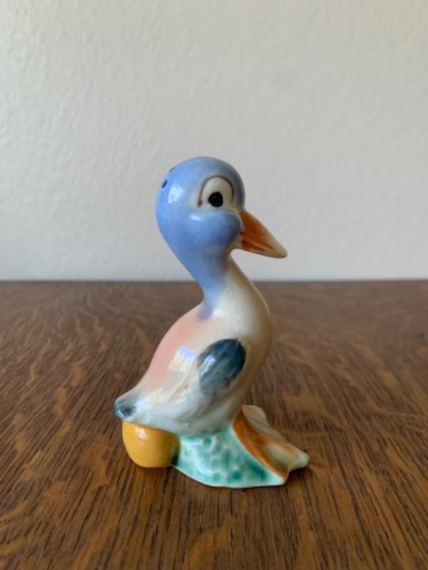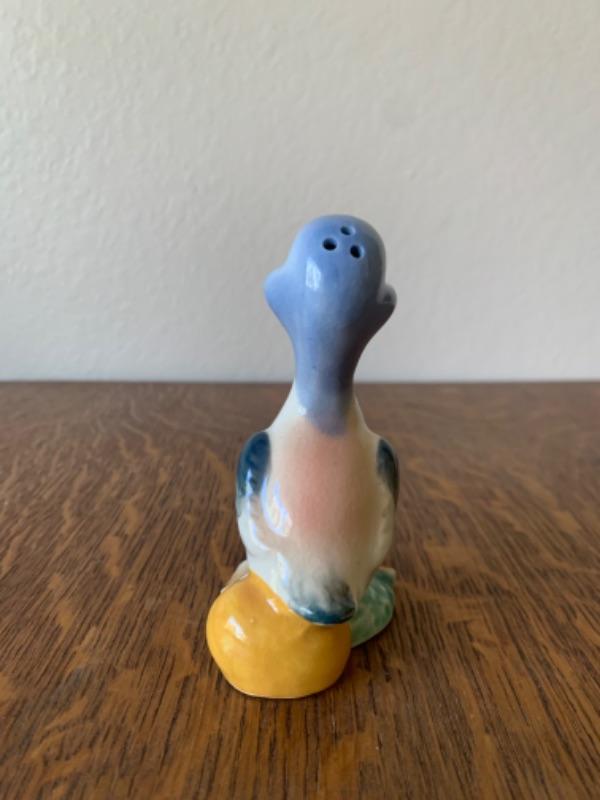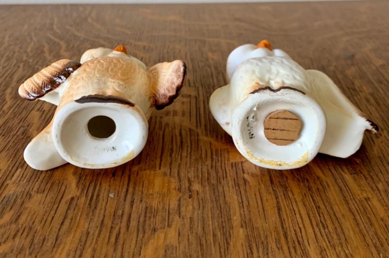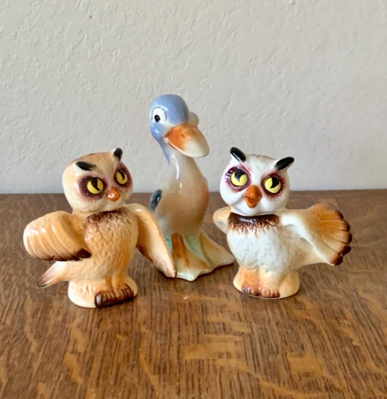 Vintage Anthropomorphic salt and pepper shakers. Pair of brown owls, measures 3 1/4”. No crazing, chips or repairs noted. Missing one cork. Single duck, 4 1/4”, with cork. No chips, cracks or repairs noted, light crazing. Total 3 pcs. All made in Japan.