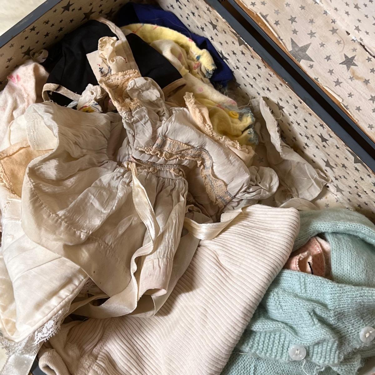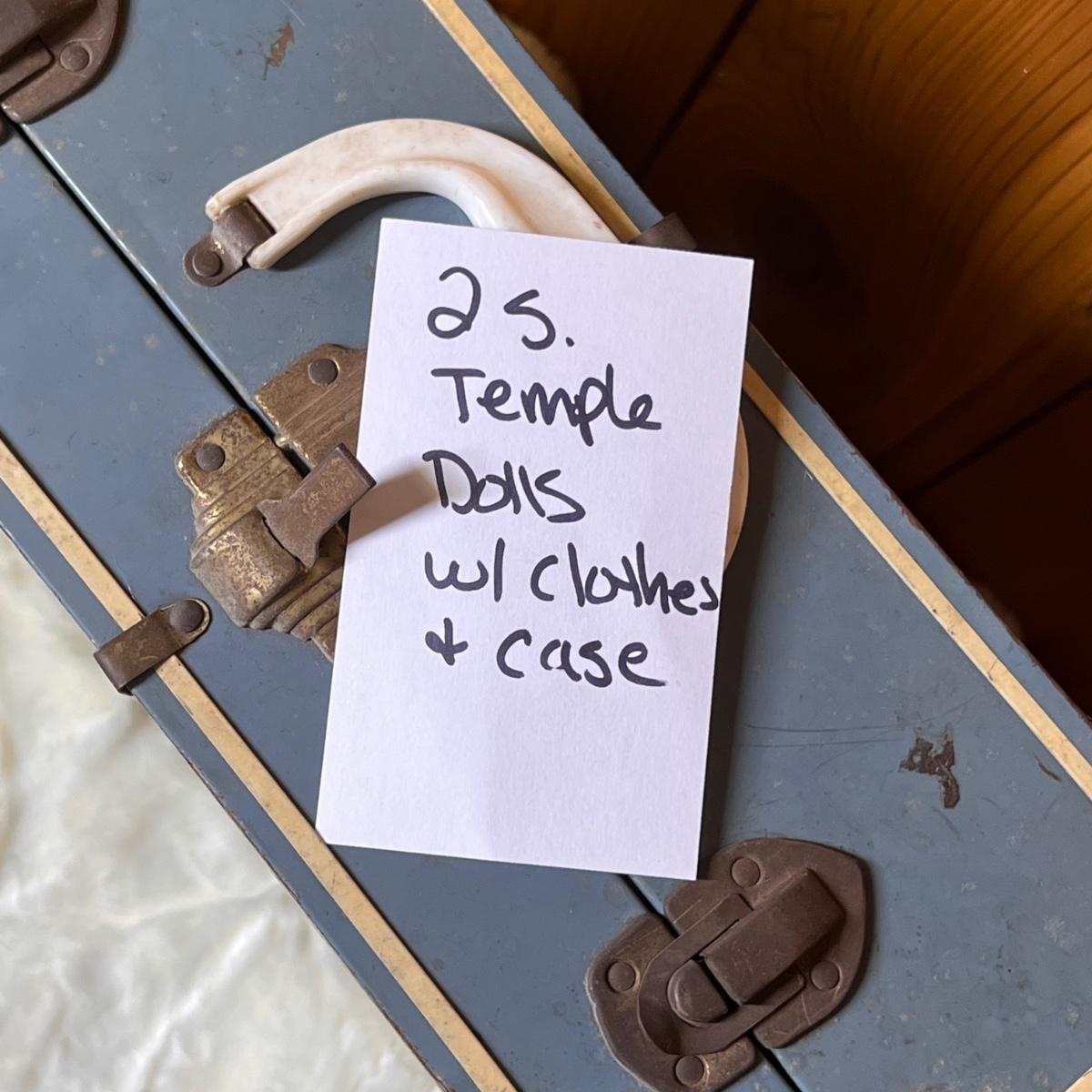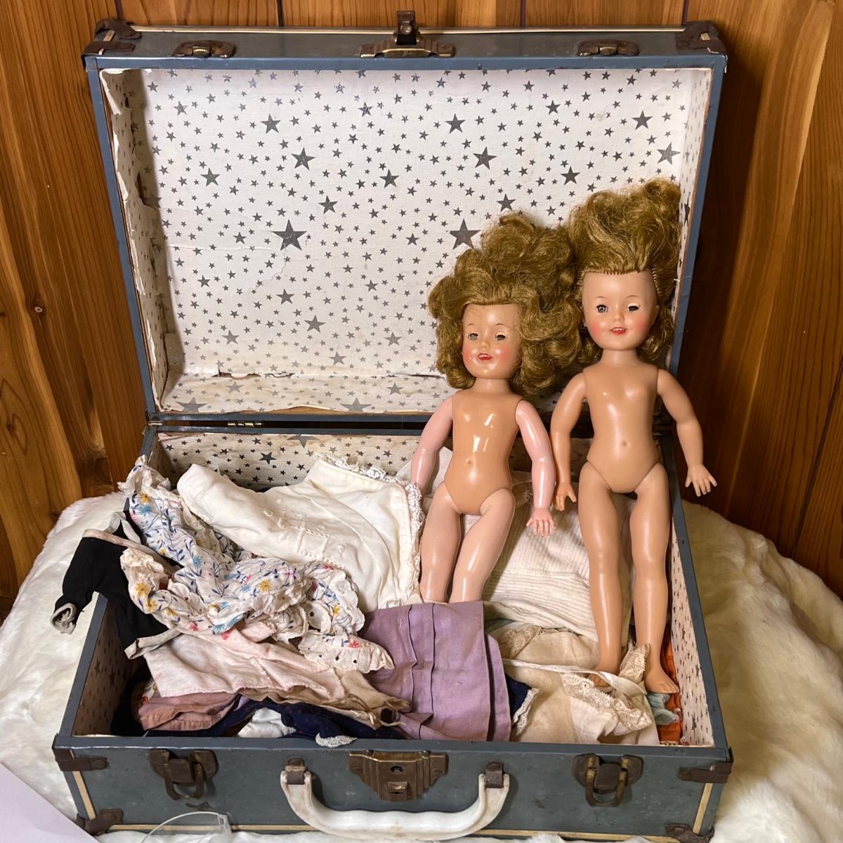 Metal box with 2 shirly temple dolls. Mixes lot of doll clothes. Dolls are stamped on neck and back