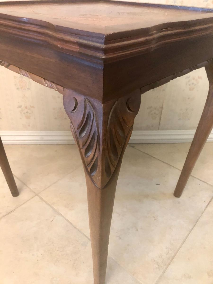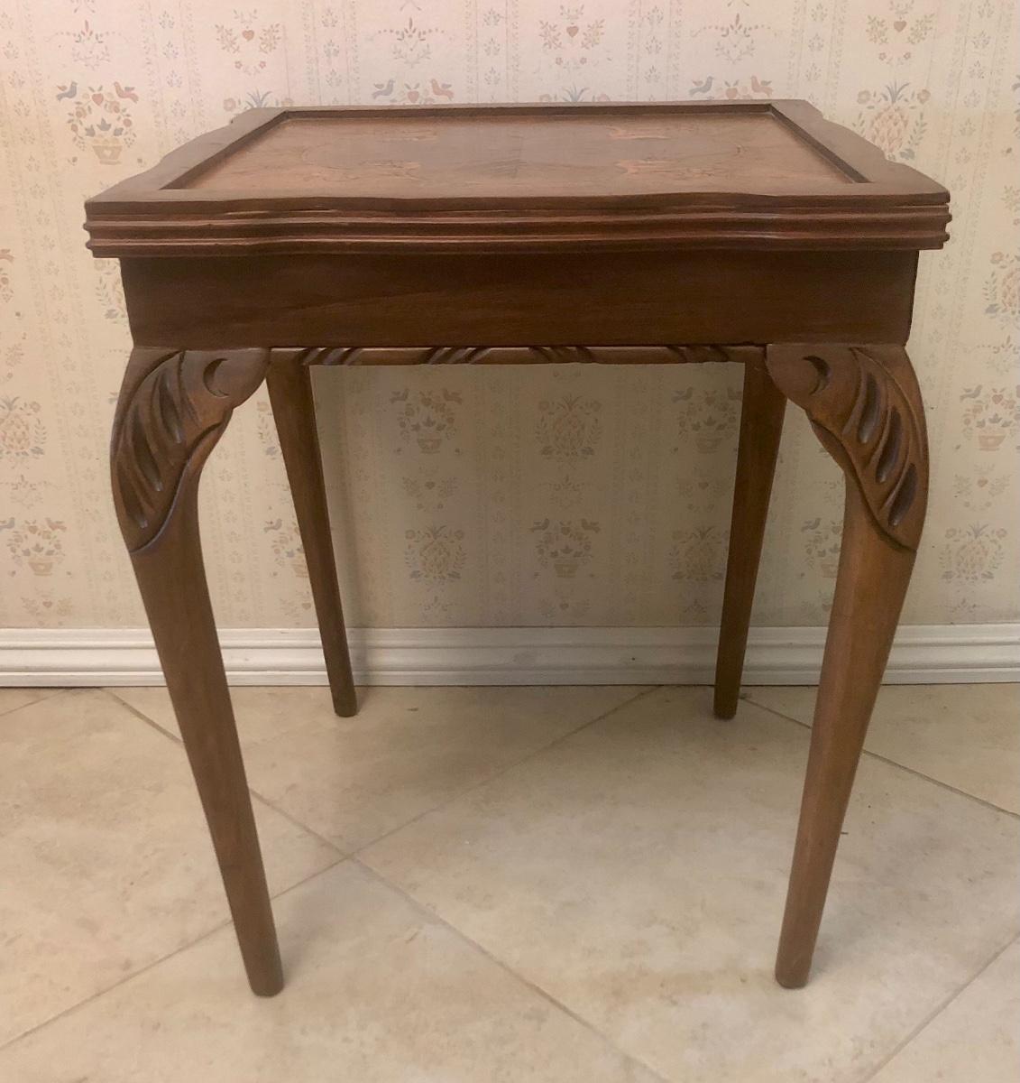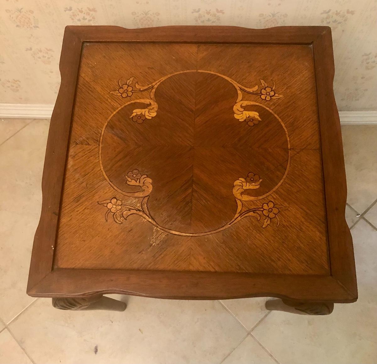 Inlaid floral design on top. Carved legs and side details. Approx. 23” tall, 18” x 18” tabletop.
