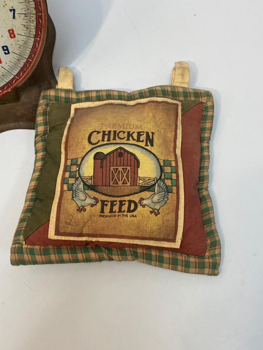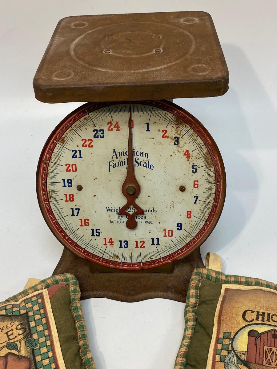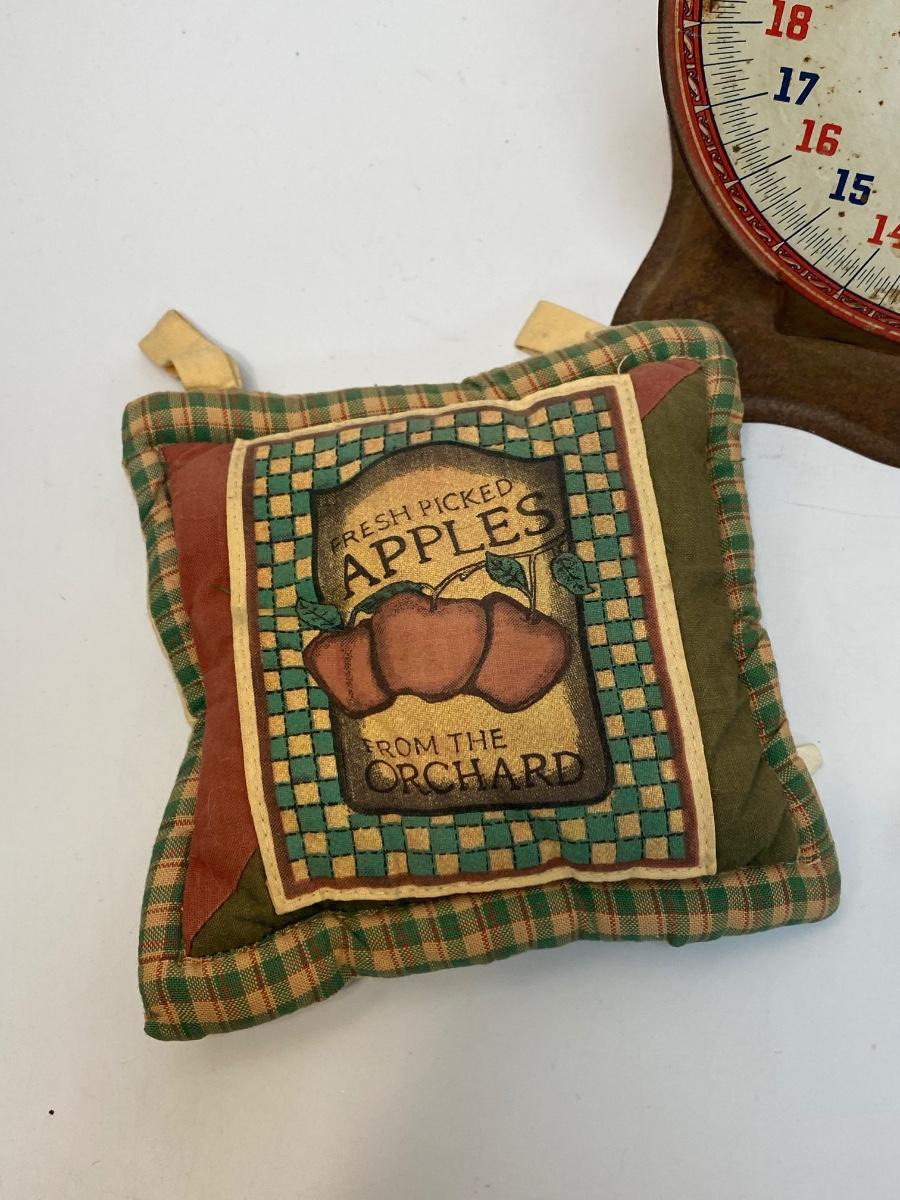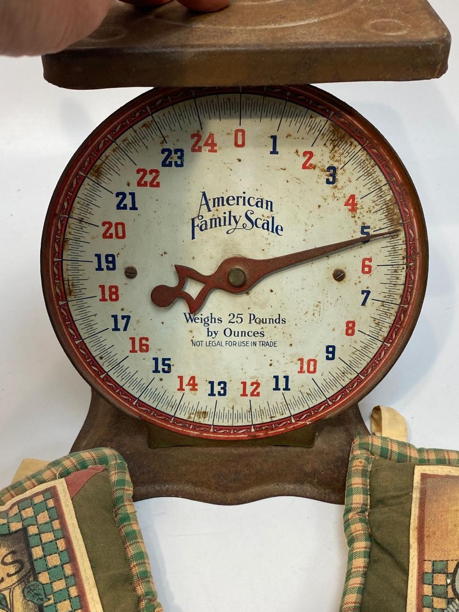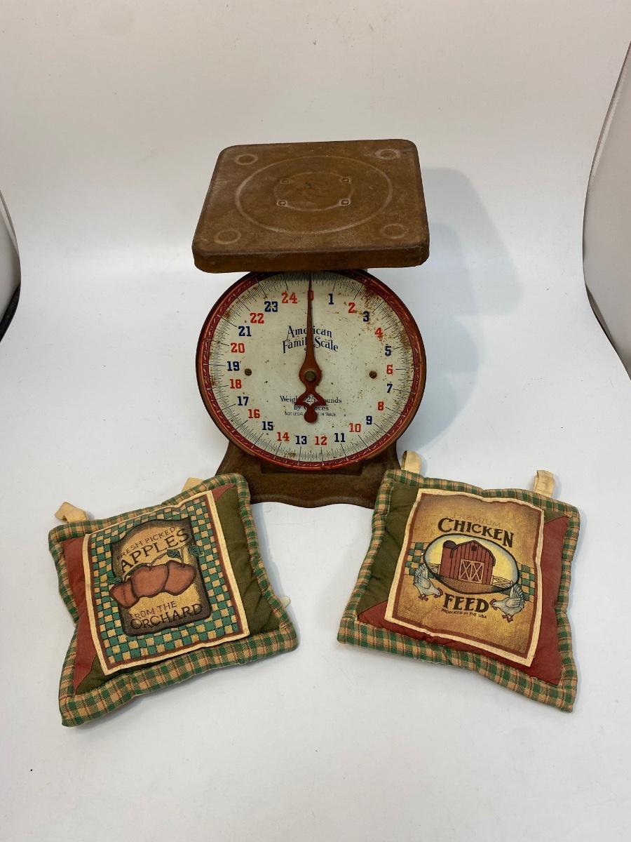 Vintage Antique American Family Metal Food Scale & Kitchen Decor. Scale is rusty but displays nicely. The potholders can be used as trivets or decor.