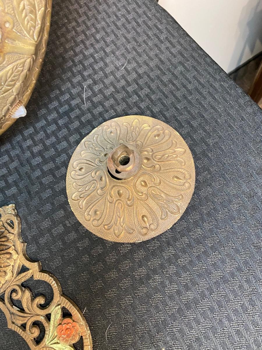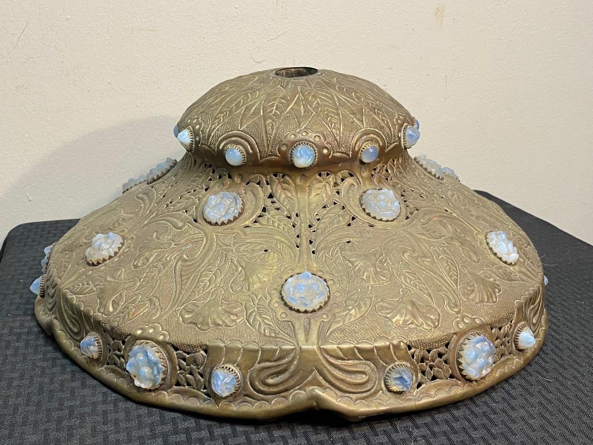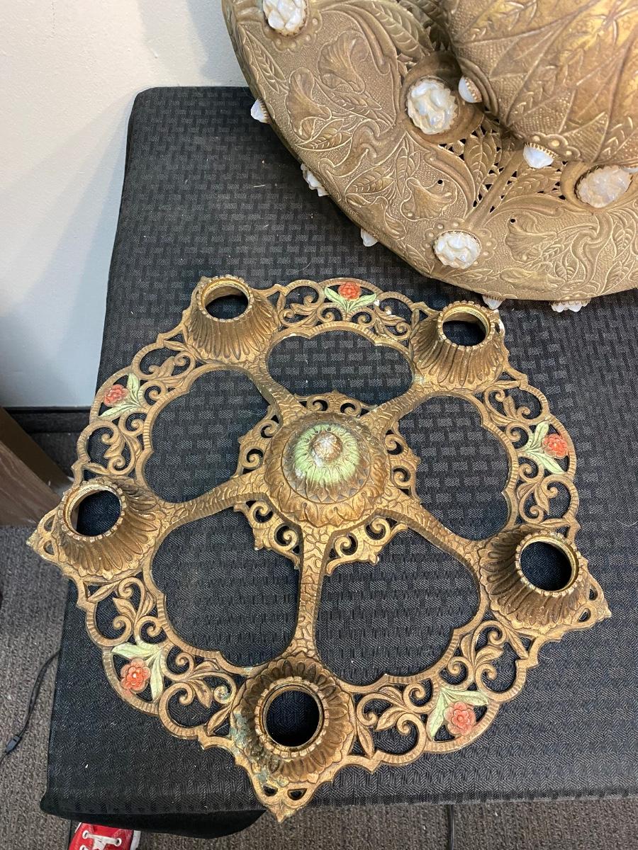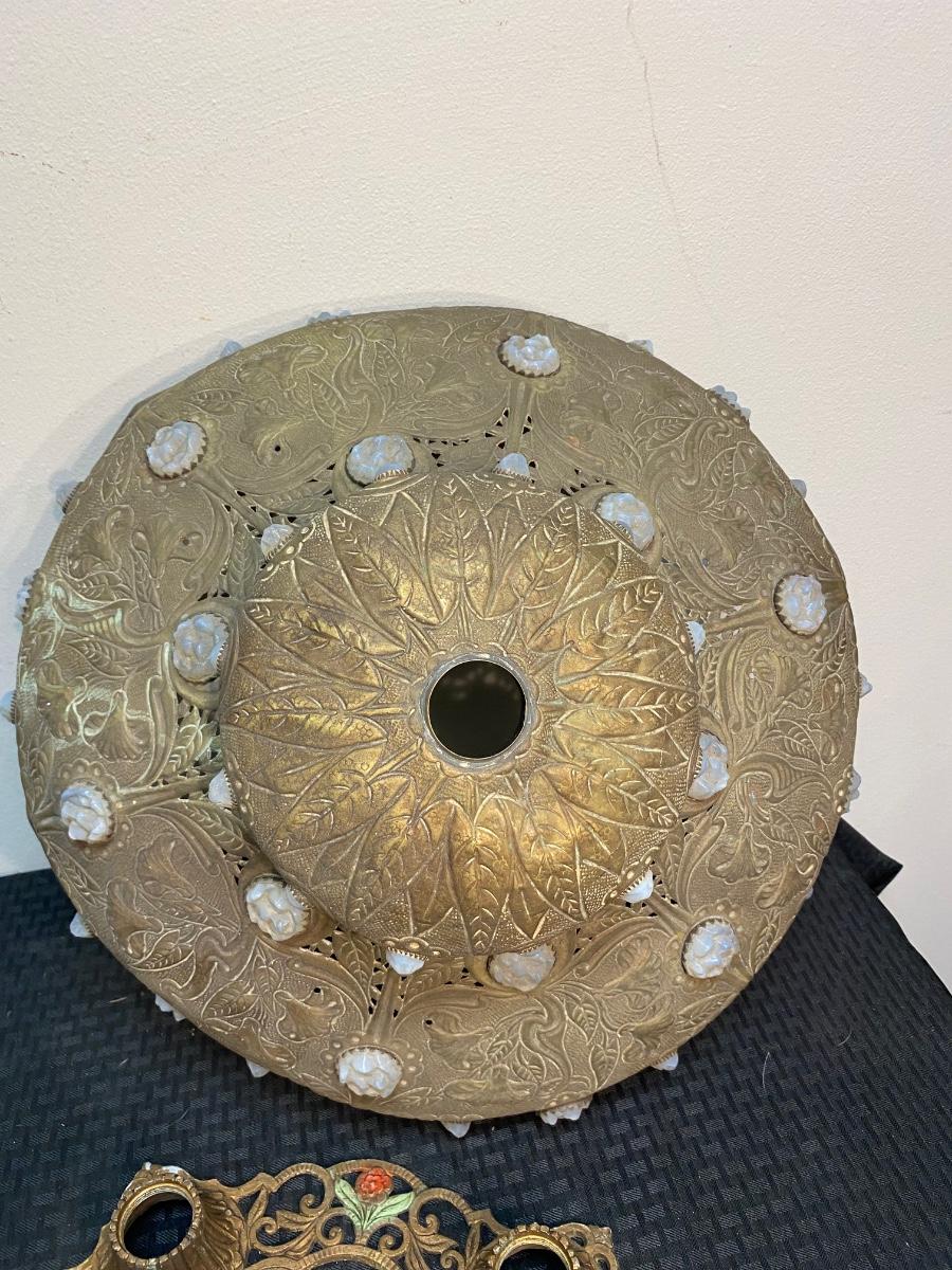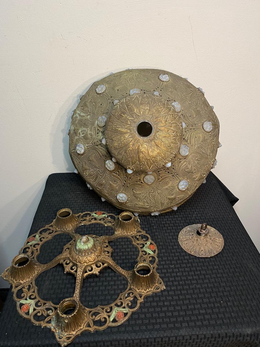 Interesting antique brass lamp parts. Lamp shade is a highly detailed stamped shade with opaque iridescent glass accents. Brass ring looks like it might be part of a hanging fixture and has a floral design. Third piece is a ceiling medallion piece. Not sure if you could make all the piece go together but there is great potential for some great time period lighting. Shade is a little out of shape. See photos.