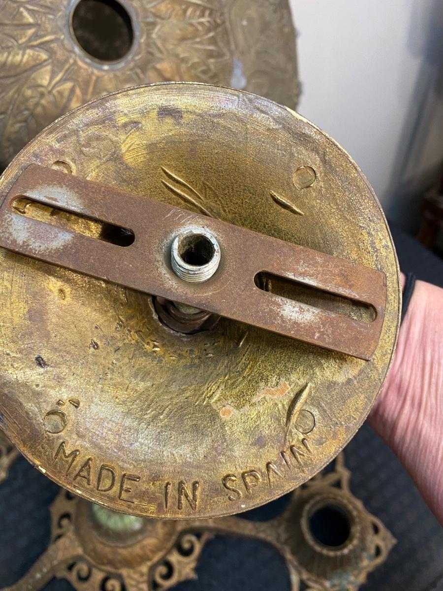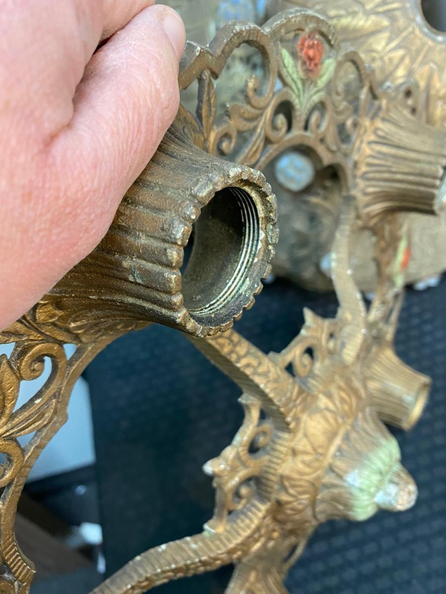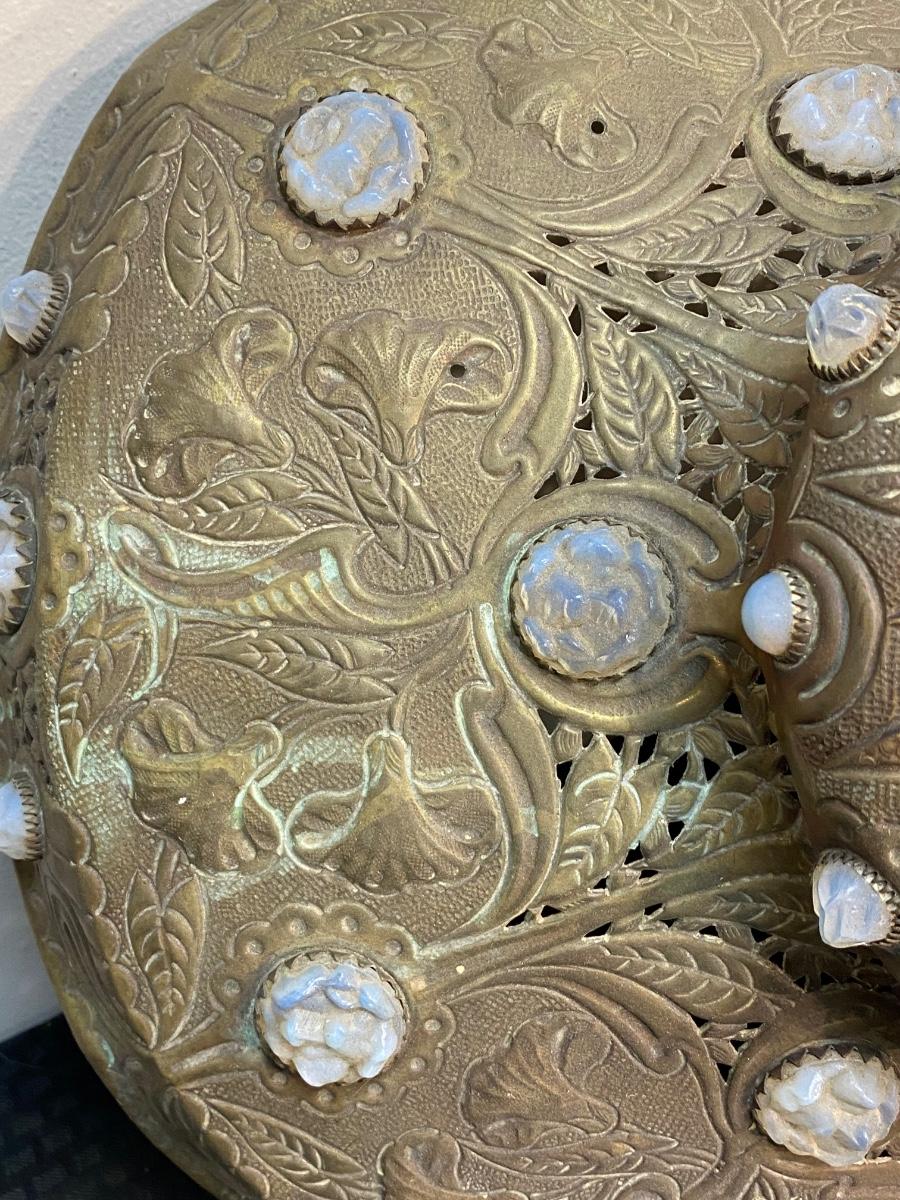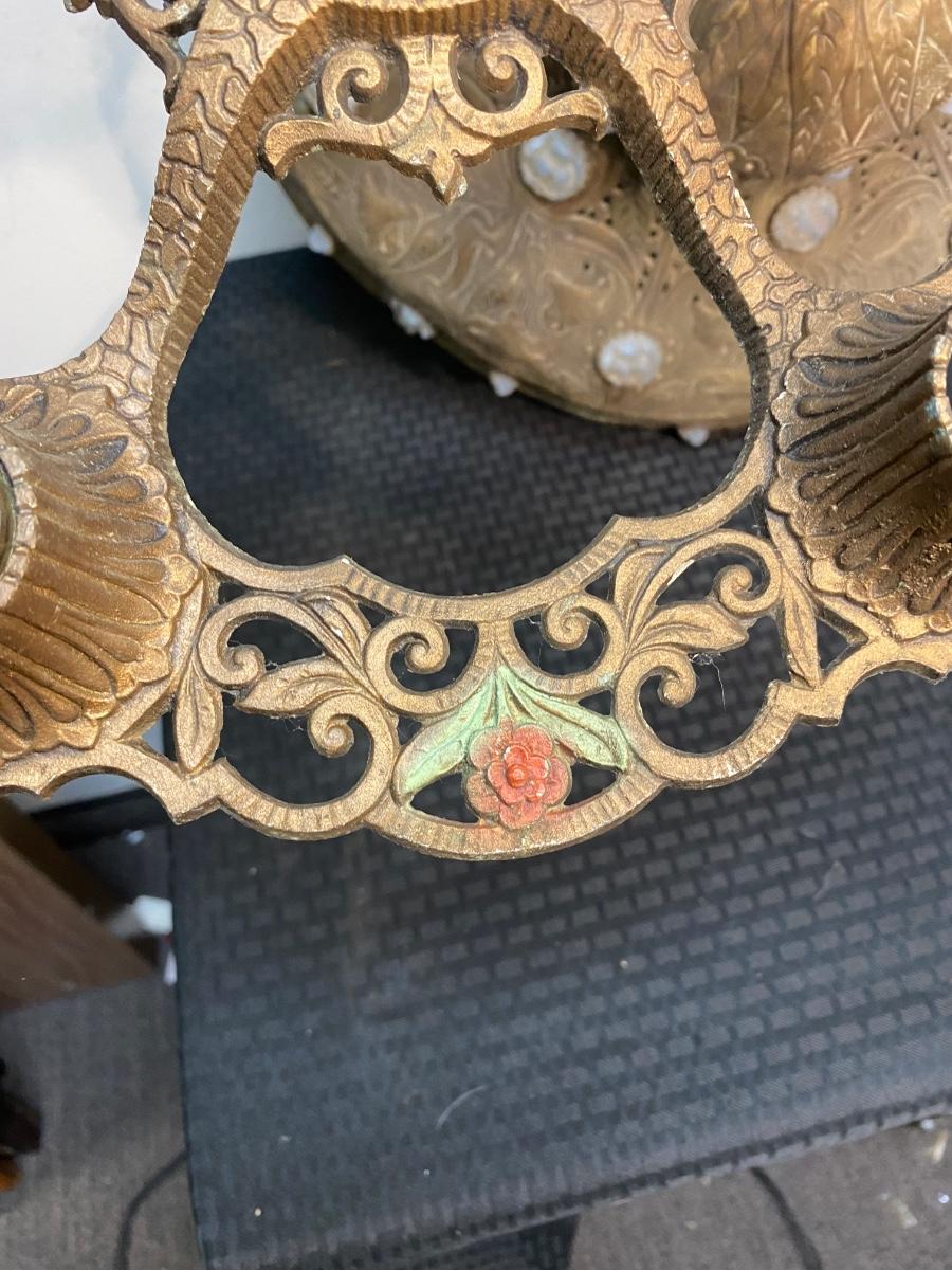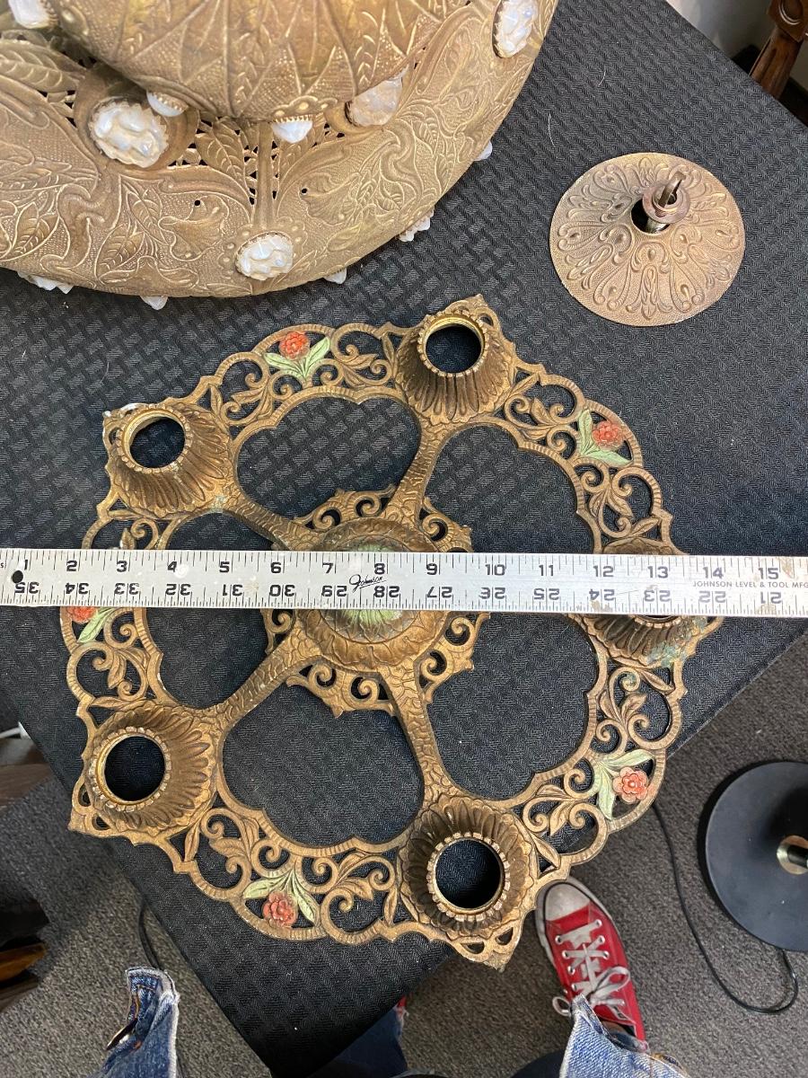 Interesting antique brass lamp parts. Lamp shade is a highly detailed stamped shade with opaque iridescent glass accents. Brass ring looks like it might be part of a hanging fixture and has a floral design. Third piece is a ceiling medallion piece. Not sure if you could make all the piece go together but there is great potential for some great time period lighting. Shade is a little out of shape. See photos.