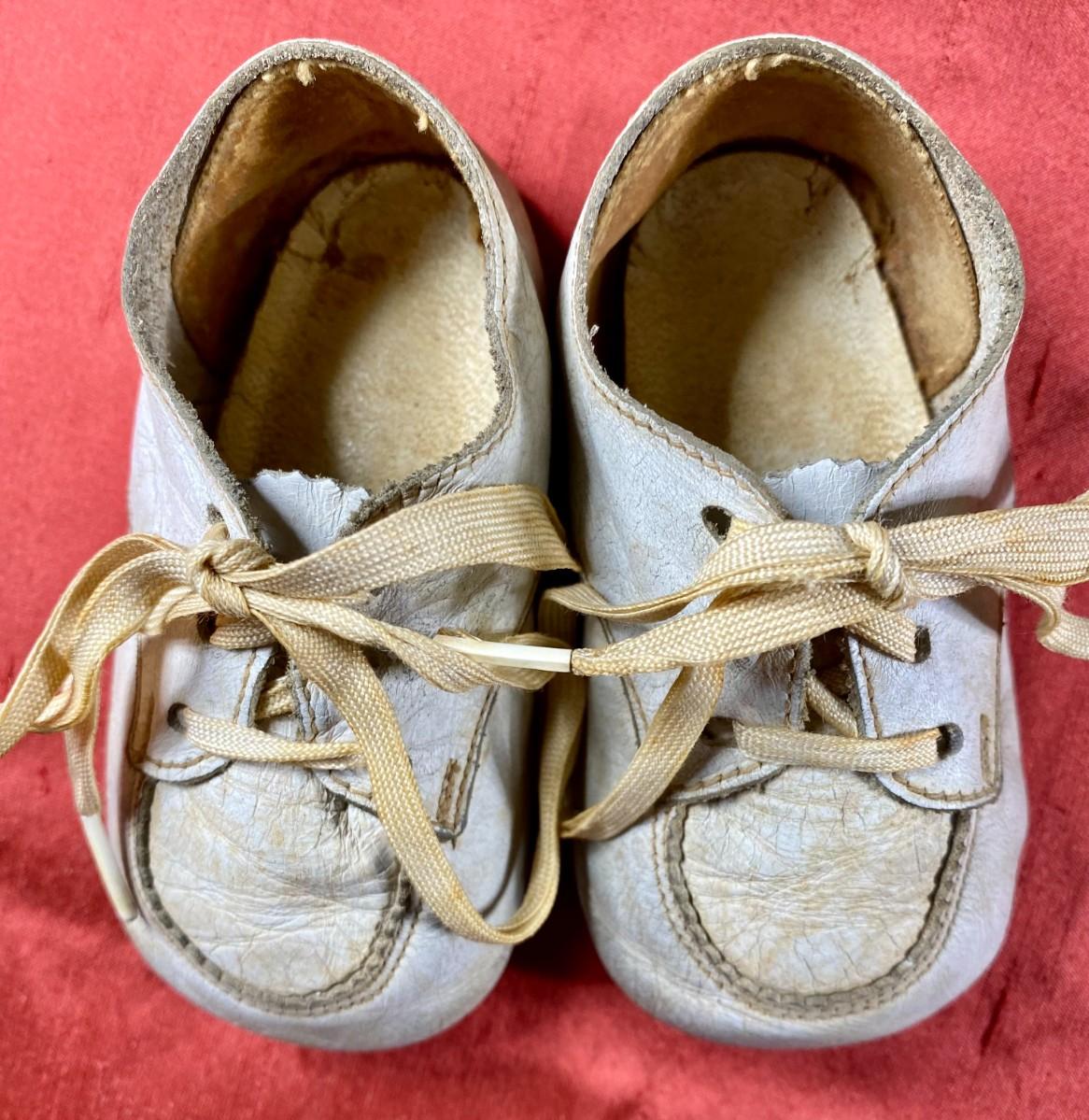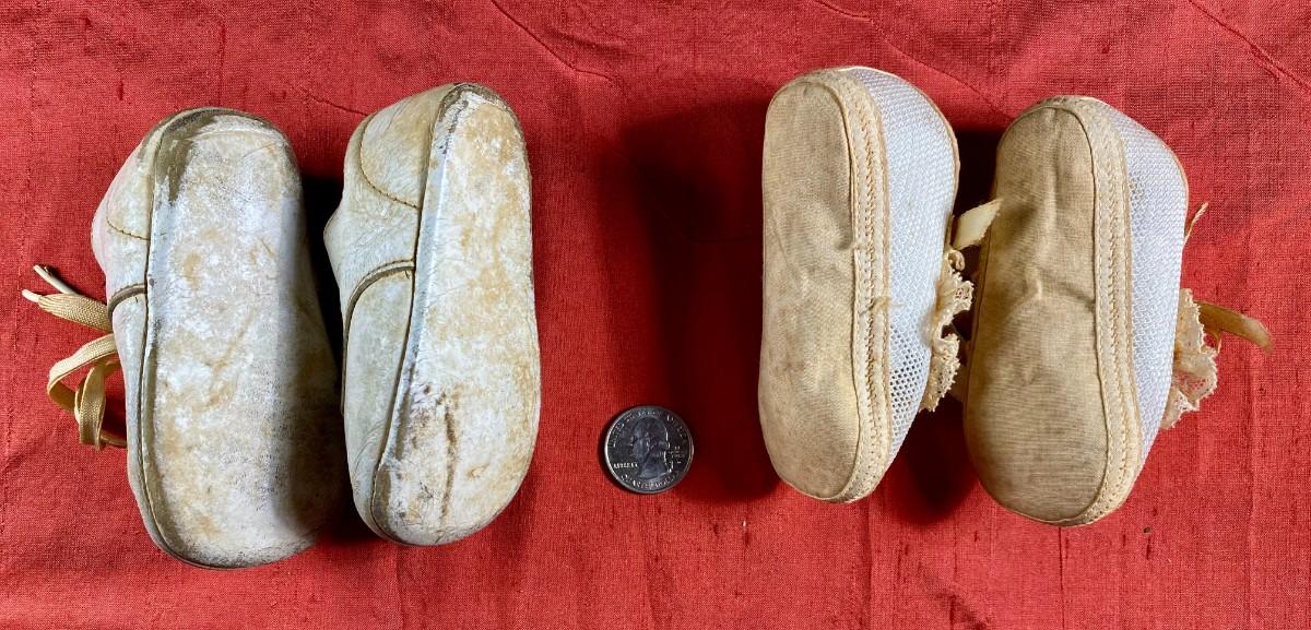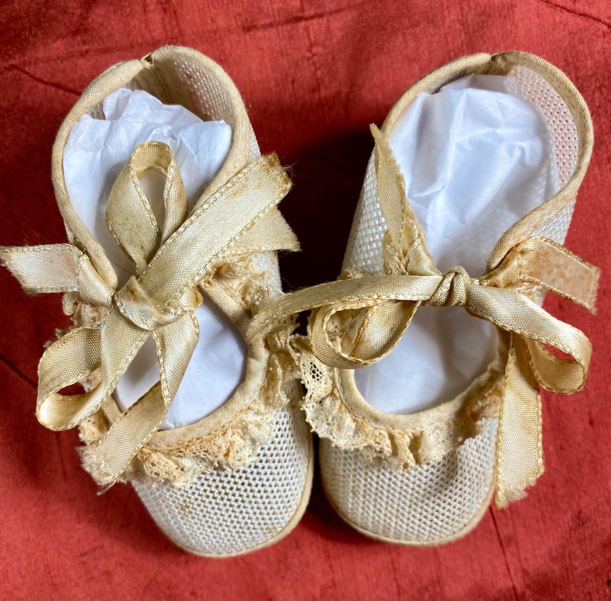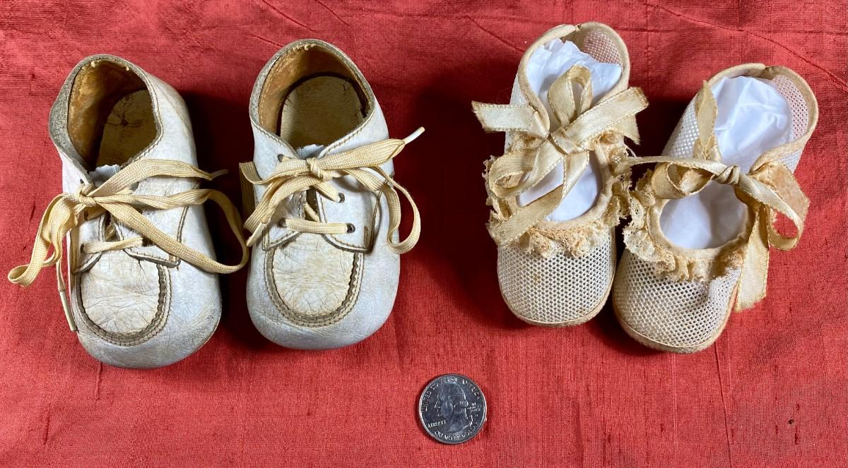 This auction lot is for Vintage/Antique Baby Shoes - 2 Pairs. First pair is mesh with lacing and measures about 4-inches long and 1-1/2 inch wide. The second pair are white leather walking shoes and measure about 4-inches long and - inches. Both pair condition are consistent with age and use. And are cute as buttons.