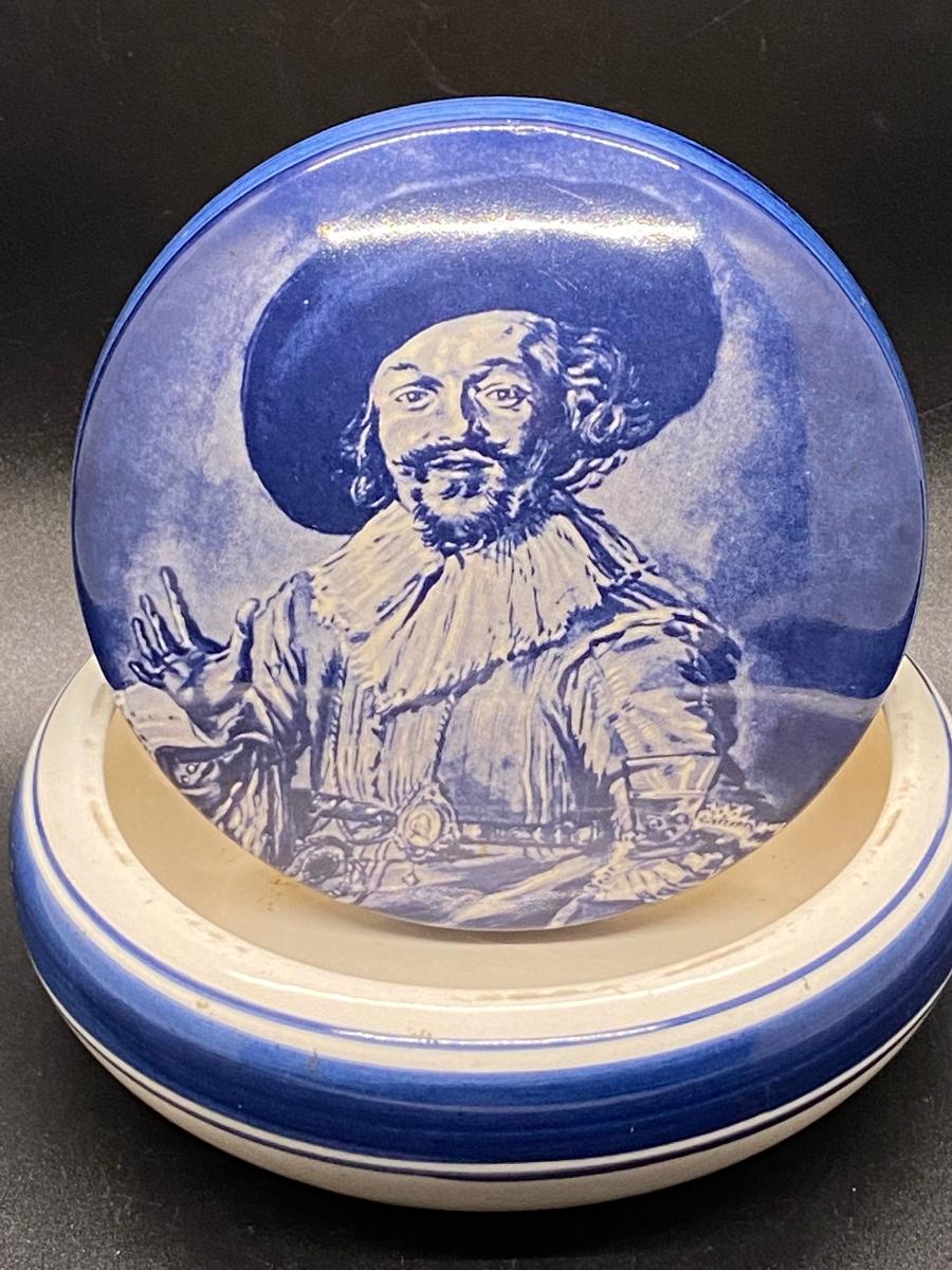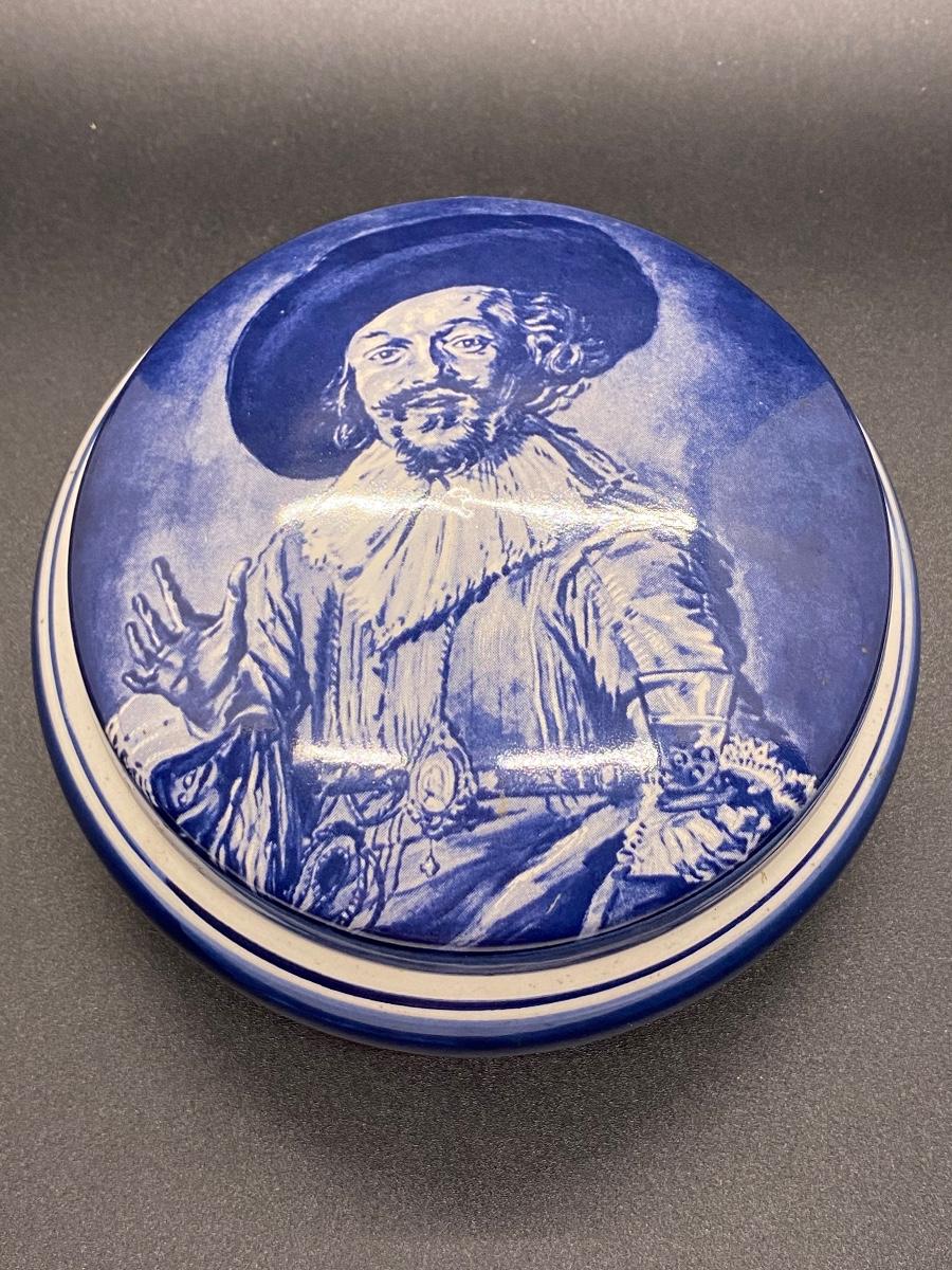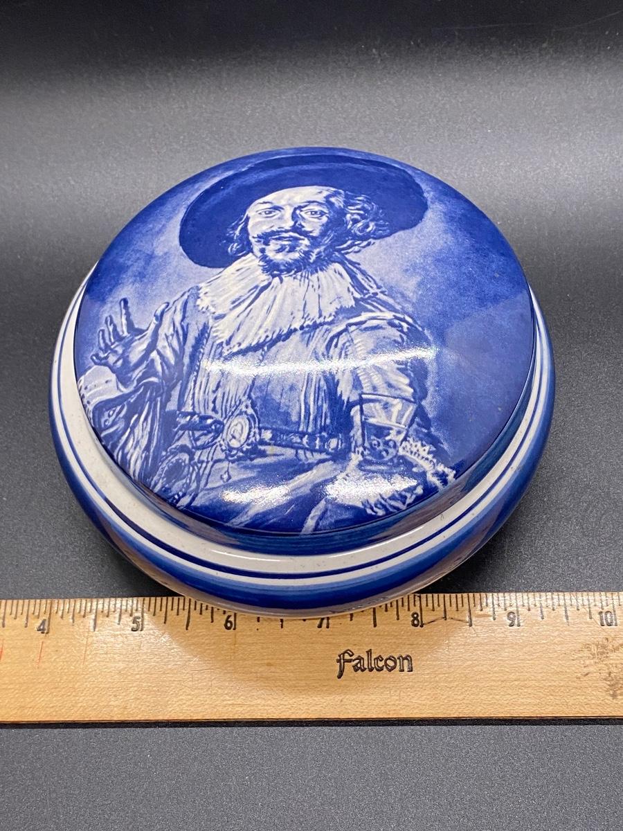Vintage blue delfts trinket dish. Hand painted in Holland. Round dish features a man on the lid. In good condition, no chips. About 6" size.
