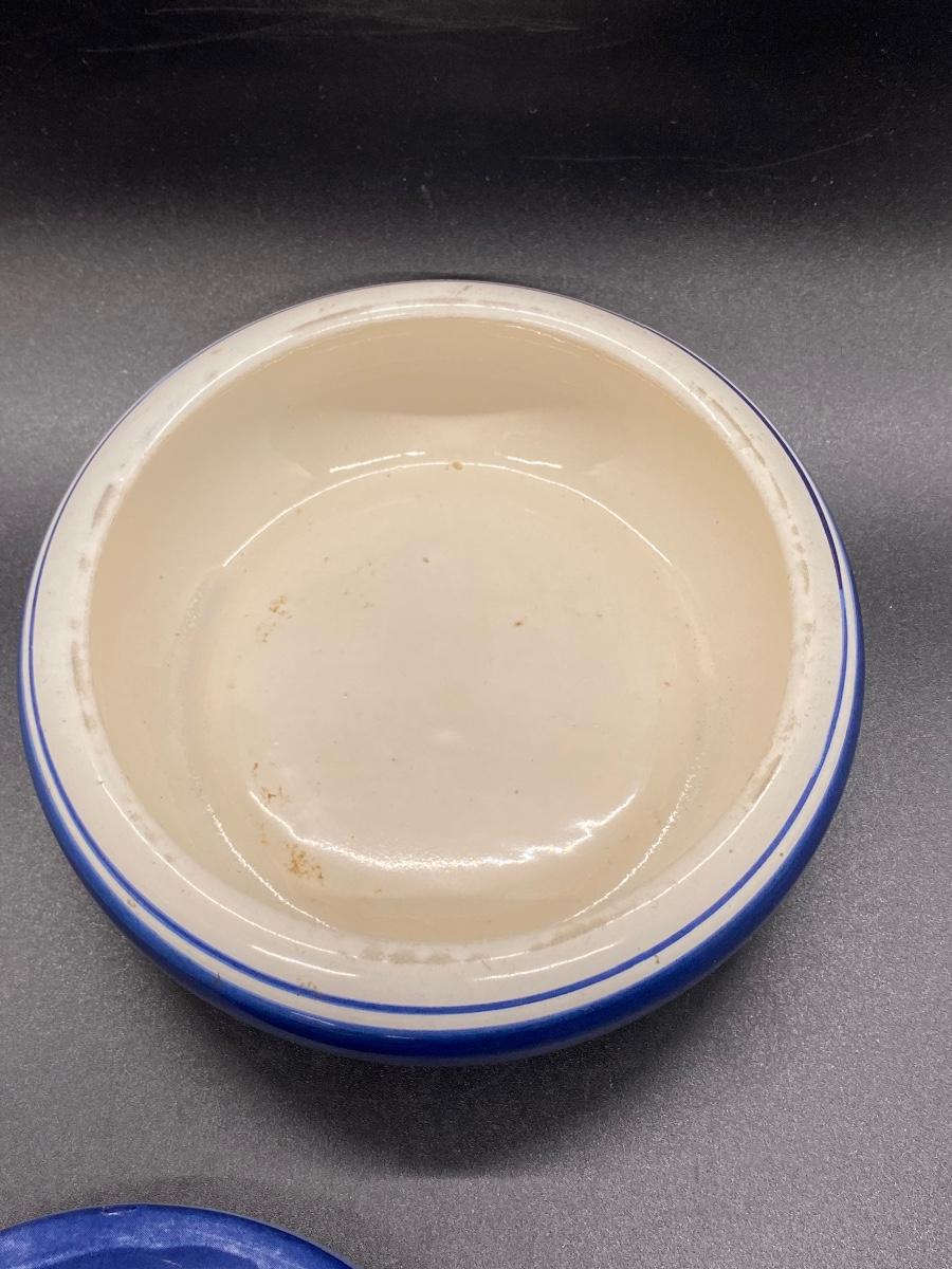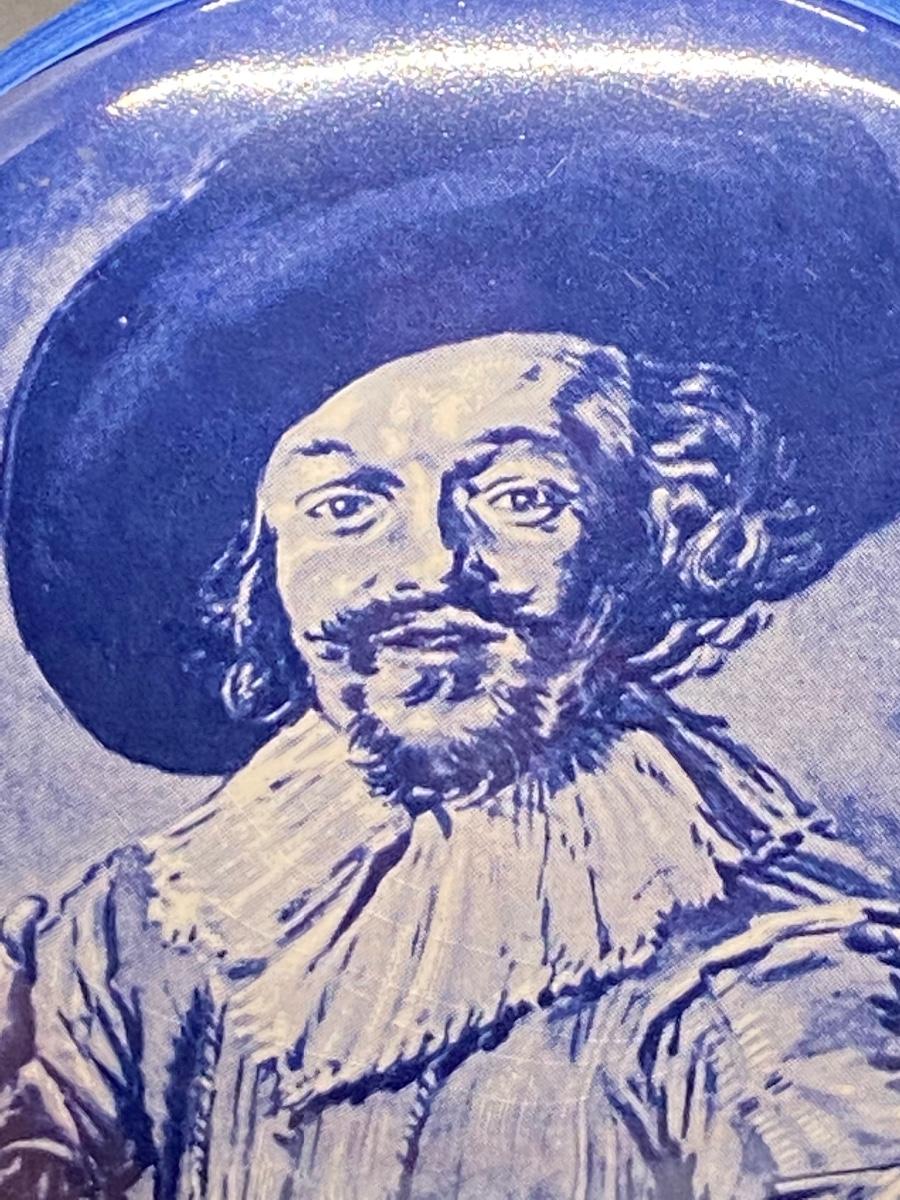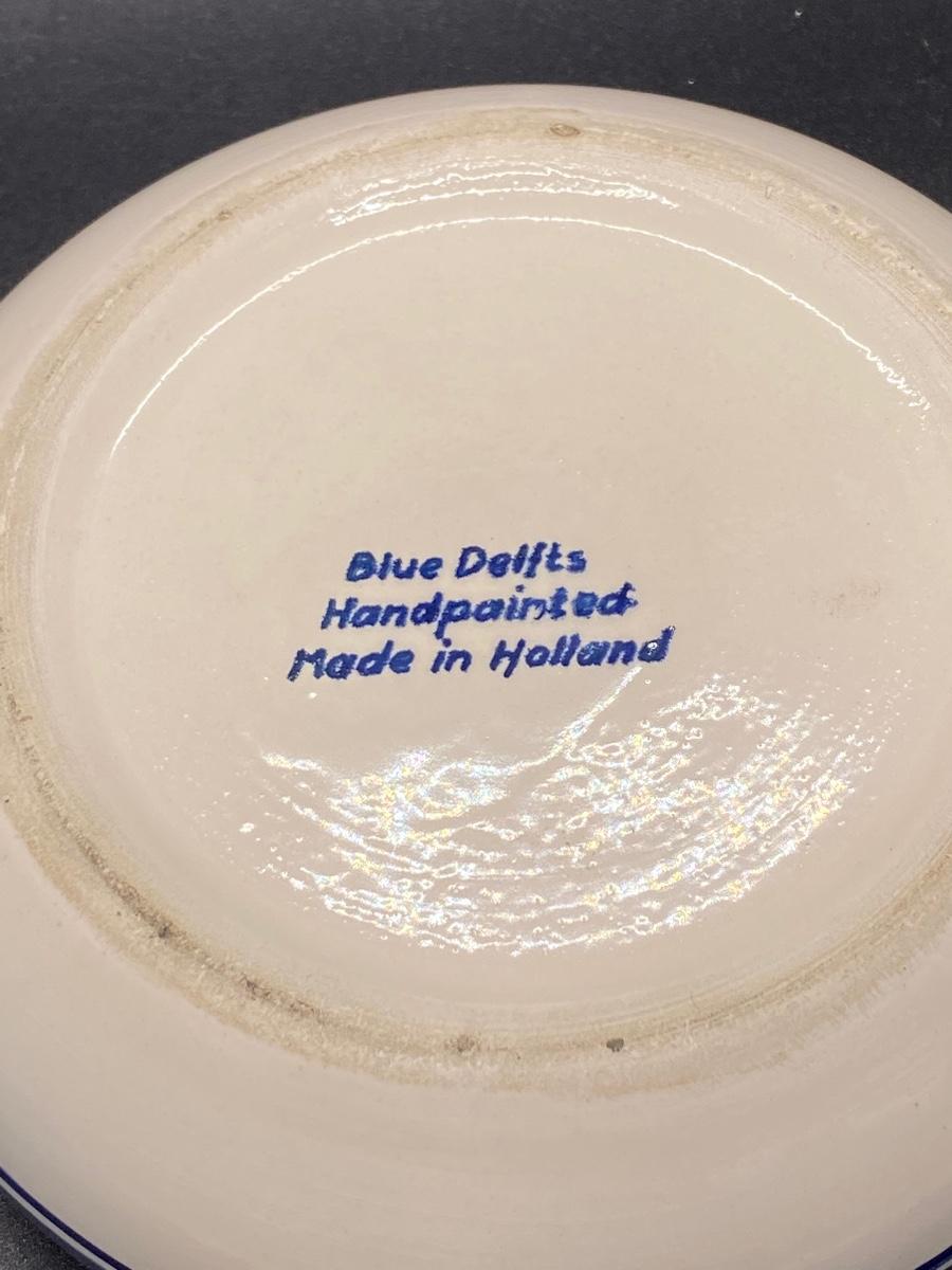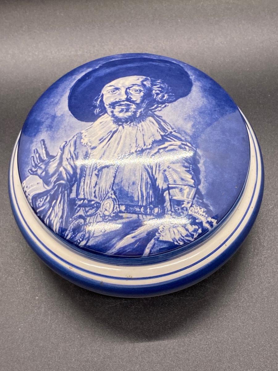Vintage blue delfts trinket dish. Hand painted in Holland. Round dish features a man on the lid. In good condition, no chips. About 6" size.