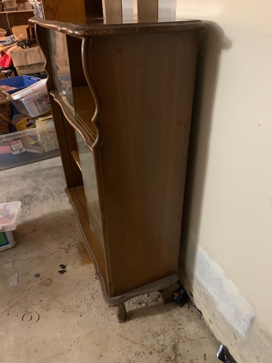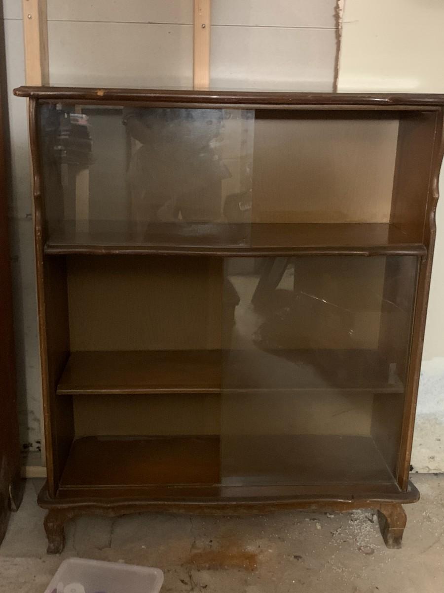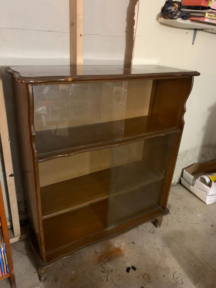 Listed is a nice used vintage bookcase with sliding glass doors. I think it might be walnut. you be the judge.