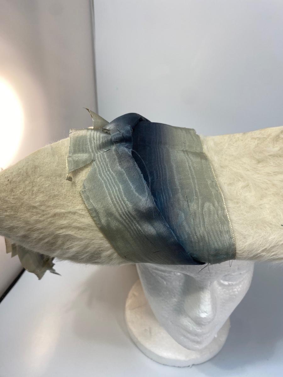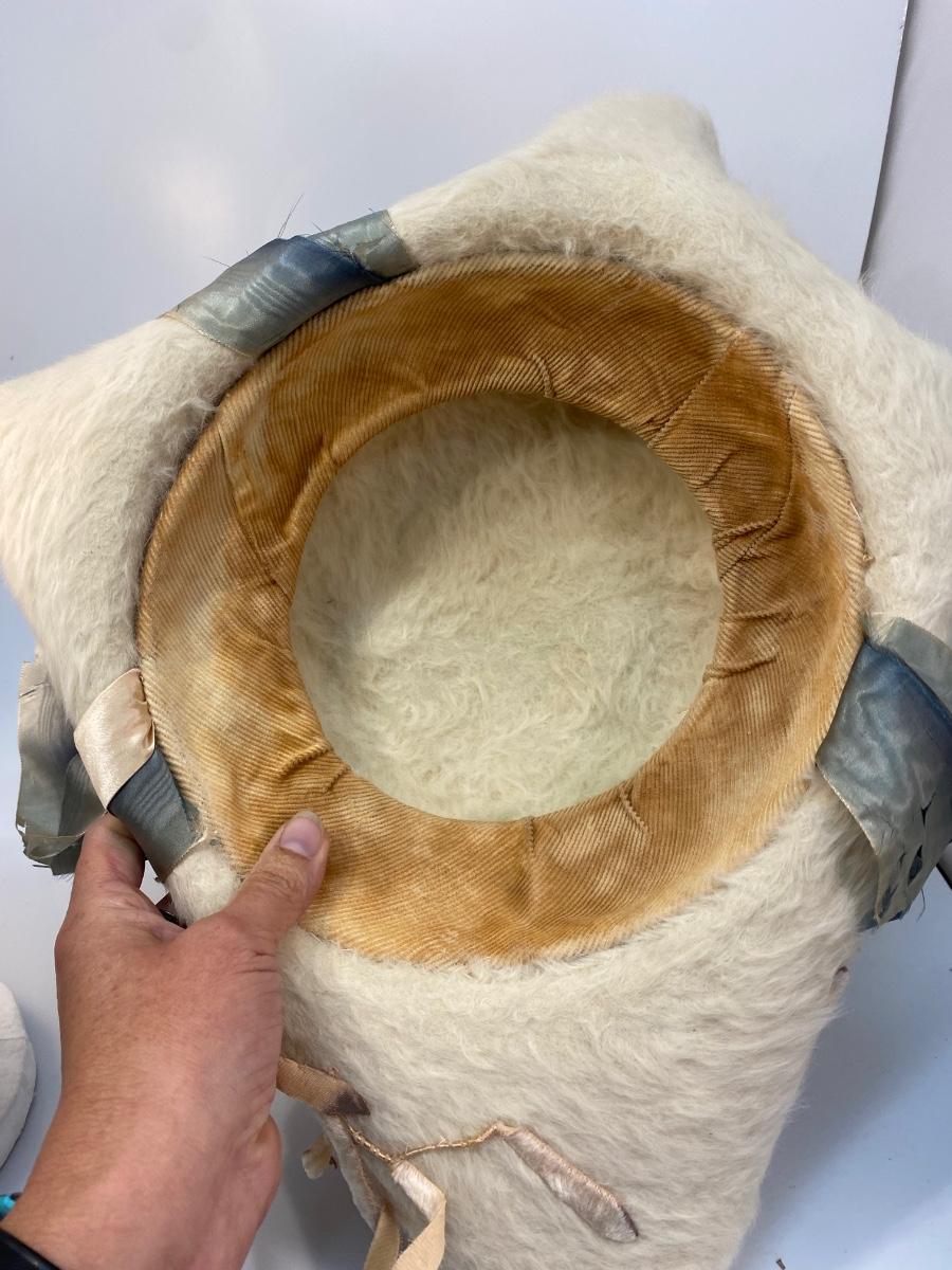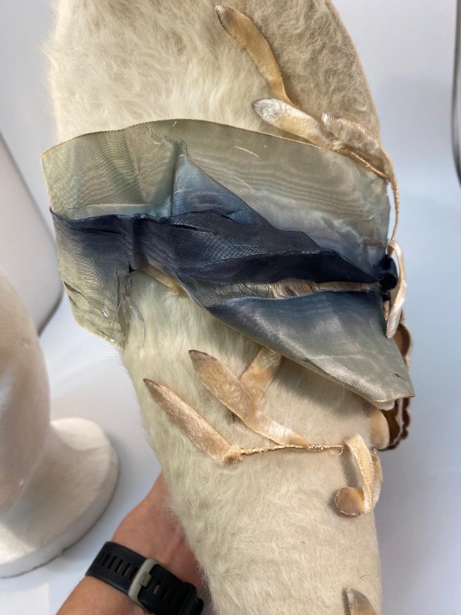 Vintage Antique Brush Wool Fur Colonial Hat with Blue Ribbon and Flowers. Brushed fur, feels real not synthetic. Ribbon shows age and is fragile. In overall good condition.