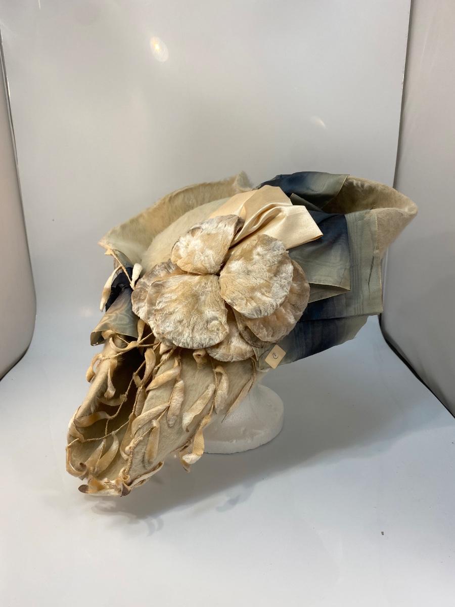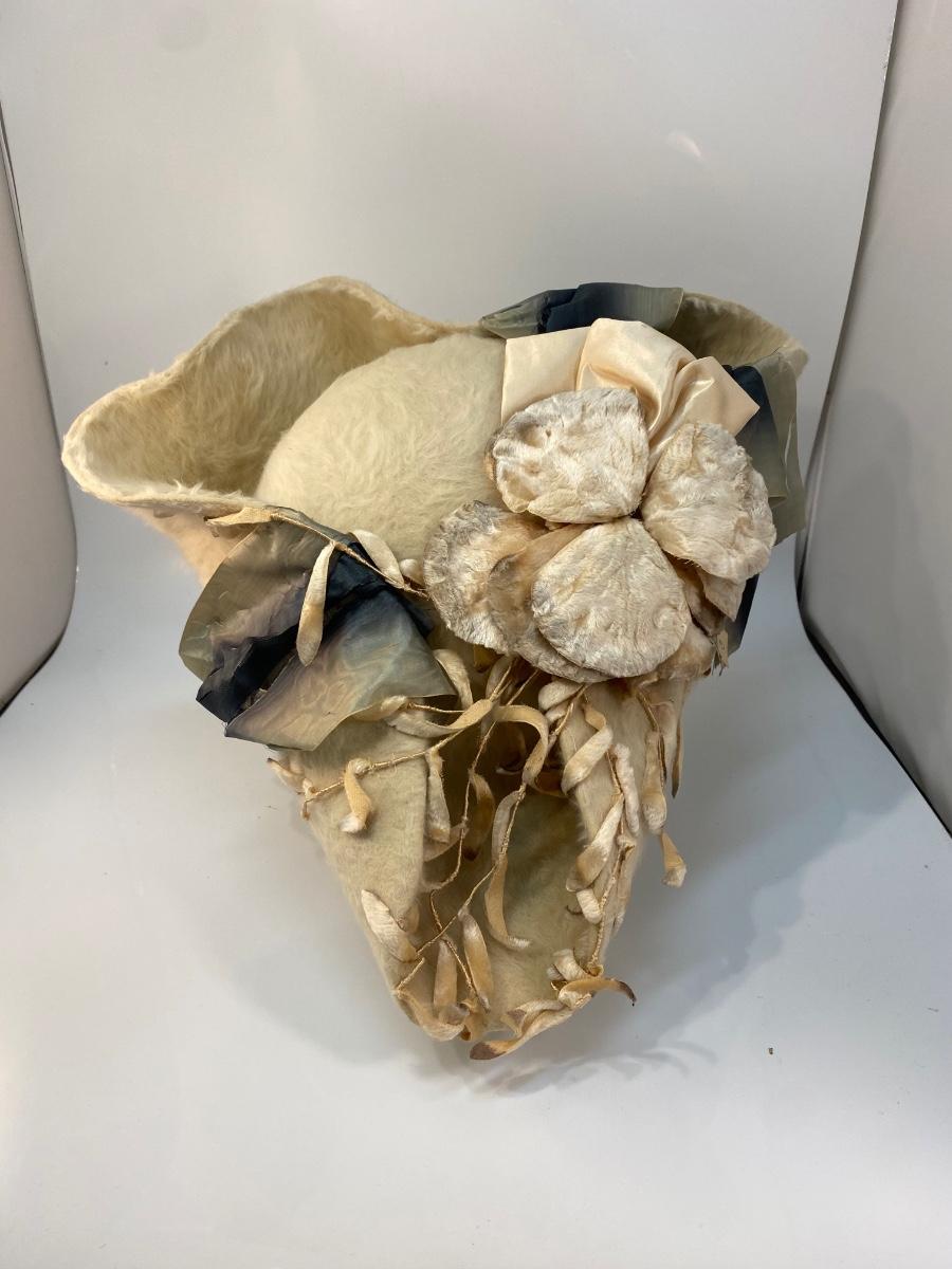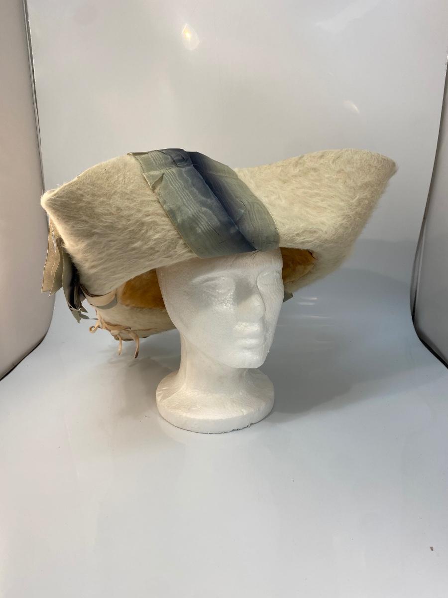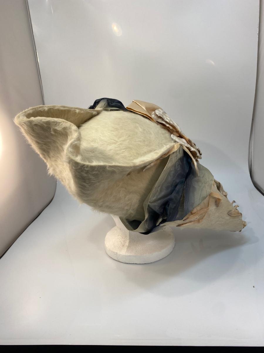 Vintage Antique Brush Wool Fur Colonial Hat with Blue Ribbon and Flowers