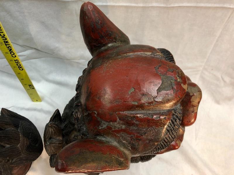 Pair of carved wood Foo Dog statues. Large wood statues at almost 18" tall. They were carved not molded, they look similar but have some variation. Unsure of the wood, maybe rosewood, they are heavy. There is some chips and cracks from age. When looking close you can see the red is an enamel or cinnabar overlay it looks like. No maker marks found. There is a sticker on the foot of one but can't make out what it said, looks like it was a hand written note, not a store sticker.