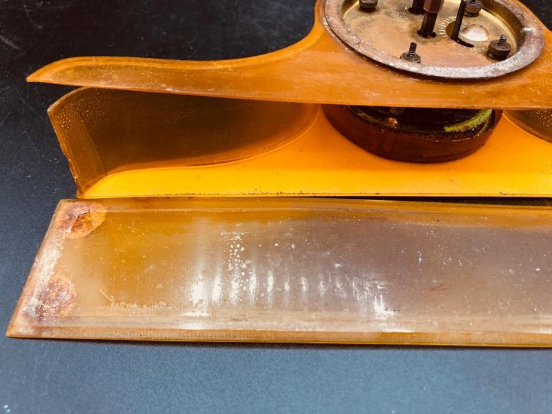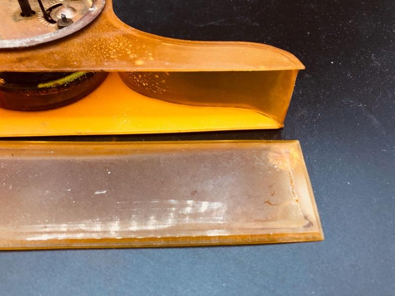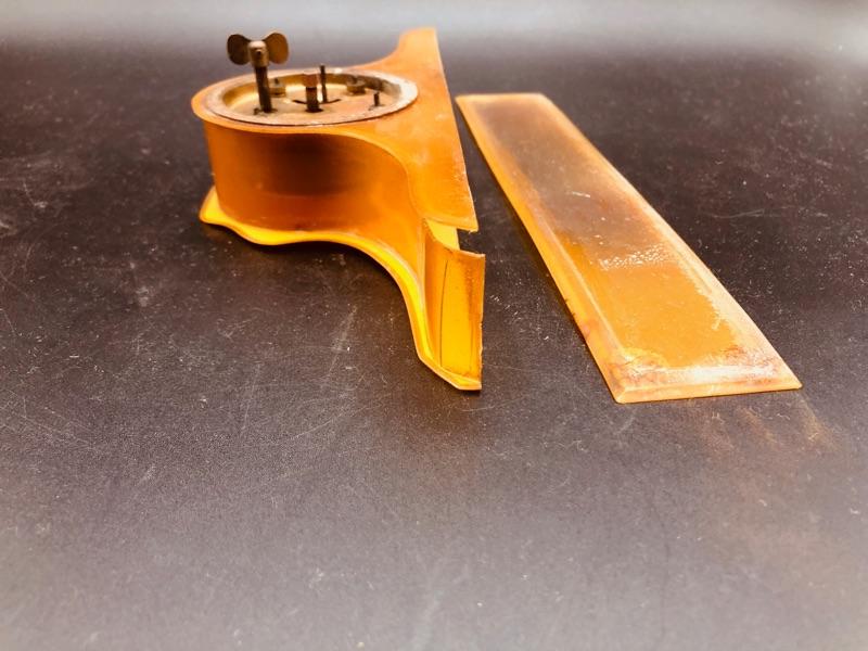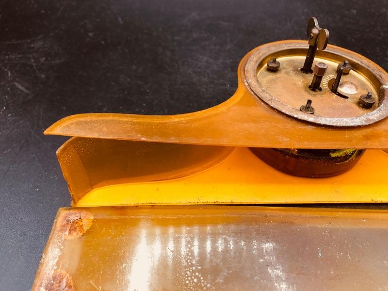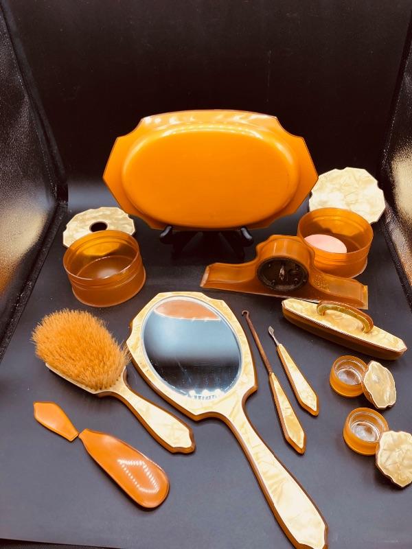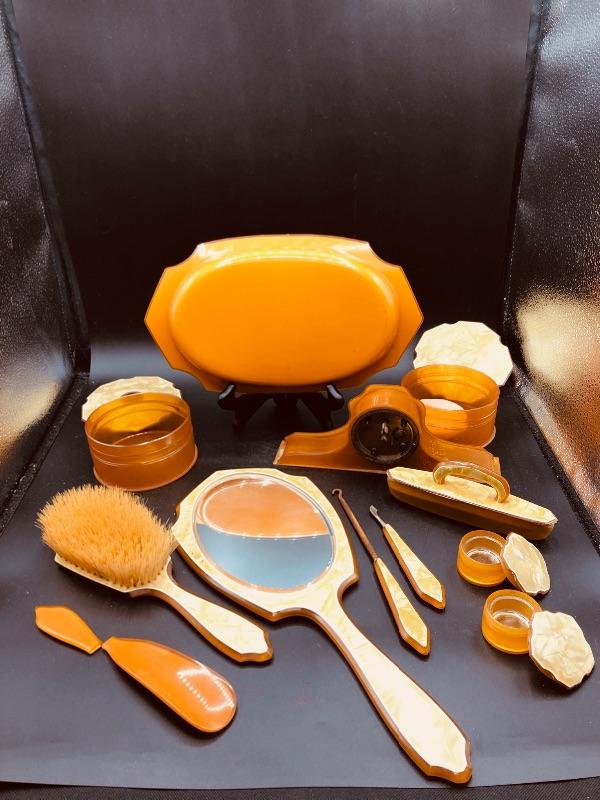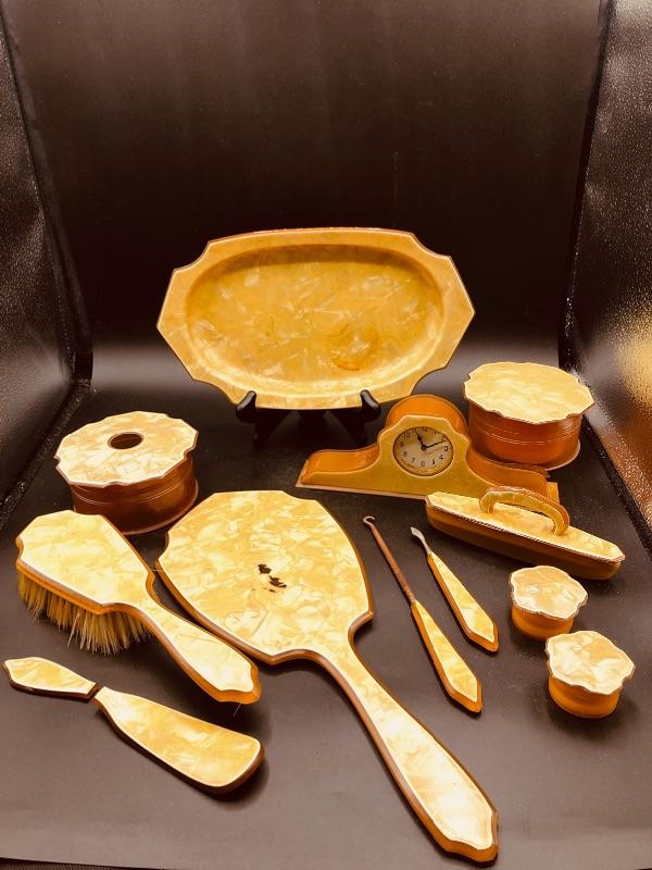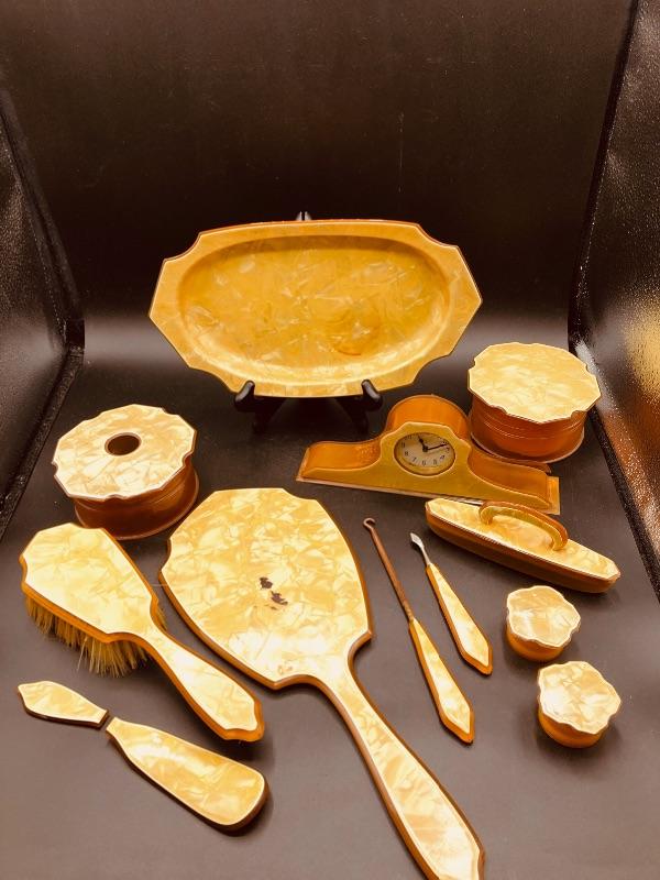 Vintage Vanity Set. 12 piece antique looking set. Some discoloration. The shoe horn is broken. The clock is not running and in need of repair also.