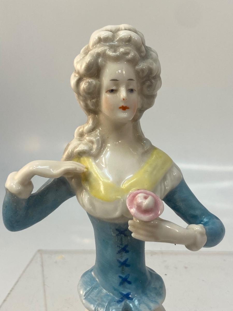 Vintage Antique Ceramic Victorian Lady with Flower Pincushion Half Doll. In good vintage condition, there is a small crack on the back at the bottom, but it does not affect the look or use. About 3.75" size.