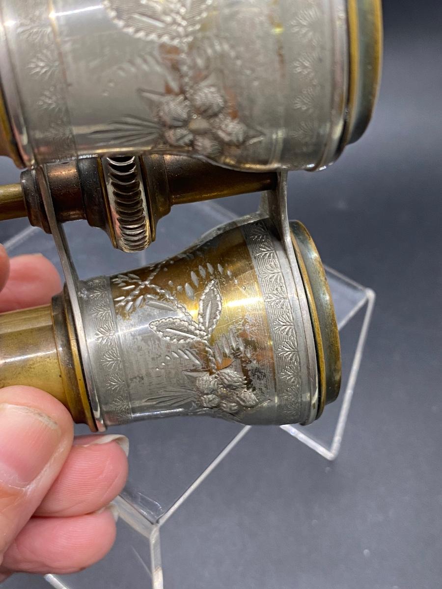 Pair of Chevalier Paris opera glasses. Silver plate over brass. The front is stamped Edward Westen Tea & Spice Co. St. Louis. There is wear to the silver finish. Dial turns for focusing. Display nicely.