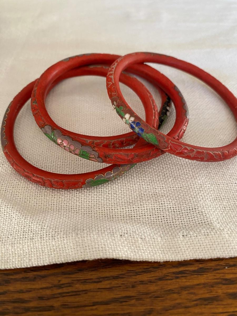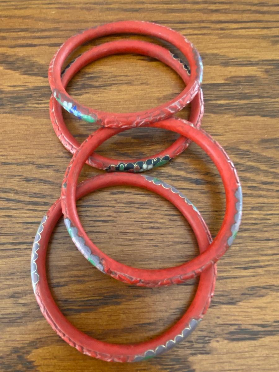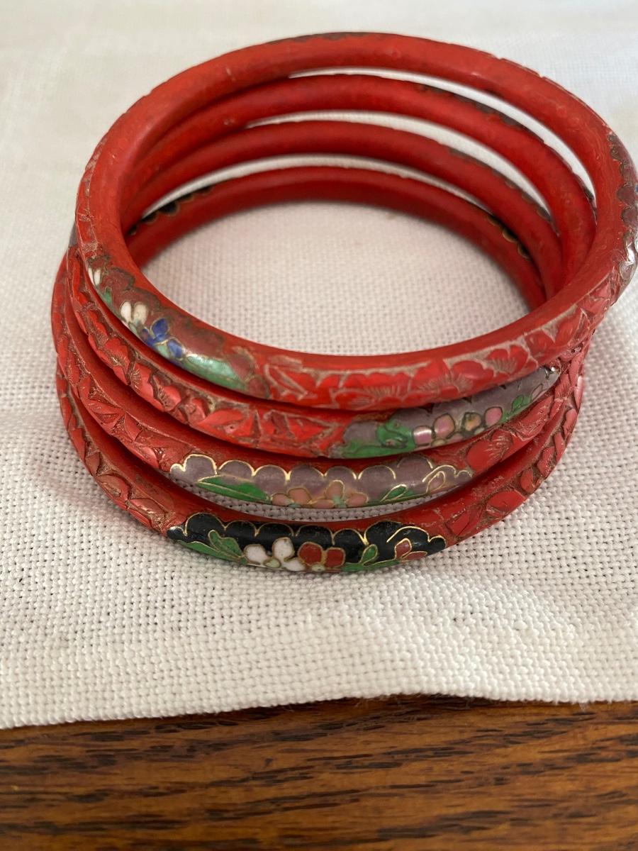 vintage/antique bangle bracelet made of carved cinnabar and inlaid cloisonné cartouches in clusters . Used condition but no cracks or chips. Set of the 4
