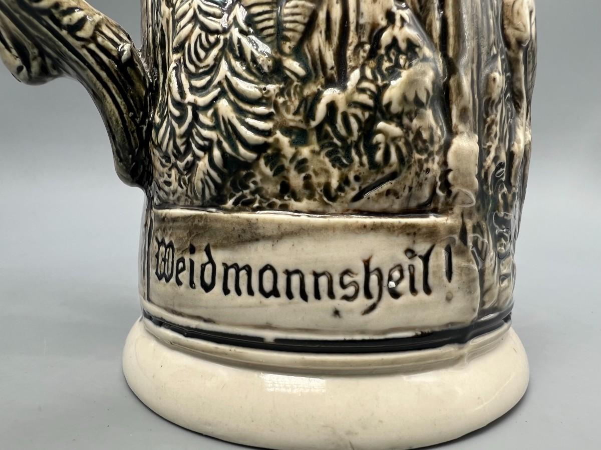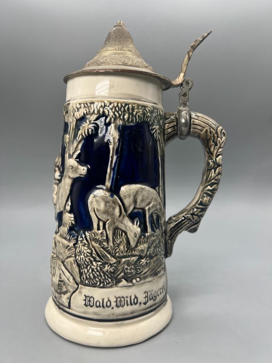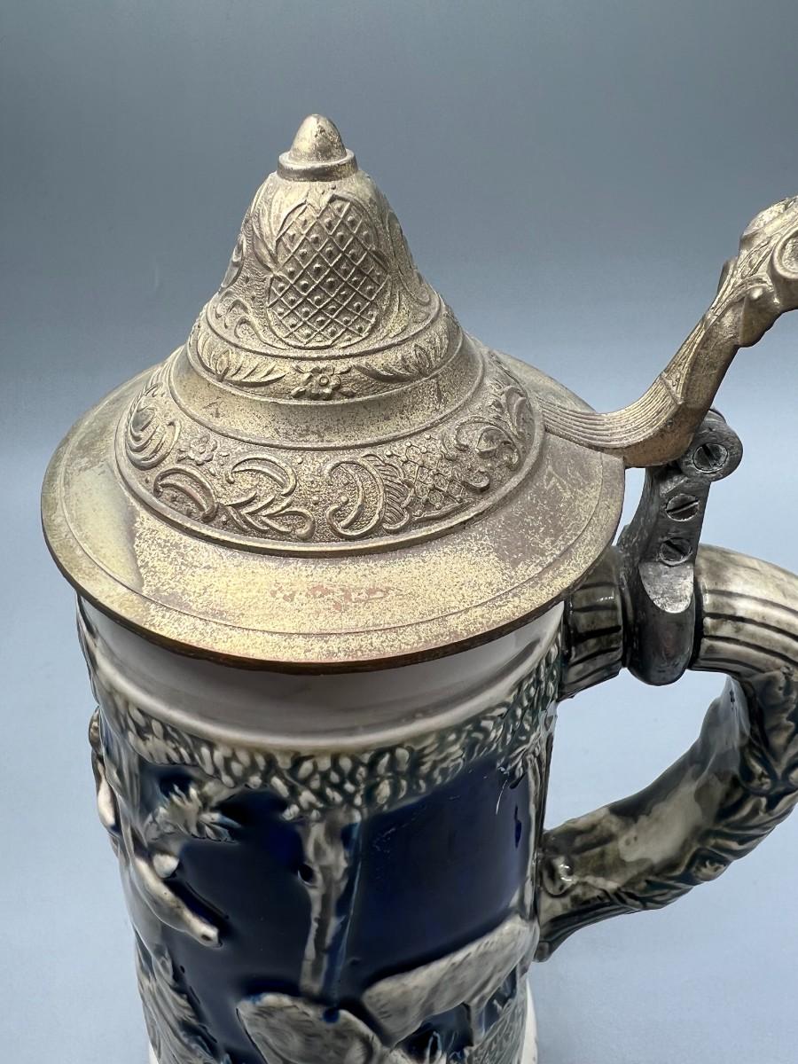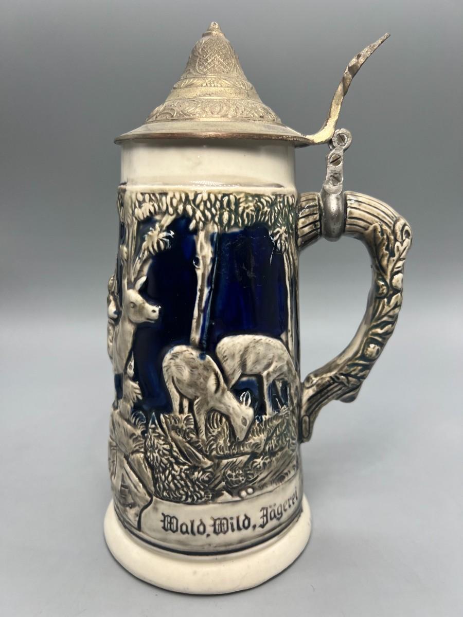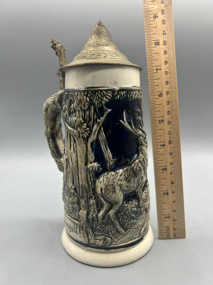 Vintage Antique Cobalt Lidded German Beer Stein Mug. In good condition. Has a deer in forest scene. About 9" tall.