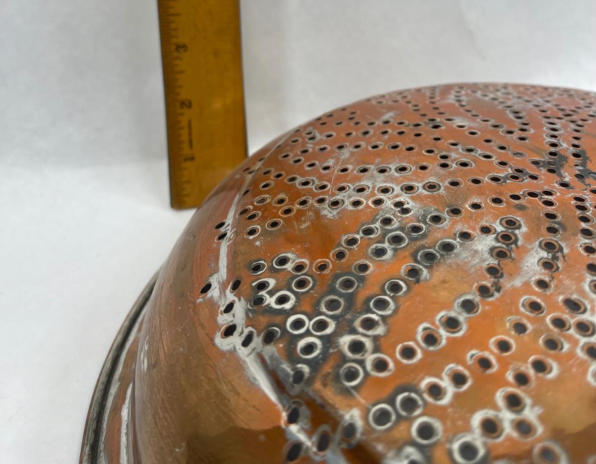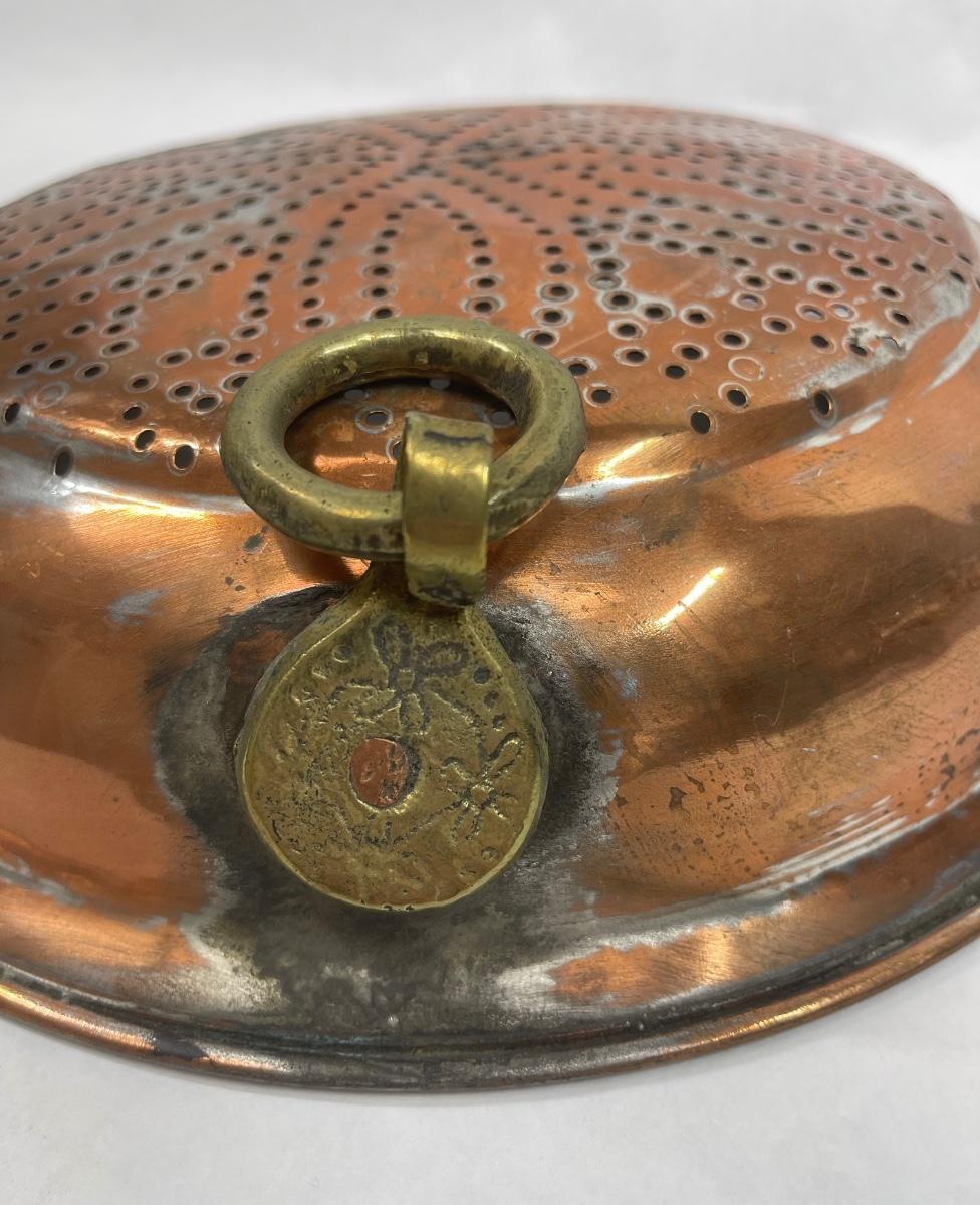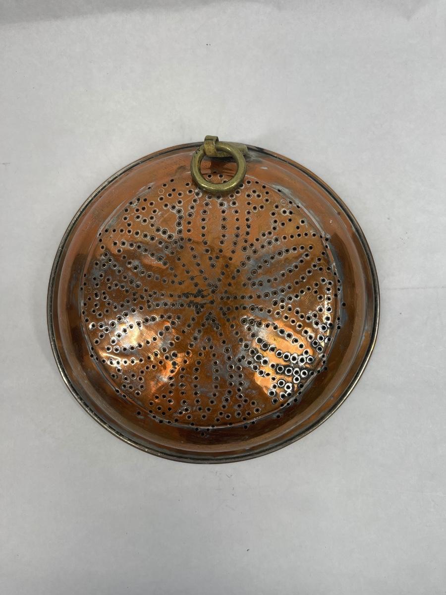 Nice patina for a country kitchen. Has an intricate 6-pointed flower pattern. Also has a brass fitting and hook for hanging. Copper finish shows some wear in a good way.