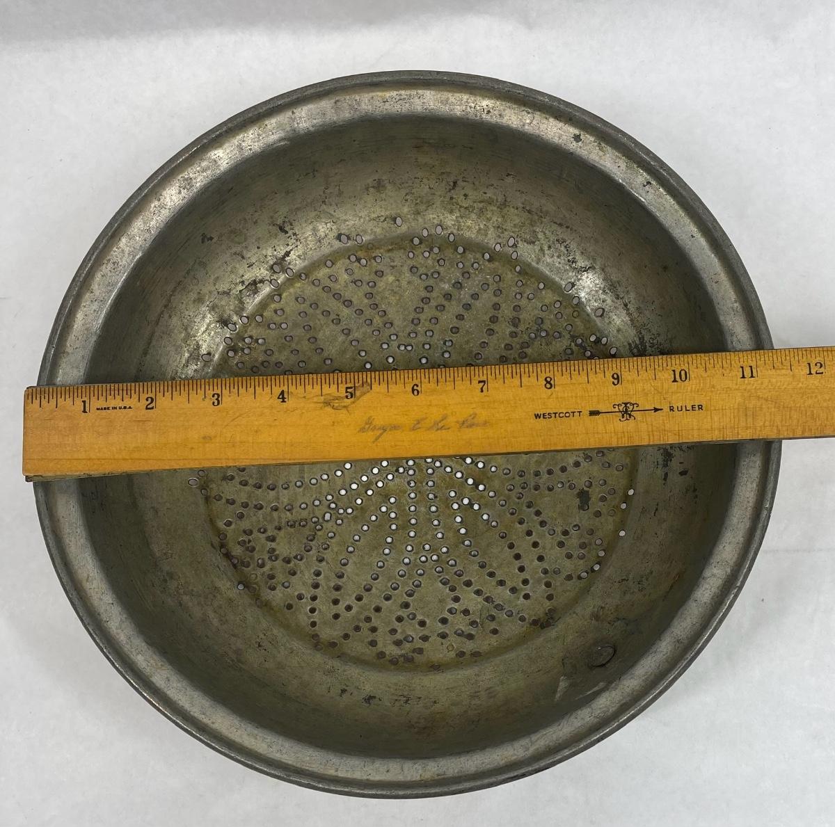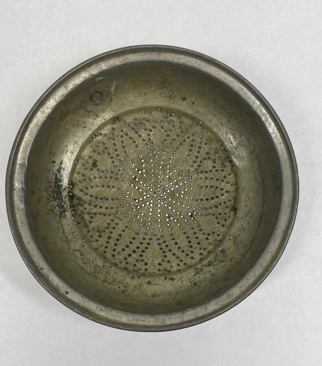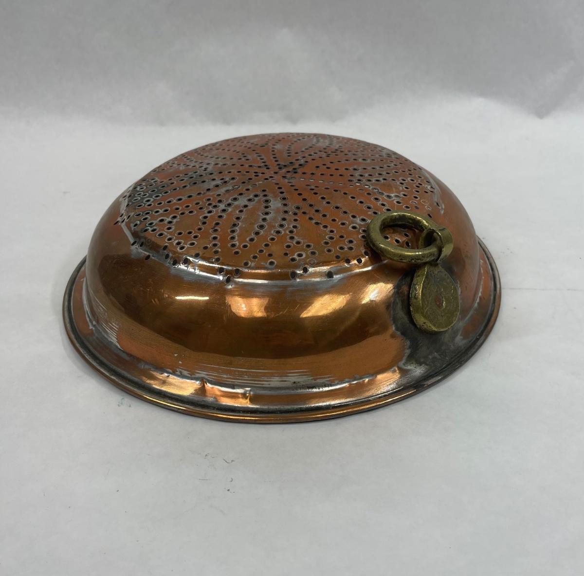 Nice patina for a country kitchen. Has an intricate 6-pointed flower pattern. Also has a brass fitting and hook for hanging. Copper finish shows some wear in a good way.