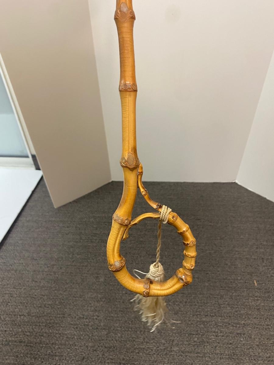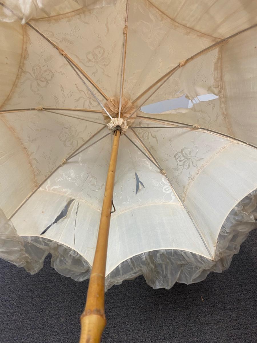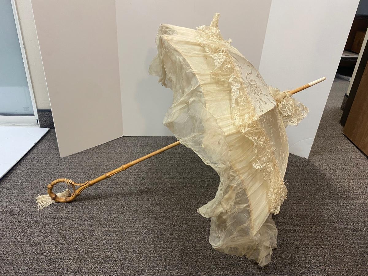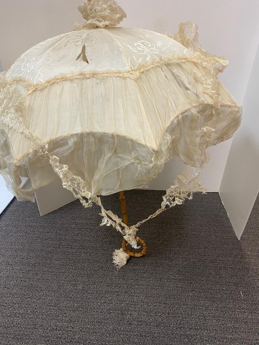 Vintage Antique Cotton & Lace Parasol Umbrella. Fabric has some tears and is delicate as is the lace. Neat bamboo handle. Opens and closes easily but you can feel the tension in aged fabric wanting to rip more.