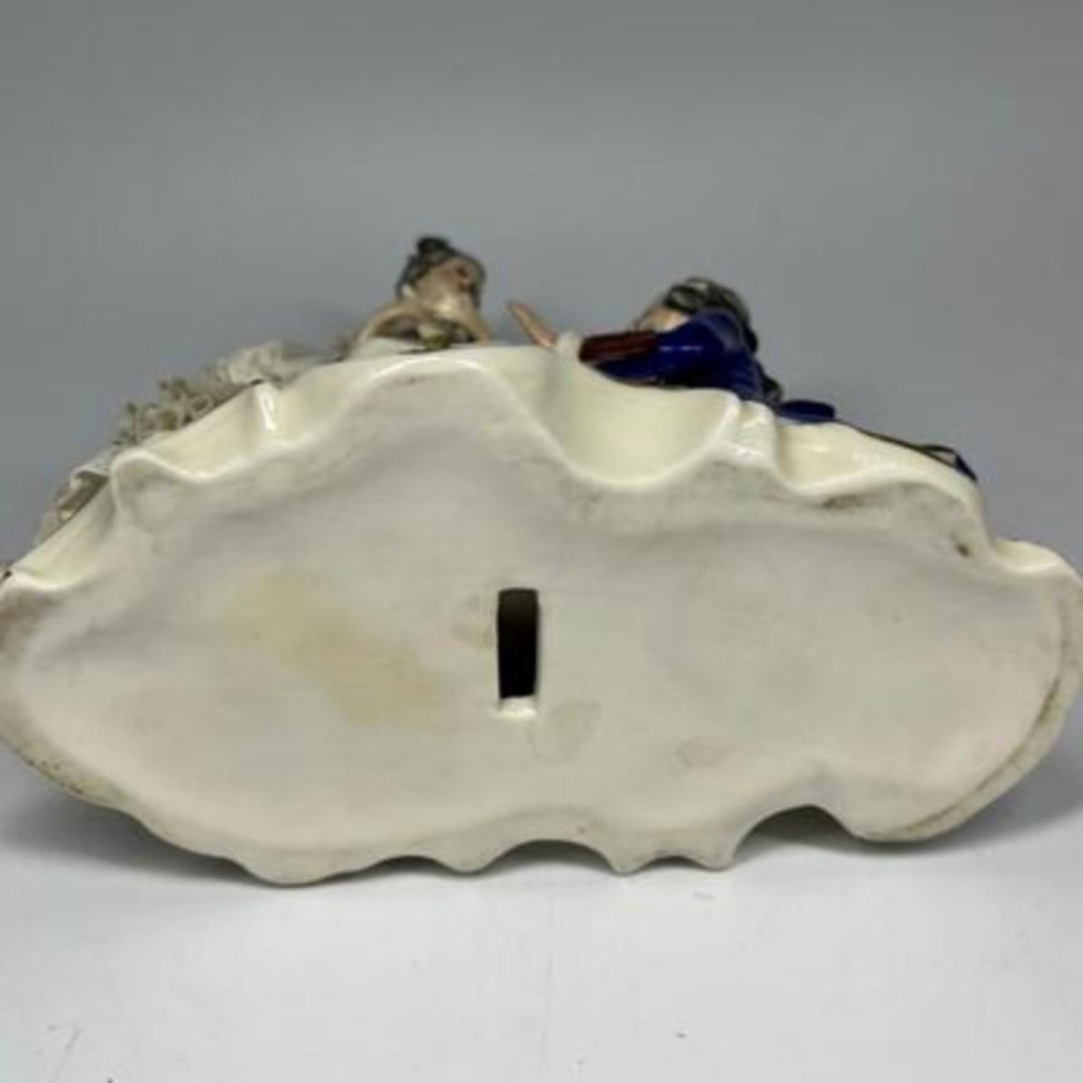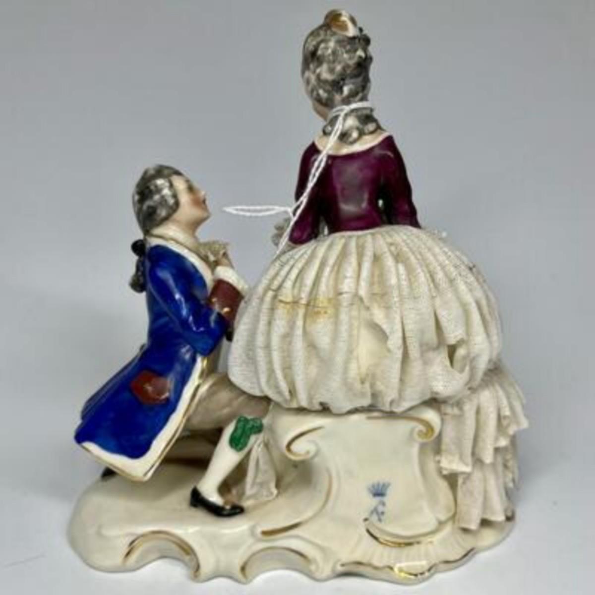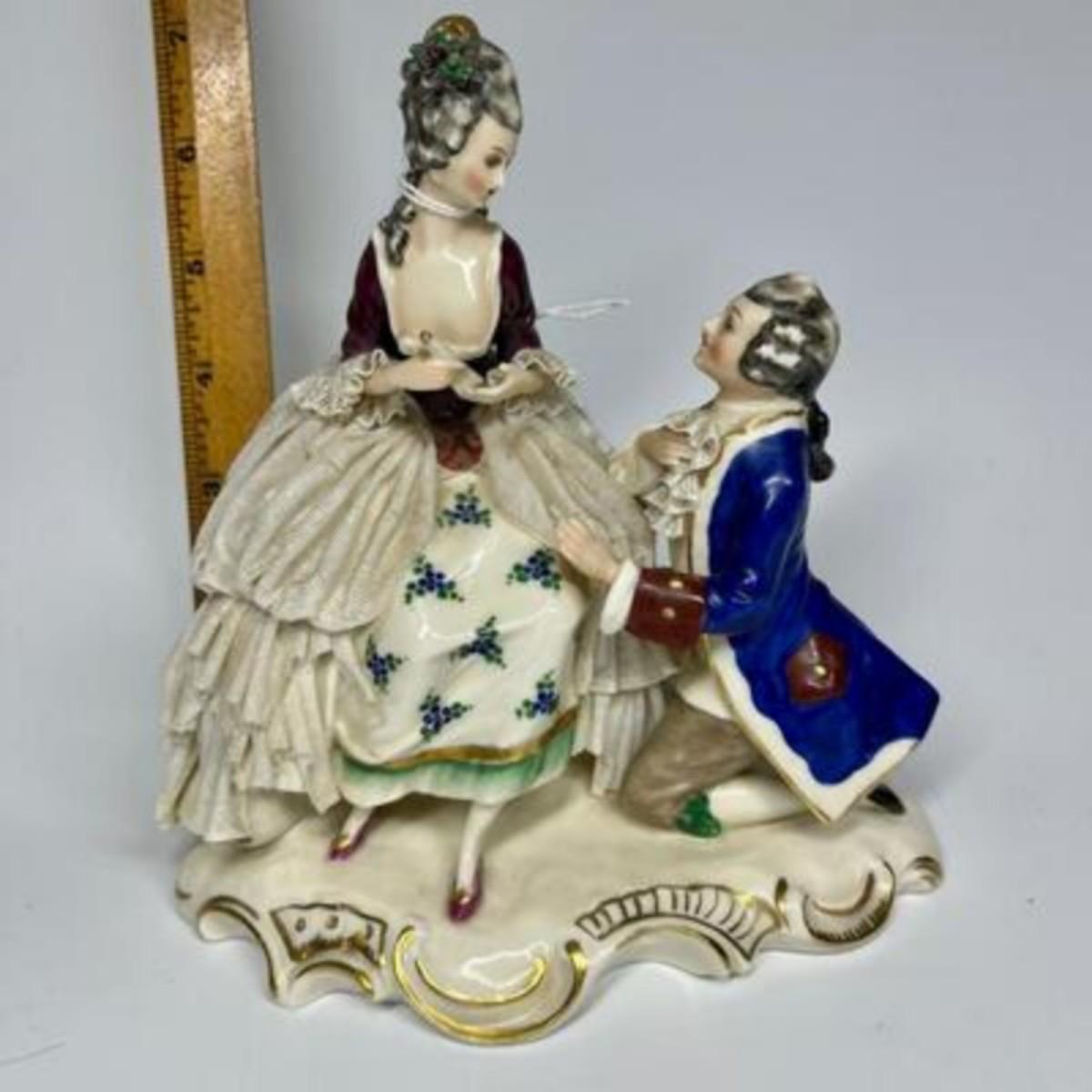 Vintage Antique Dresden Style Porcelain Lace French Man & Woman Lovers Courting Couple Figurine. Marked on the backside of figurine. There are some minor chips to the lace but go unnoticed unless inspected, displays well.