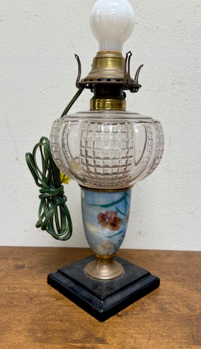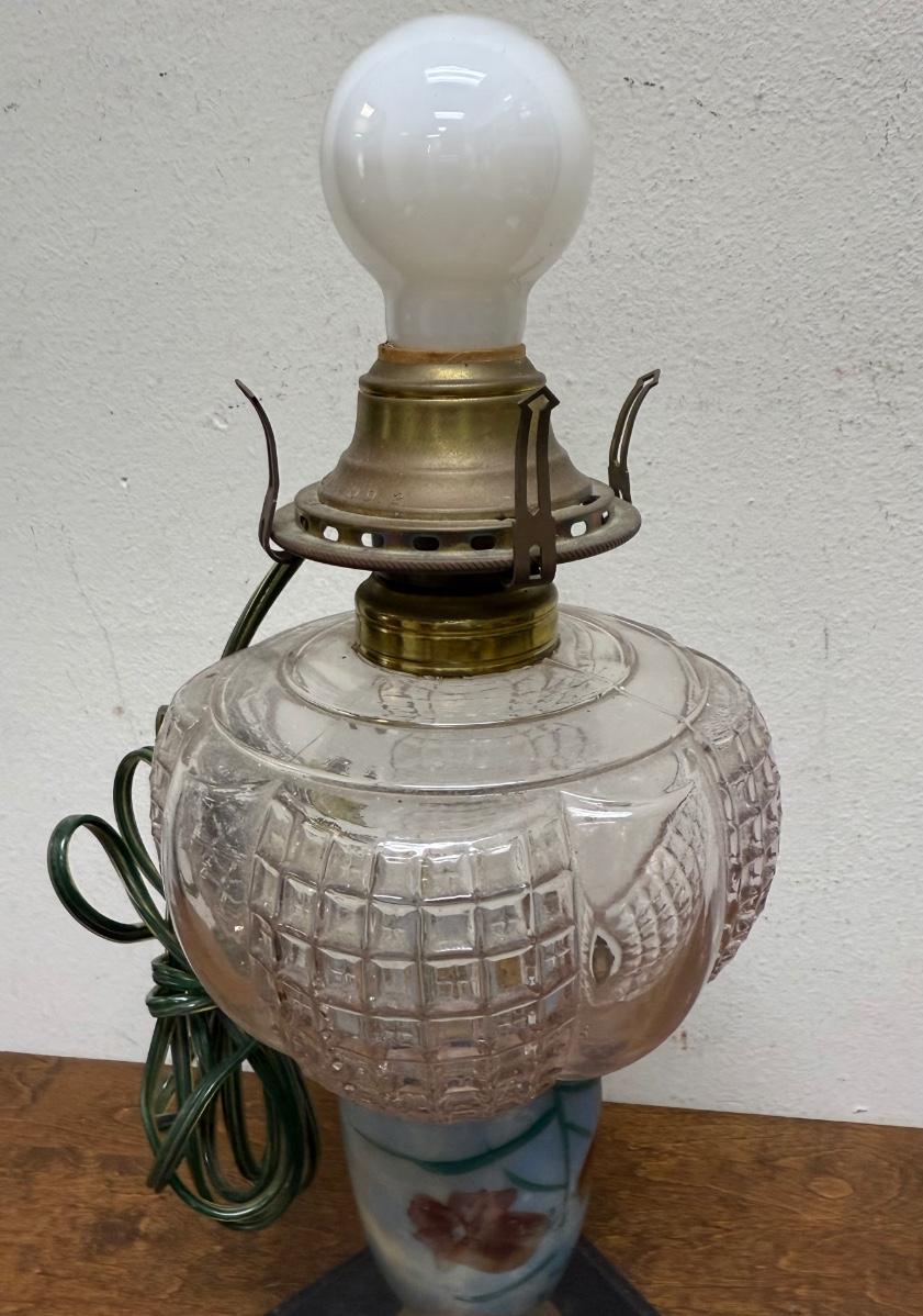 Approx. 14" tall. Tested, works as expected. Antique Electrified Oil Lamp - Asian Inspired - Cast Iron Base - Oil Burning Lamp - Early 1900s - Victorian Lamp - Hurricane Lamp.