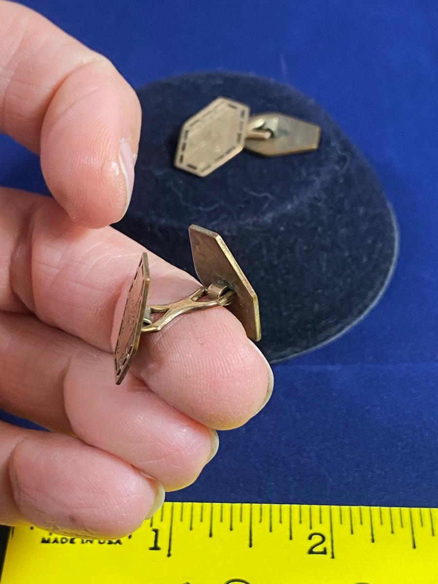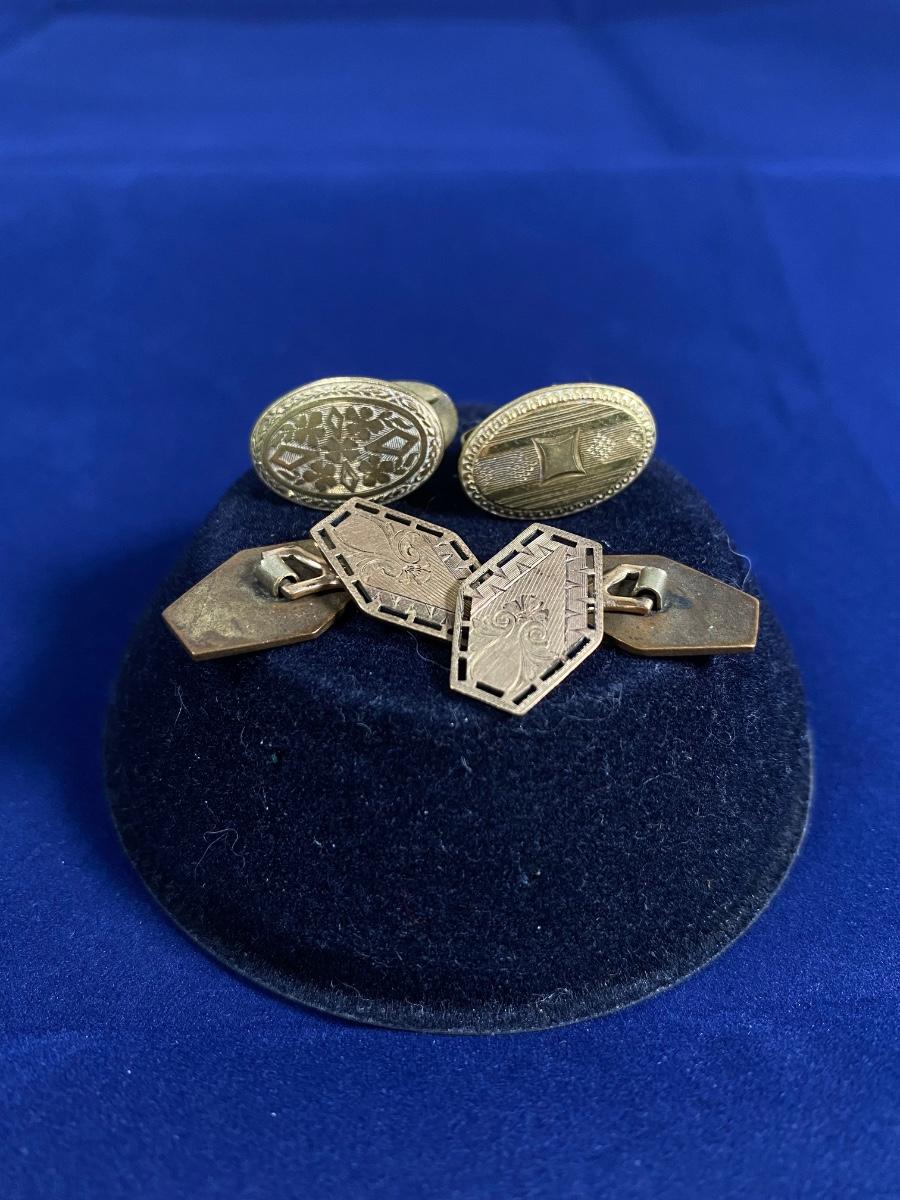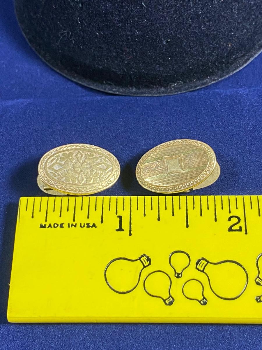 Vintage Antique Etched Cuff Links and Tie Clips. The two clips are stamped on the back Gold Top but no mention of karat. All are under 1" size.