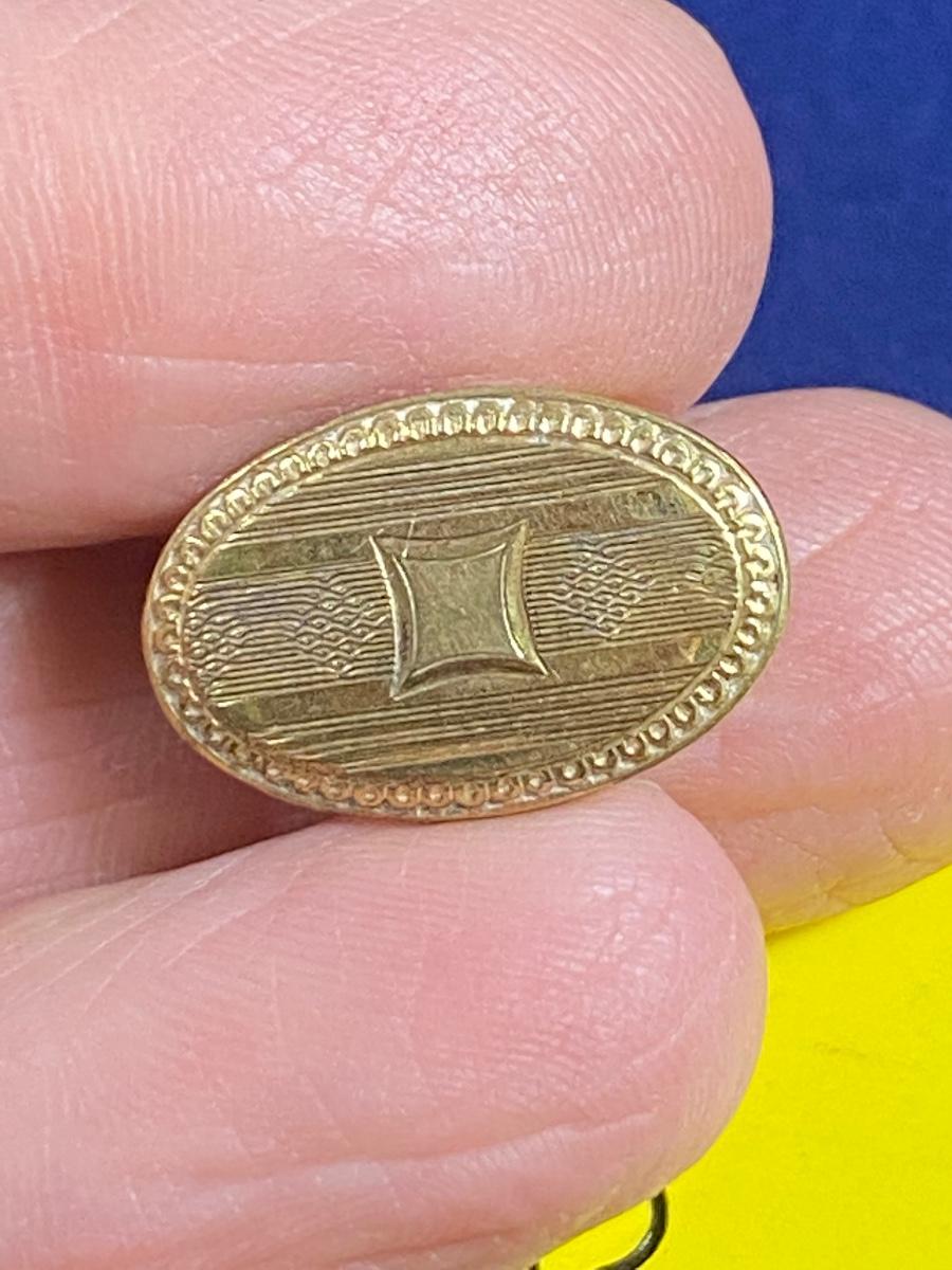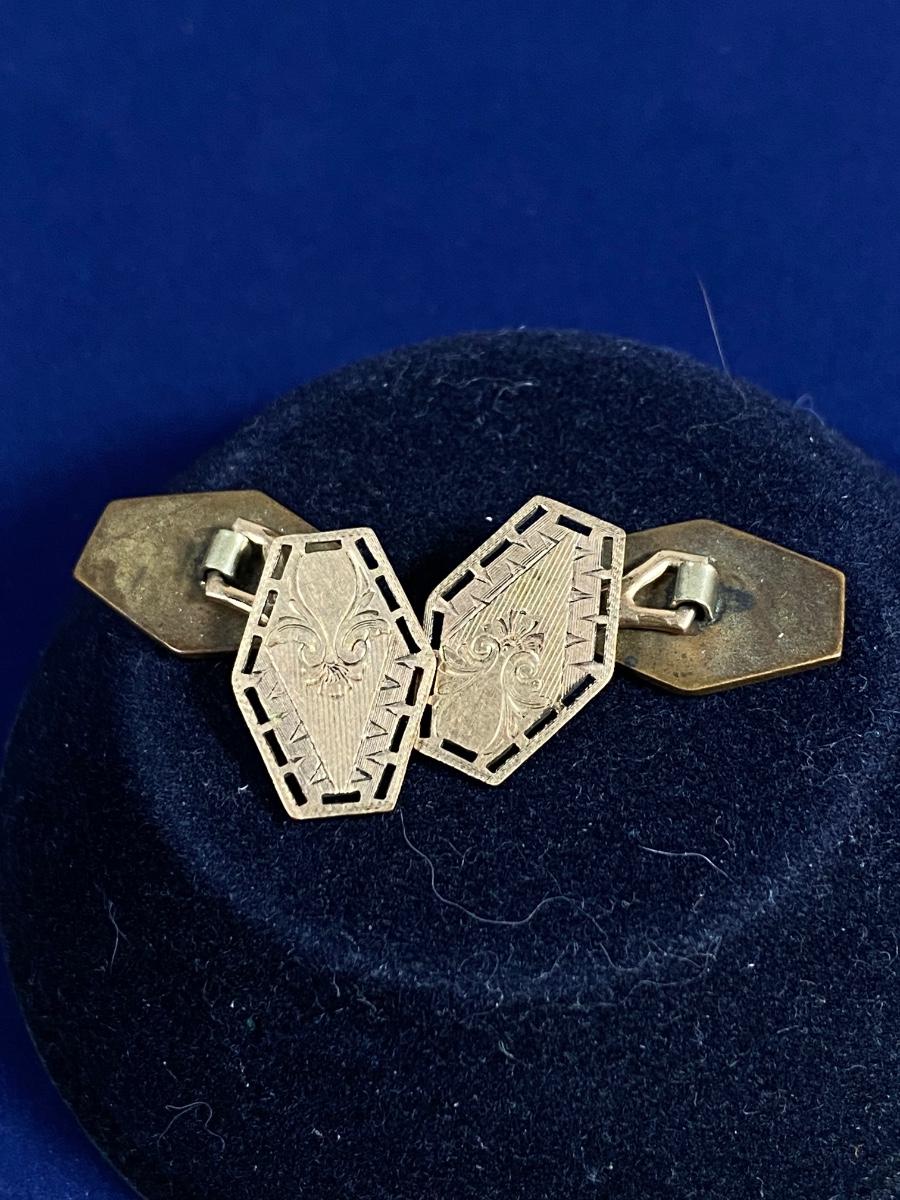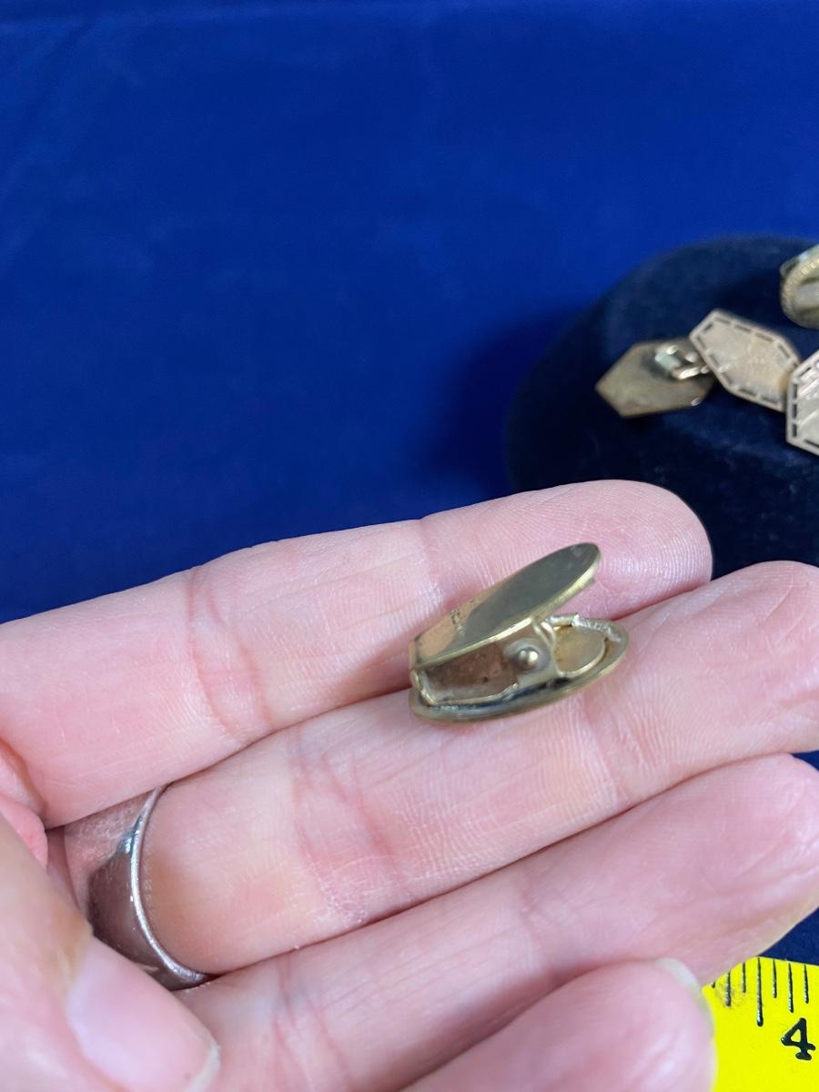 Vintage Antique Etched Cuff Links and Tie Clips. The two clips are stamped on the back Gold Top but no mention of karat. All are under 1" size.