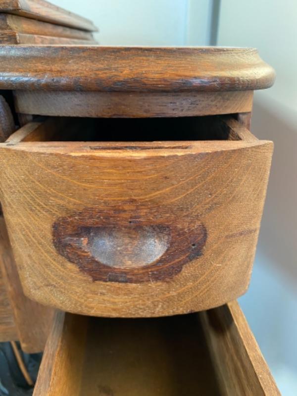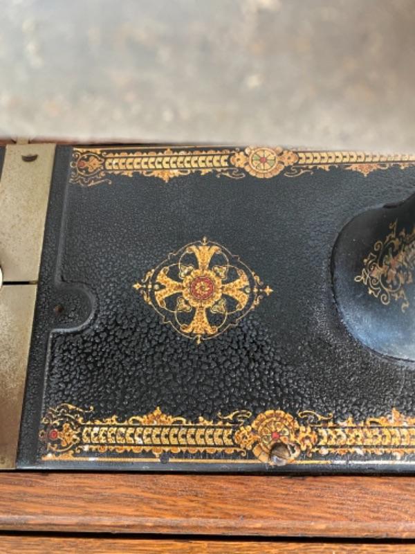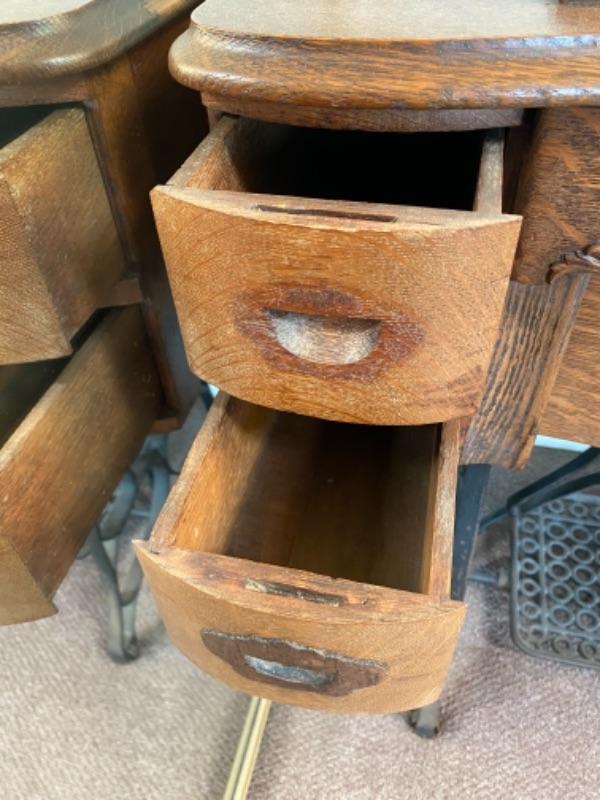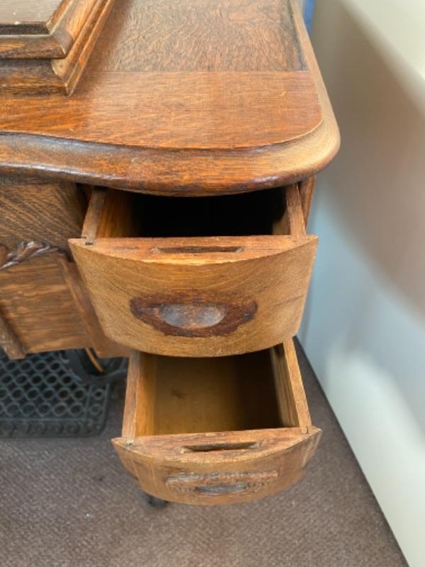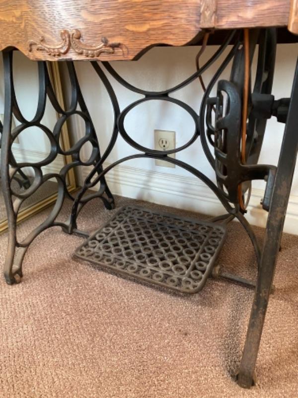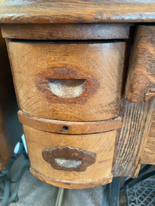 Antique sewing table with machine. Oak treadle sewing table with 4 small drawers. Sewing machine inside has signs of age, could not make out any of the lettering on machine, unsure of brand. The wood decorations around drawer pulls is missing. Great as is or repurposed. Measures roughly 34"x 19"x 29".