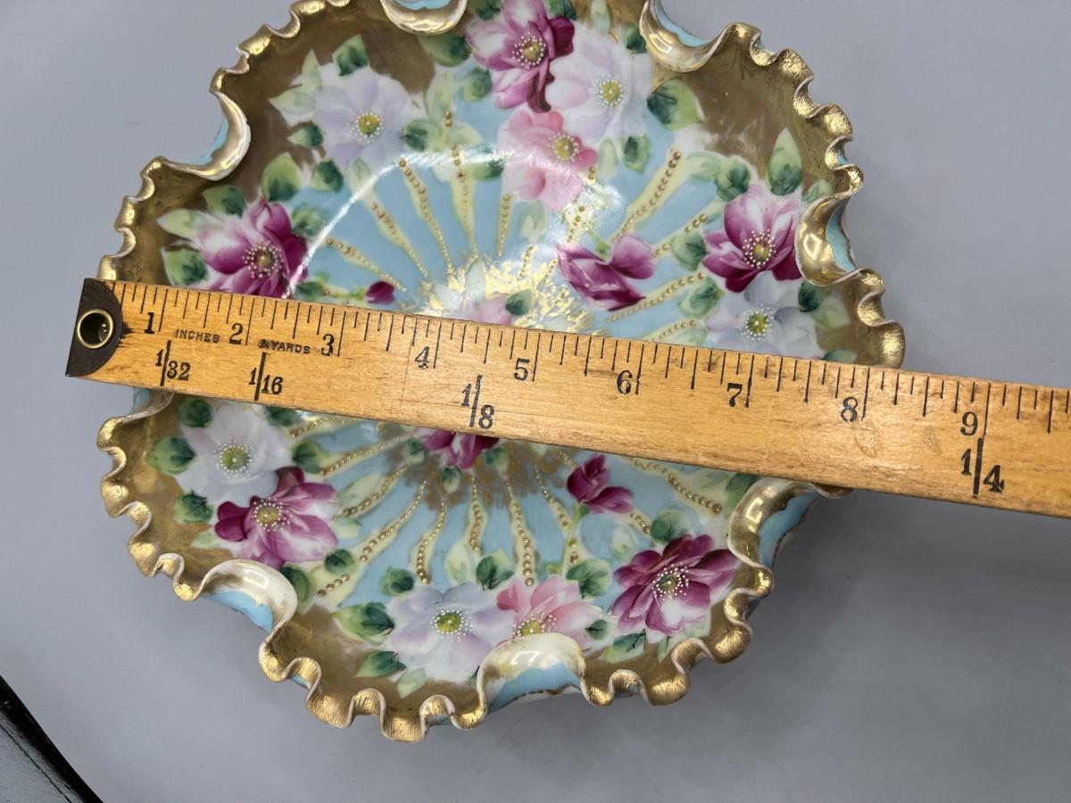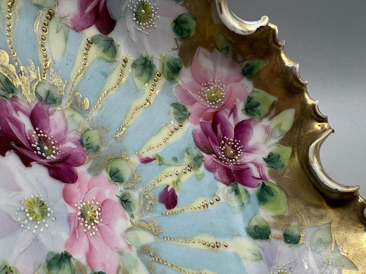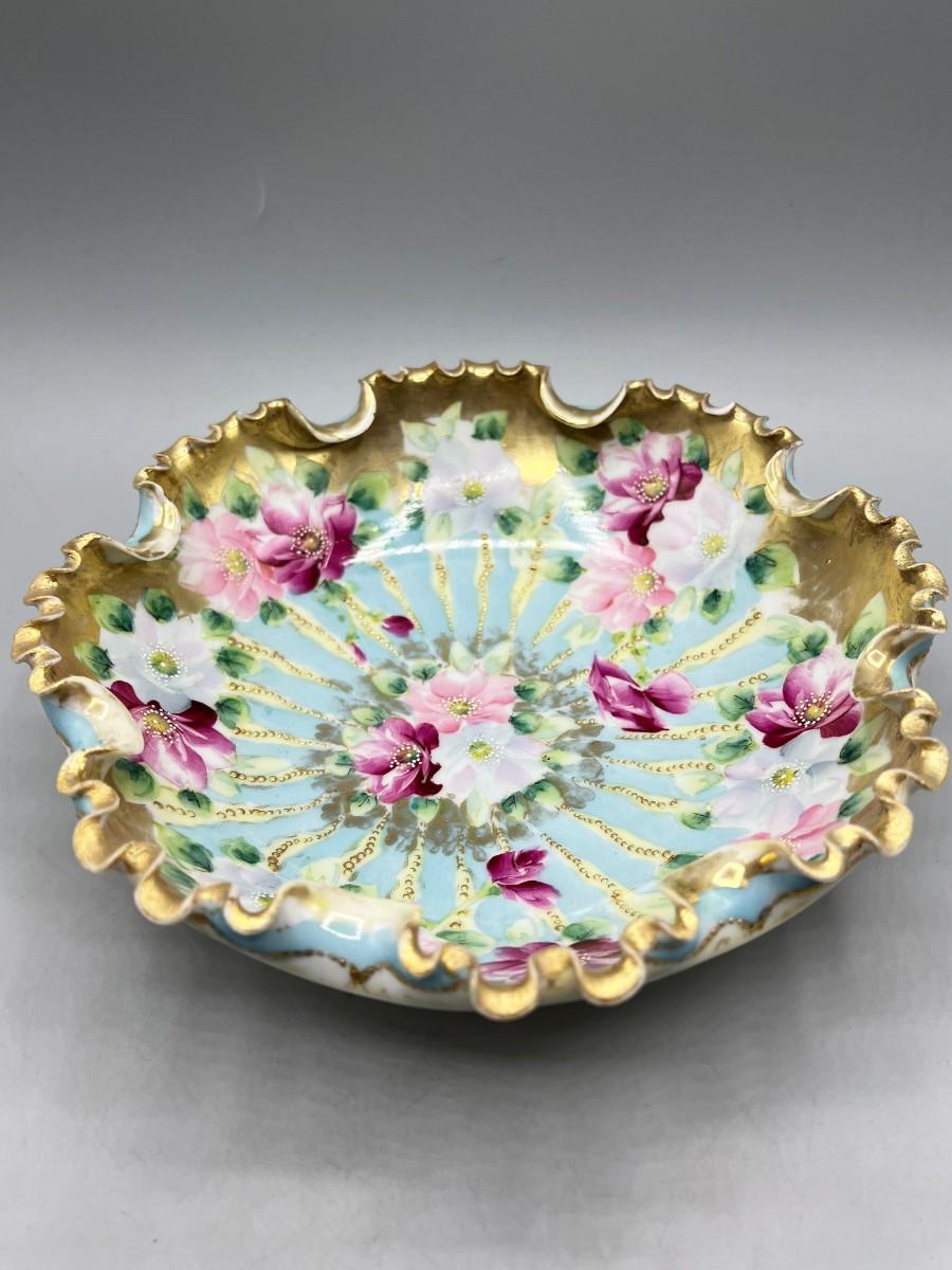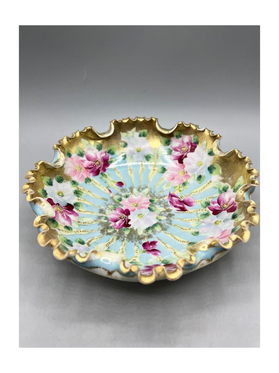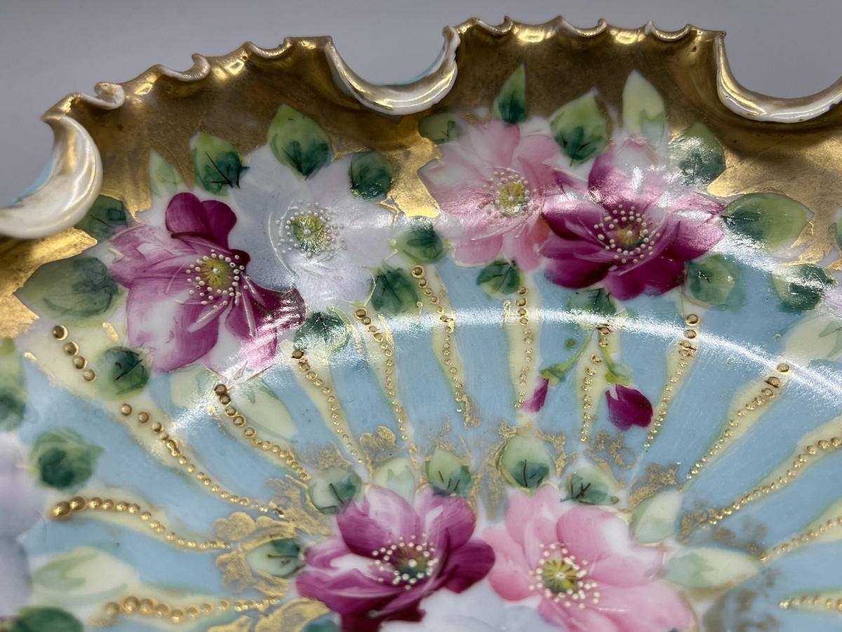 Vintage Antique Gold Gilt Edge Floral Porcelain Footed Serving Bowl. Hand painted roses on a pale blue background. Heavy gold gilt accents. Some wear to design from age. About 8" diameter. Unbranded or the name has faded off.