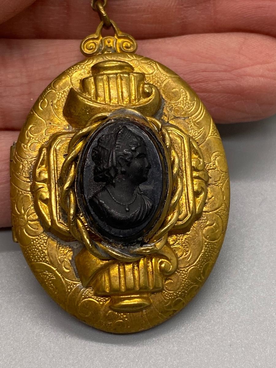 Vintage gold tone cameo locket pin. Black cameo on front of locket. In good condition, some light wear. Unbranded.