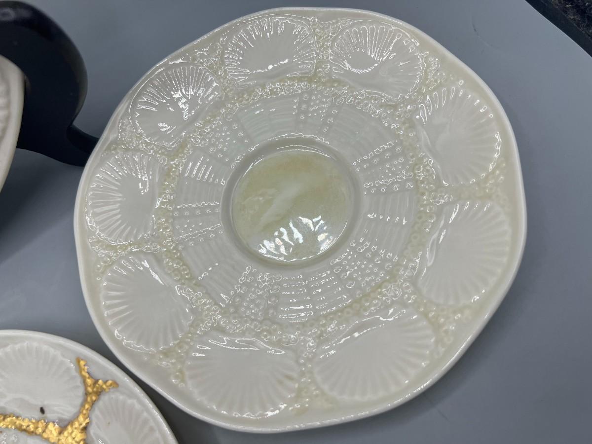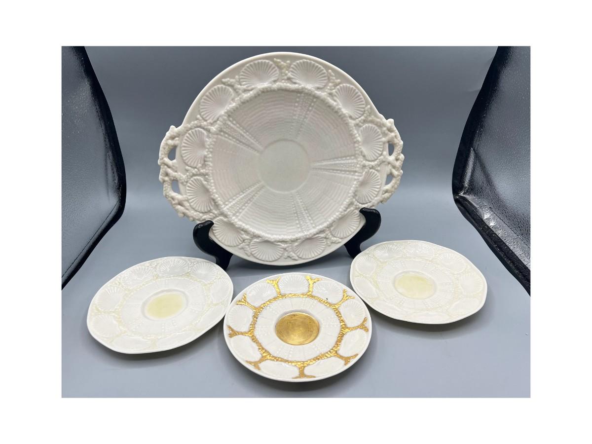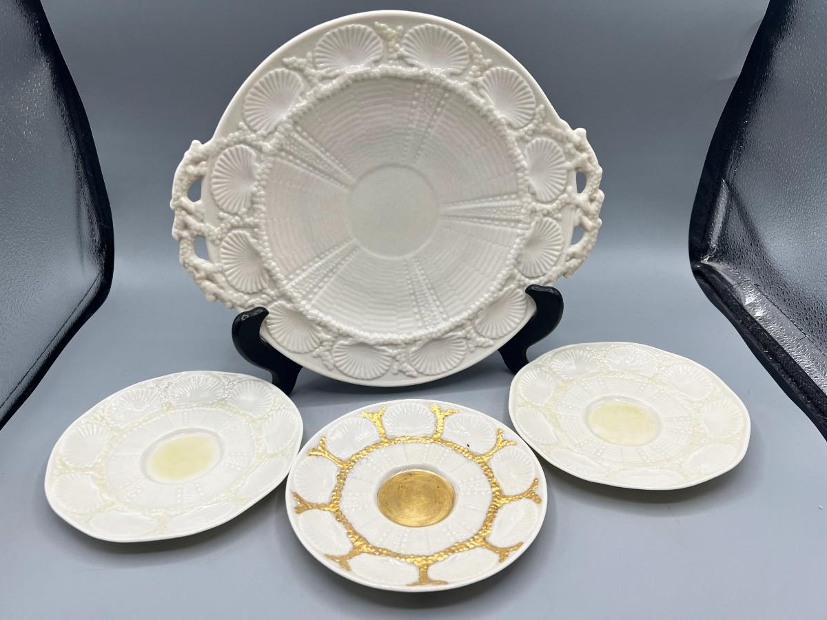 Vintage Antique Green Label Belleek Saucers & Serving Plate. In good vintage condition. One of the plates has gold gilt added. Shell pattern, absolutely stunning.