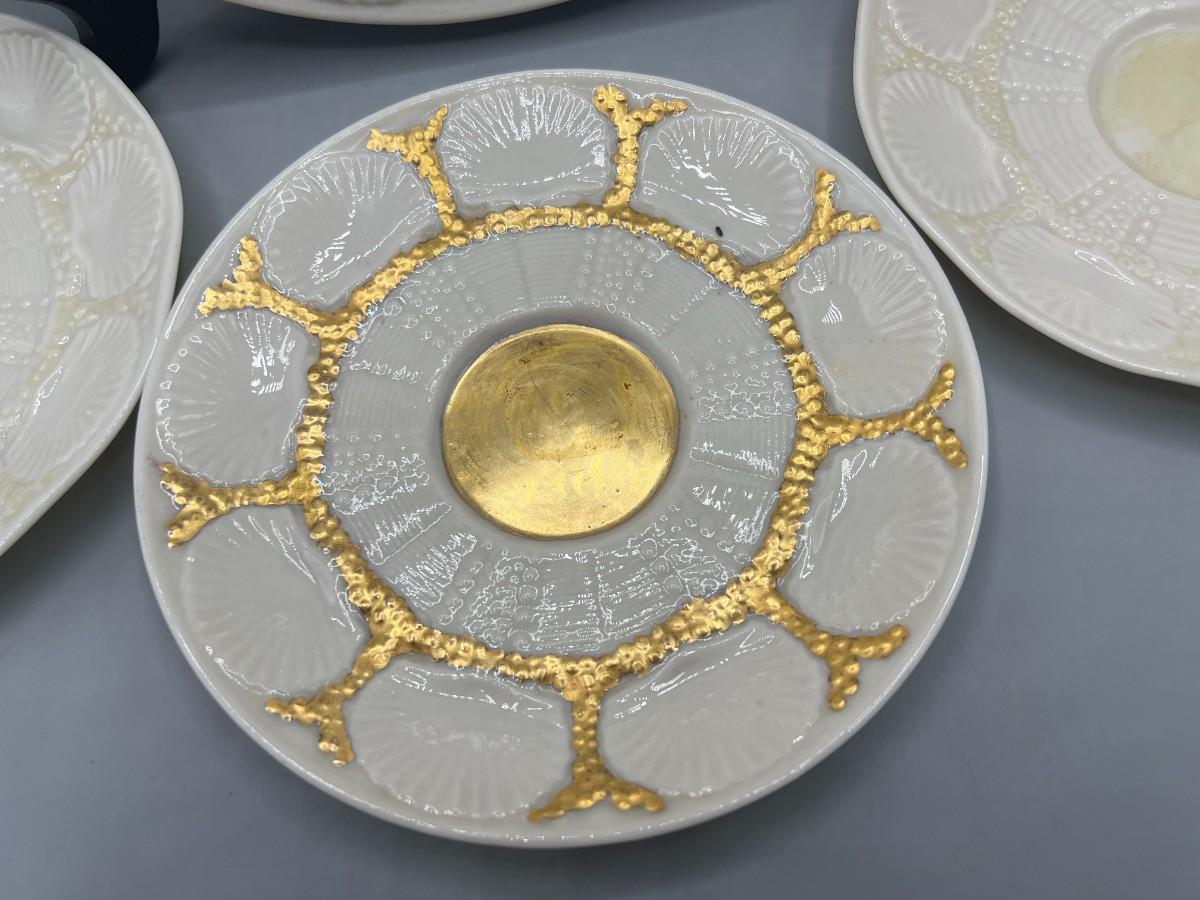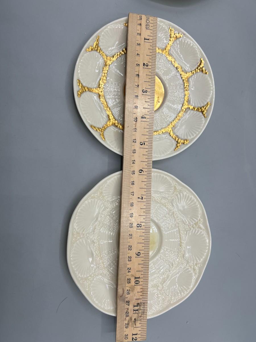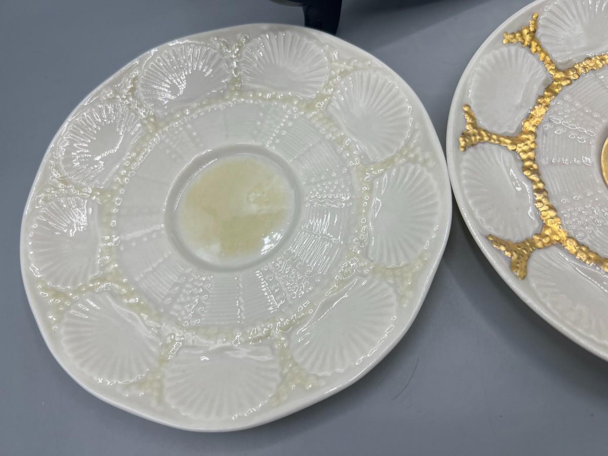 Vintage Antique Green Label Belleek Saucers & Serving Plate. In good vintage condition. One of the plates has gold gilt added. Shell pattern, absolutely stunning.