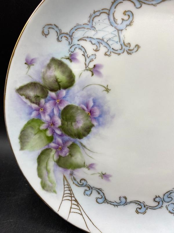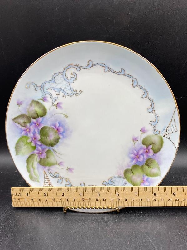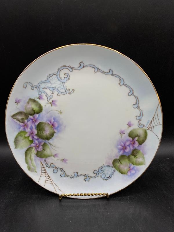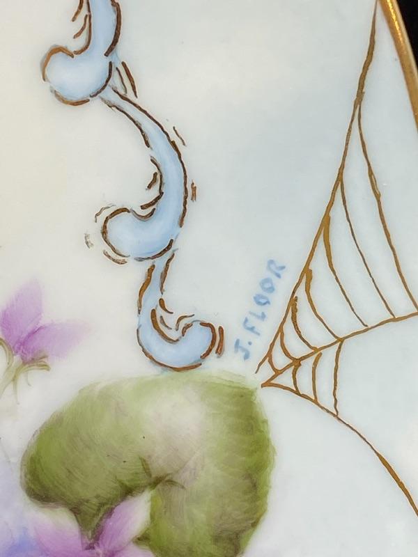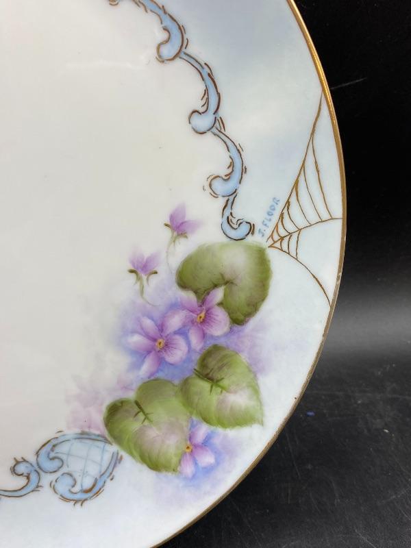 Beautiful floral hand painted plate. Purple flowers on a pale blue background, gold accents. Signed J Floor along edge of web. On the back there is only the letter F. Good condition, displays nicely. About 9" size.