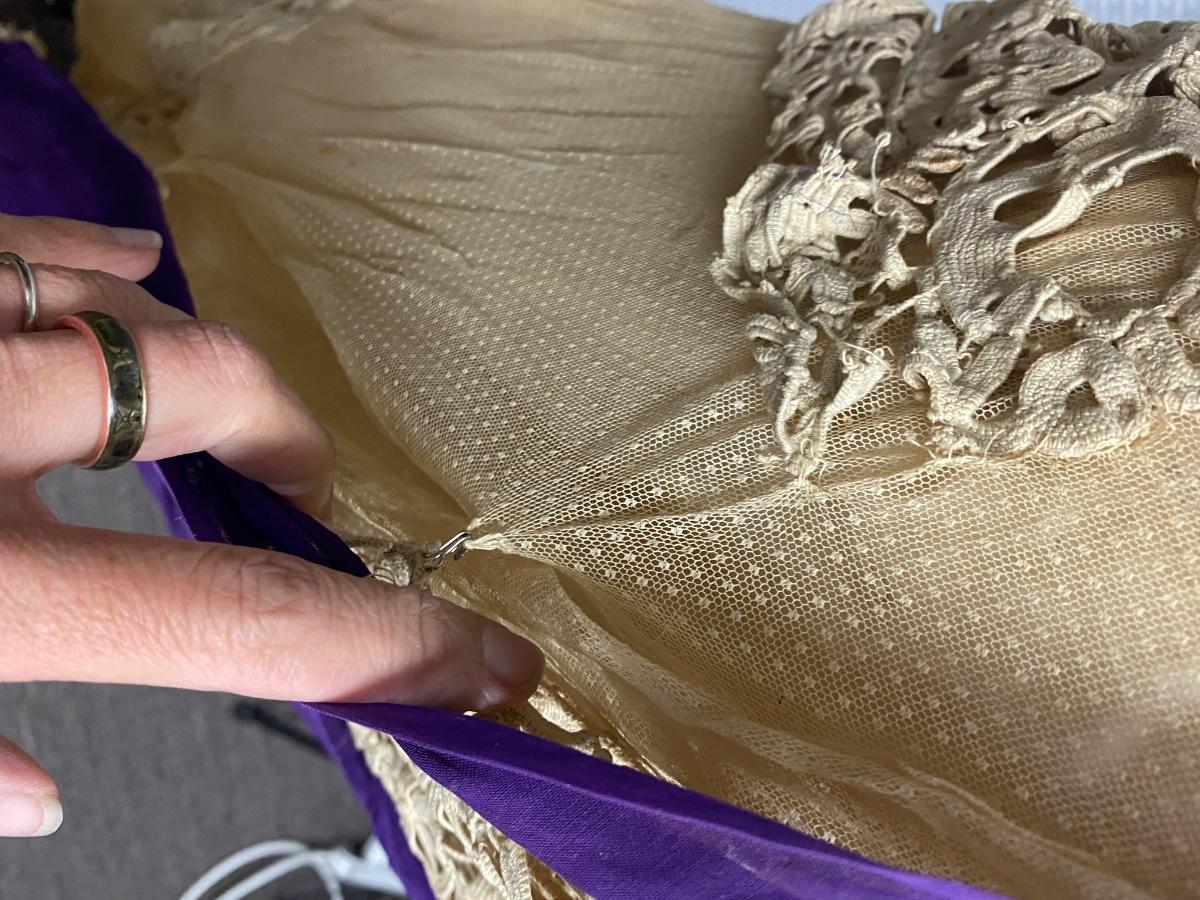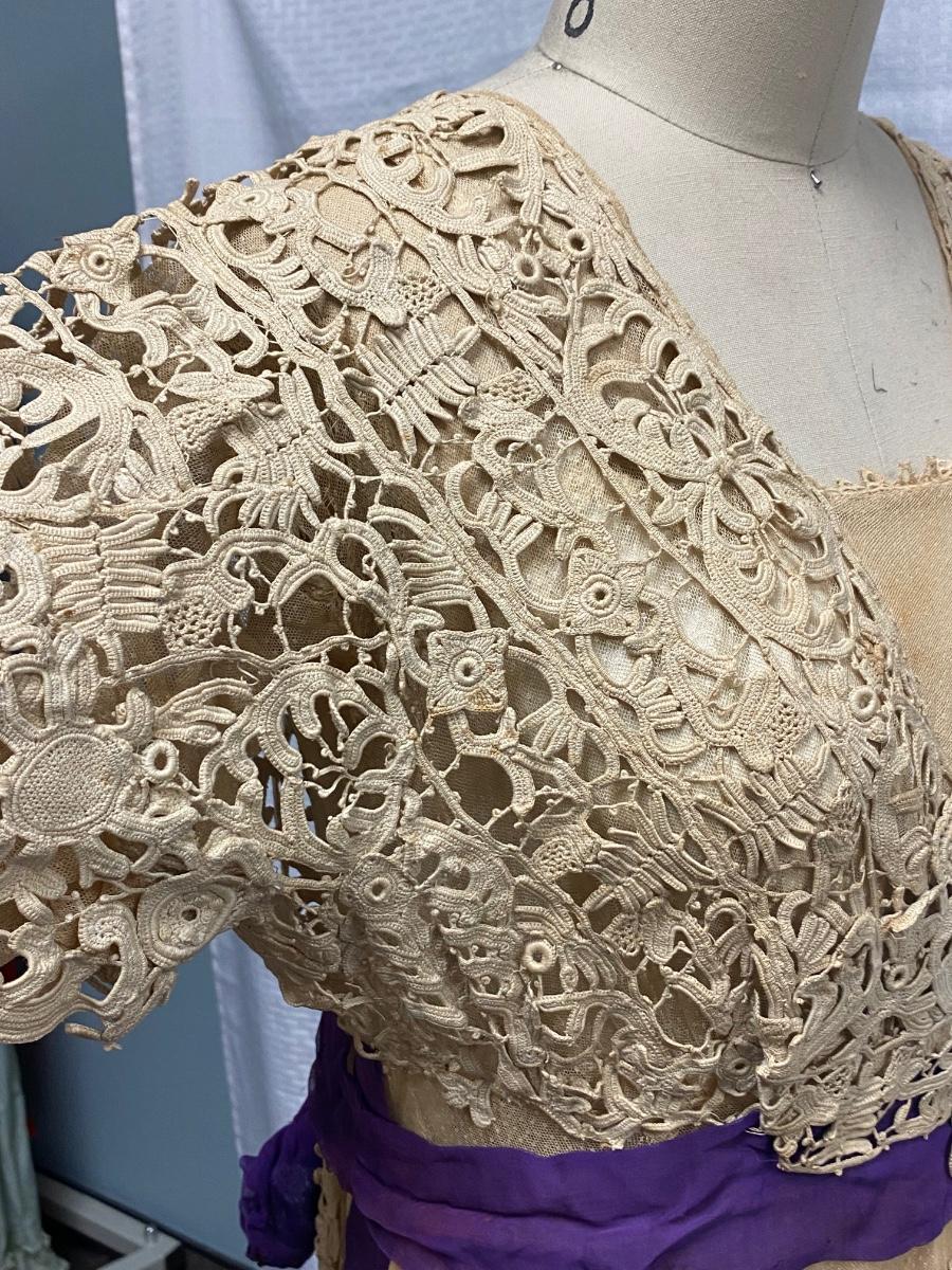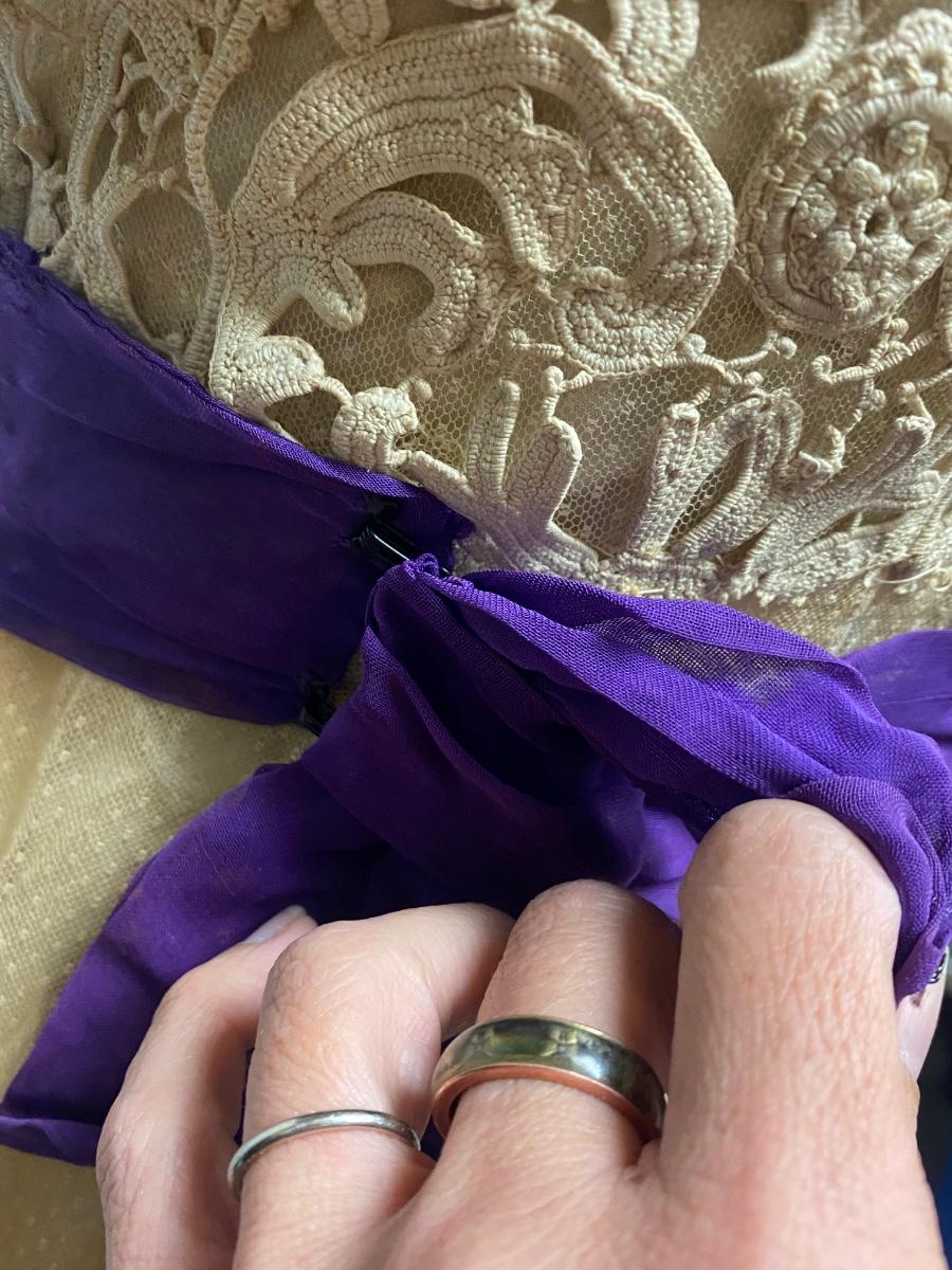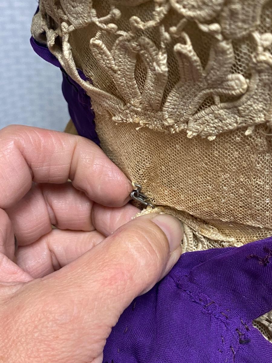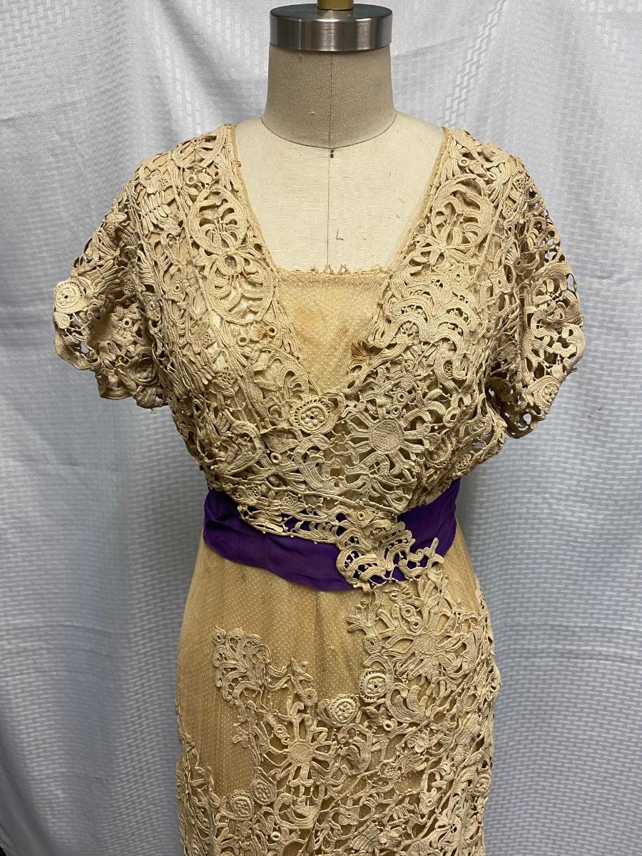 Vintage Antique Heavy Lace Fitted Dress with Violet Velvet Trim. In overall good antique condition. Has discolor from age. Violet purple velvet attached belted waist with back detail. Hook and eye closure with lined top. No major holes or spots, may have some loose thread holes in lace.