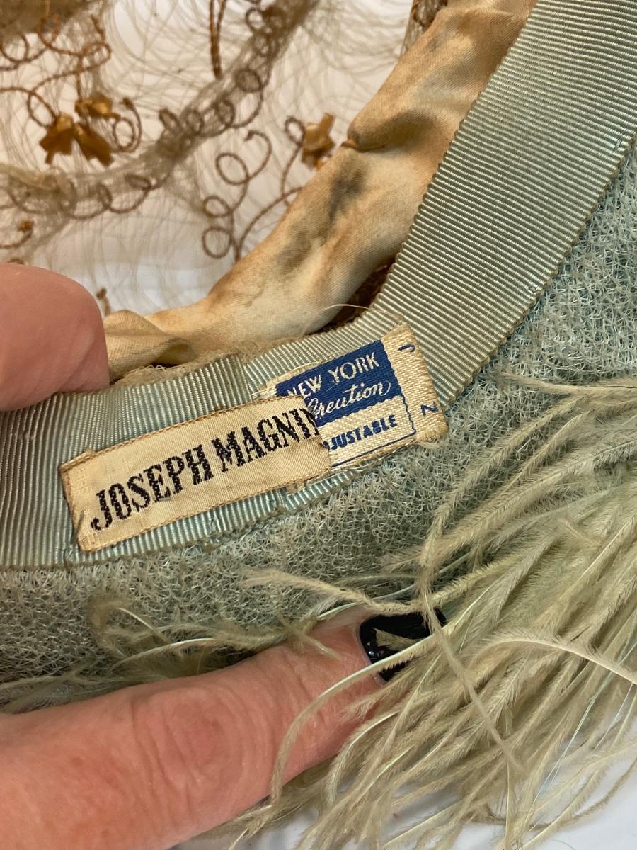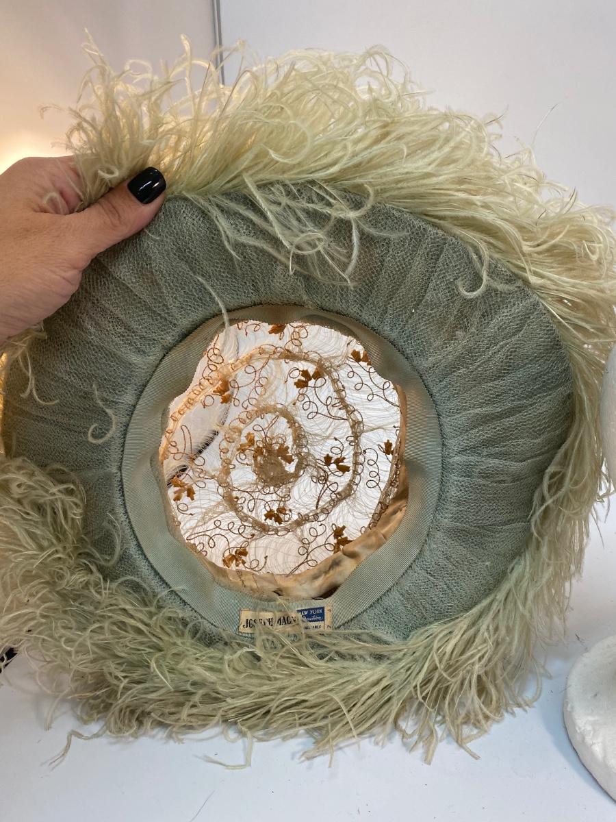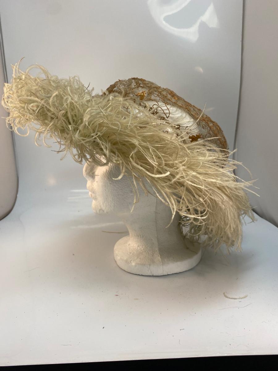 Vintage Antique Joseph Magnin Starched Lace and Ostrich Feather Hat. In overall good vintage conditin. There is discolor from age.