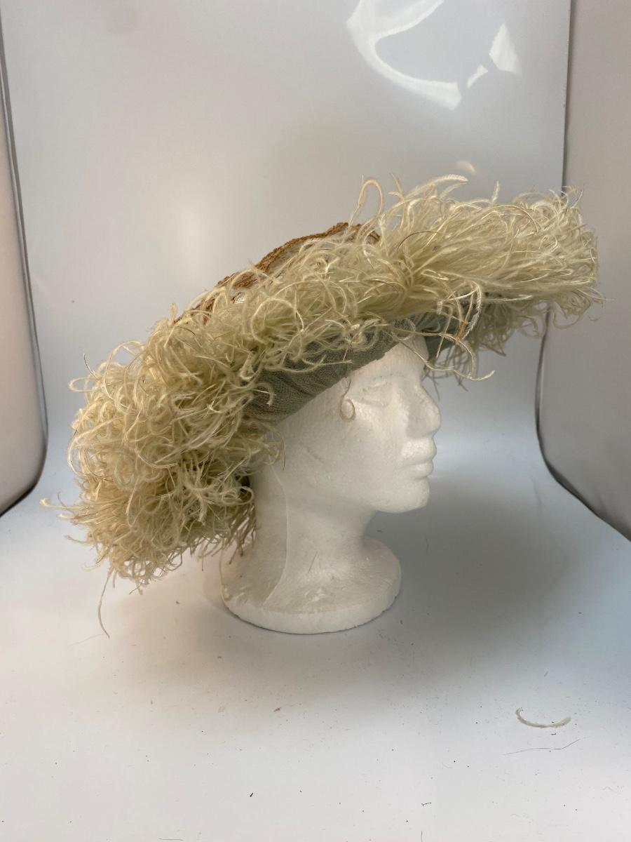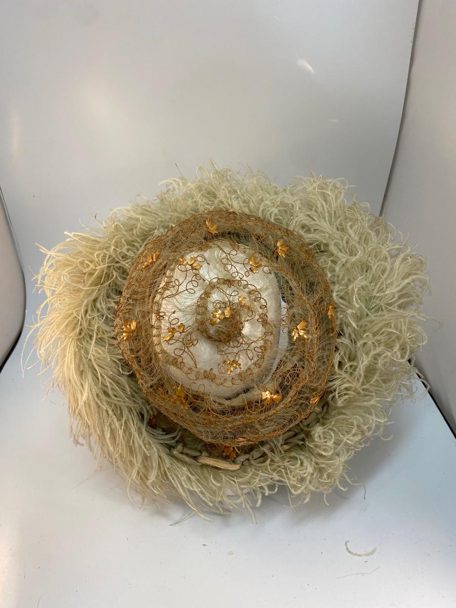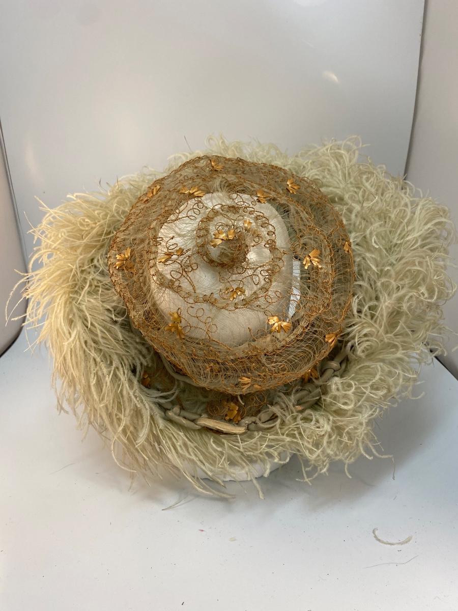 Vintage Antique Joseph Magnin Starched Lace and Ostrich Feather Hat. In overall good vintage conditin. There is discolor from age.
