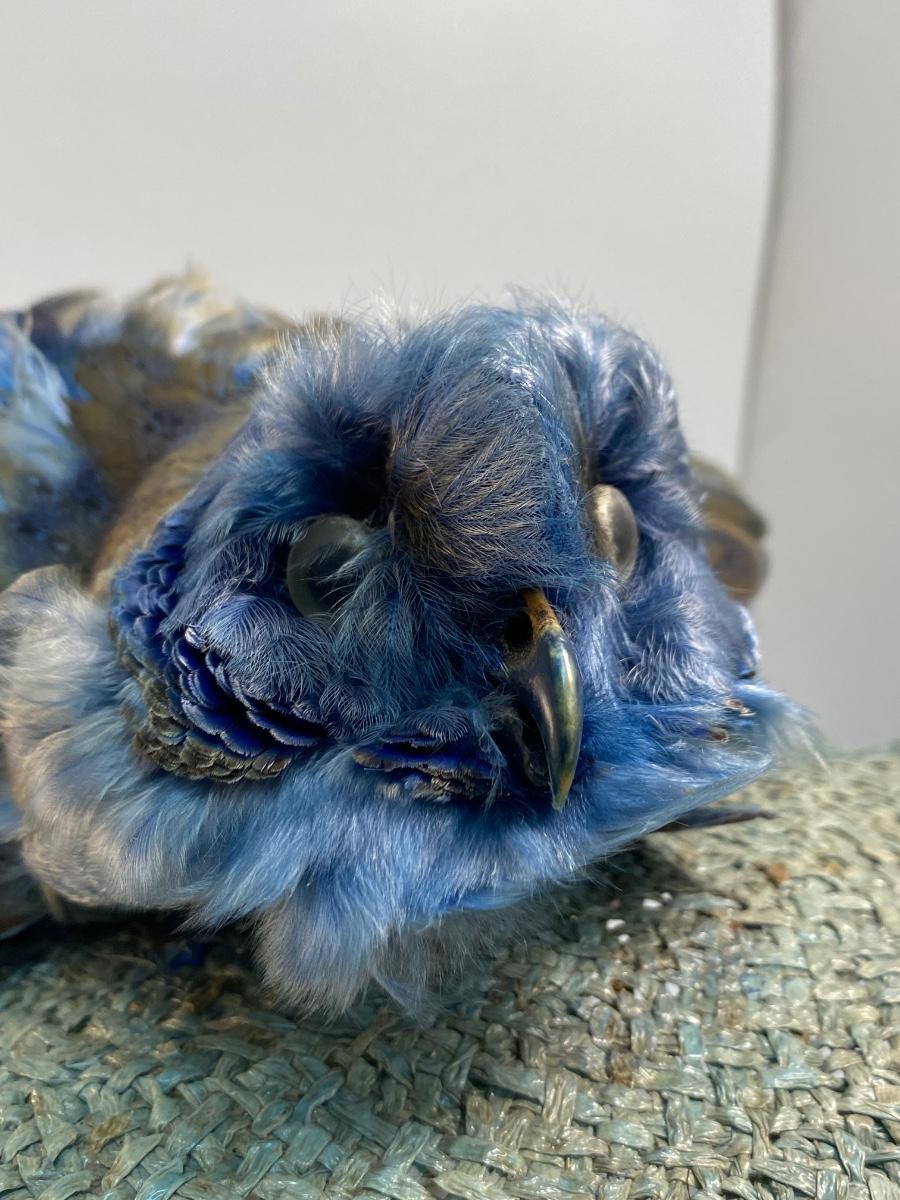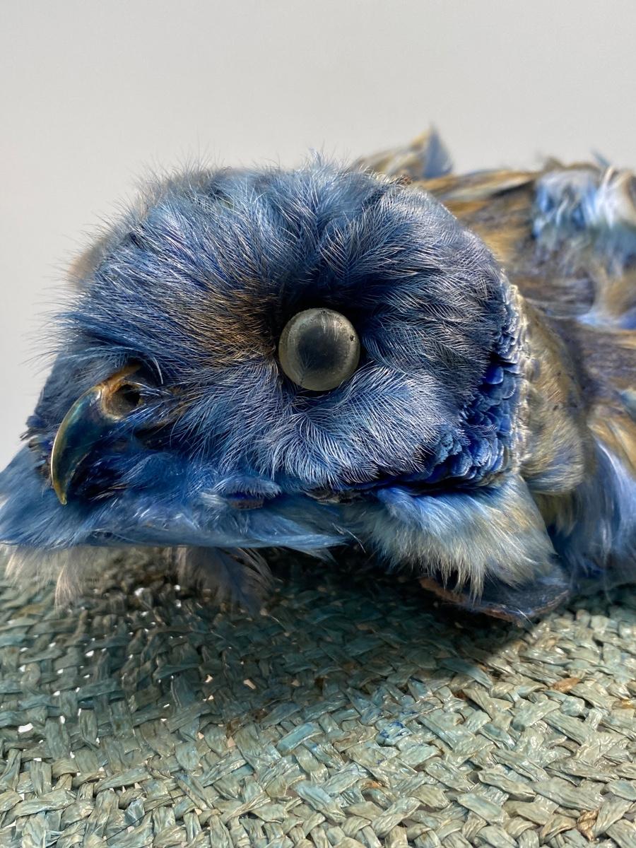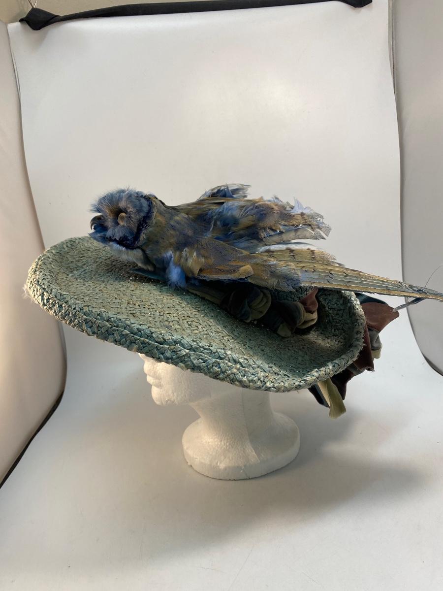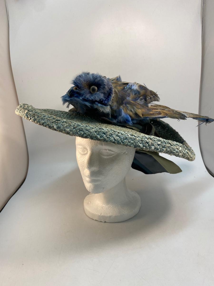 Vintage Antique Ladies Straw Sun Hat Blue Dyed Owl Feathers. Interesting hat was probably worn for special events and teas. The owl is real, it is the head and wings that have been preserved and dyed. The hat is discolored from age and storage. Most likely from the early 1900s by the style. From the Victorian clothing consignment, we are currently auctioning.