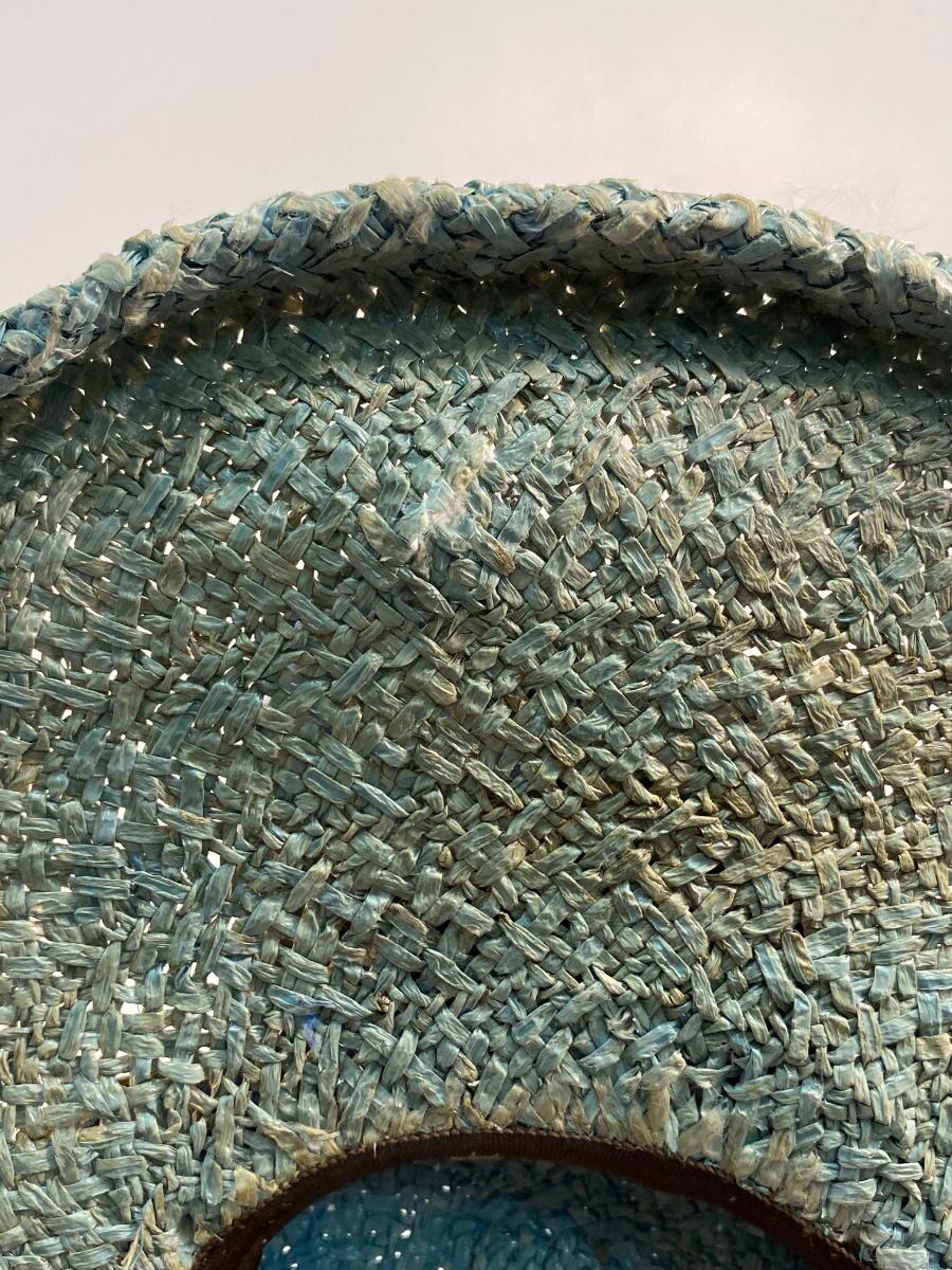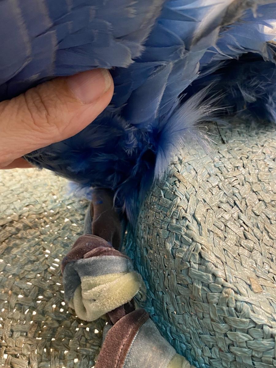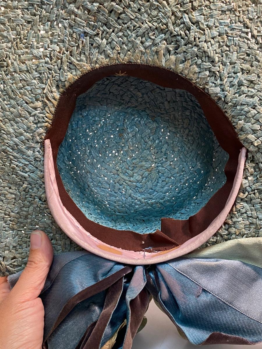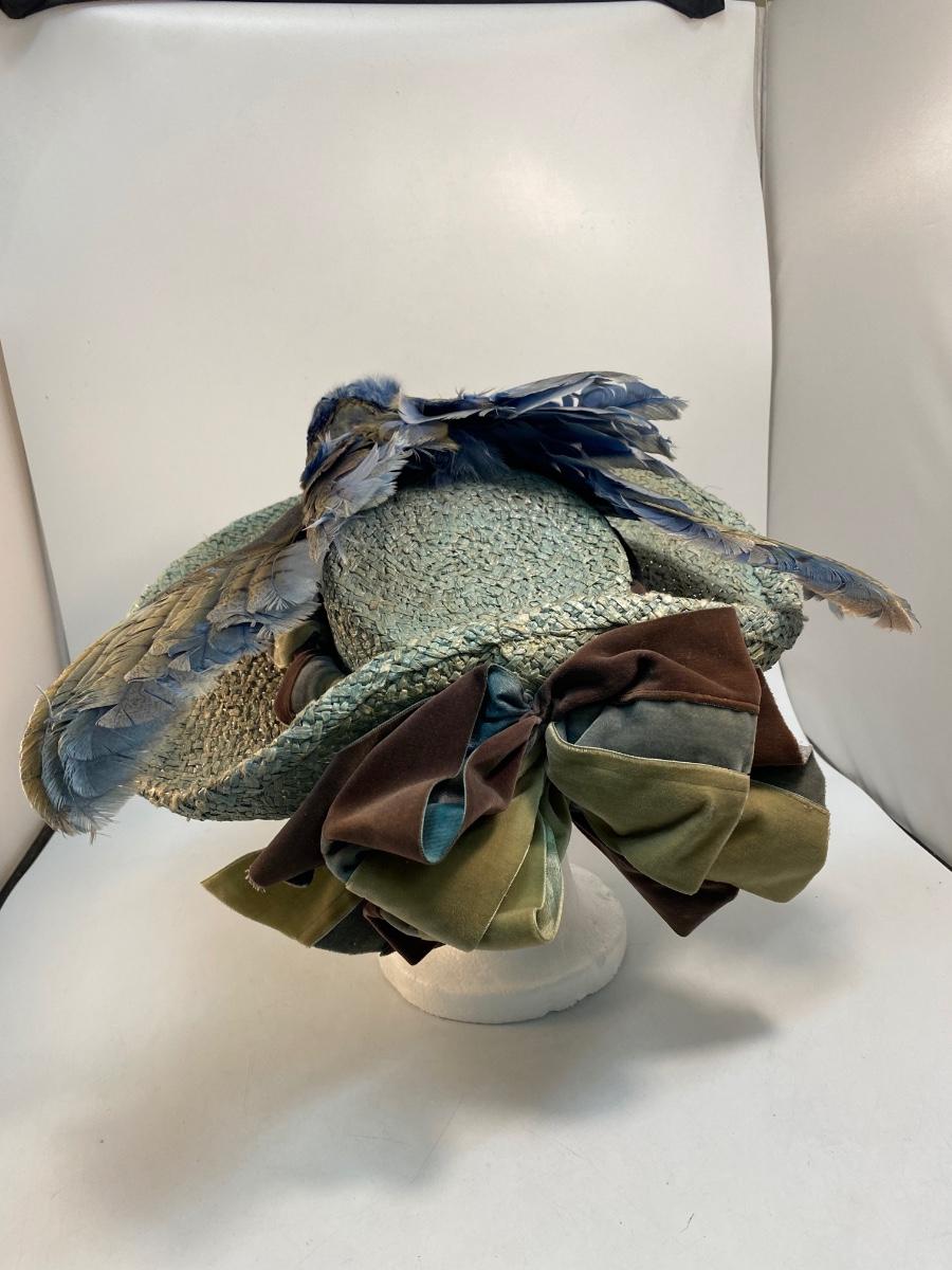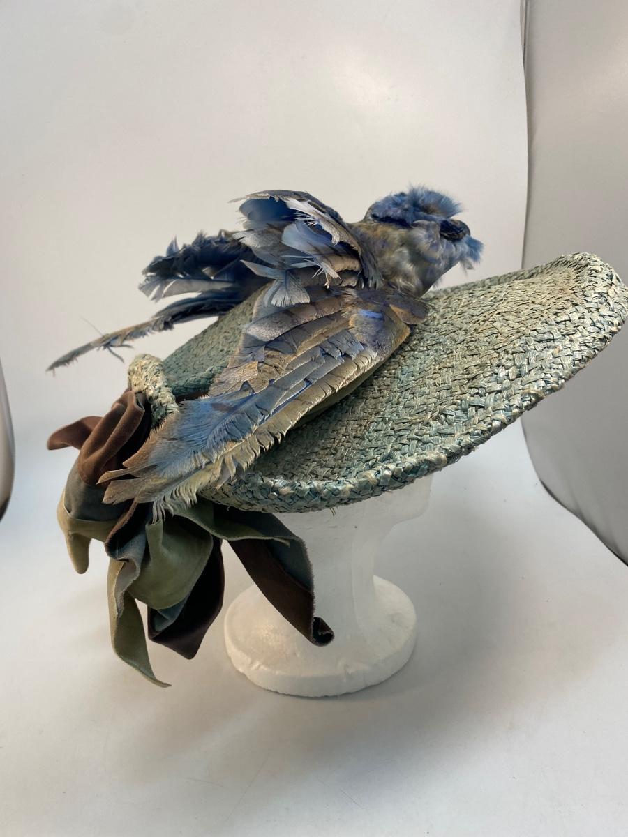 Vintage Antique Ladies Straw Sun Hat Blue Dyed Owl Feathers
