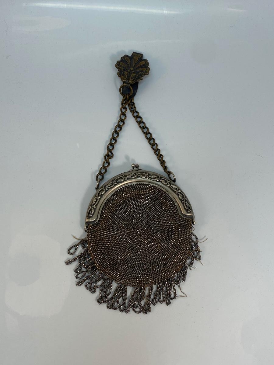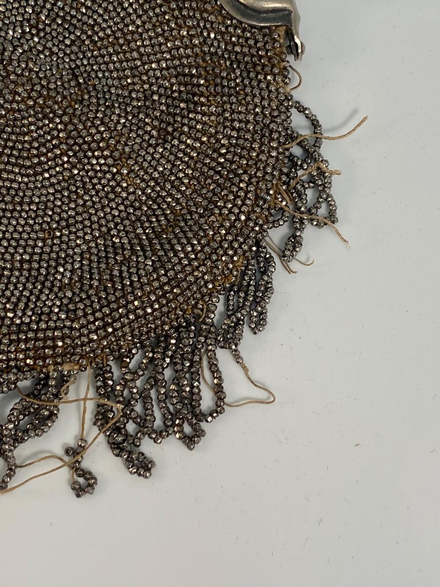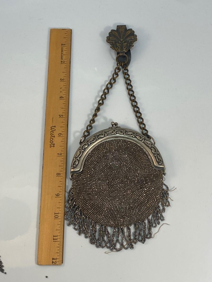 Vintage Antique Leather & Silver Glass Seed Bead Beaded Flapper Coin Purse with Belt Hook. Small size. Some of the beaded fringe is coming apart and needs to be fixed. no sterling marks on the framework or the belt hook. No holes in purse noticed either.