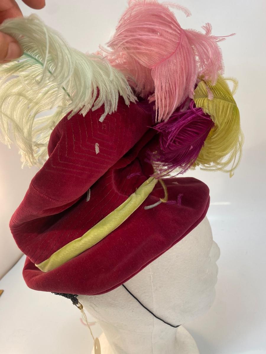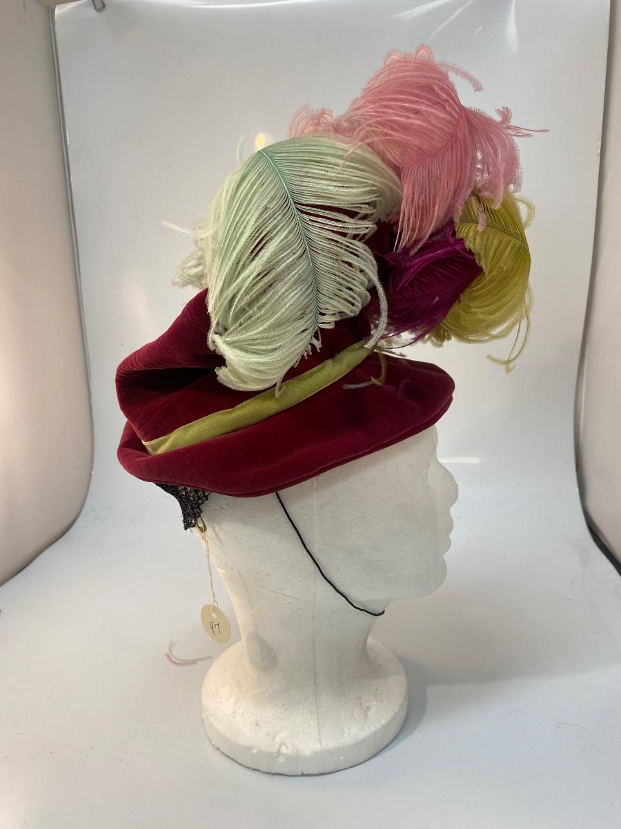 Vintage Antique Marion Valle Original Burgandy Feathered Slouched Top Hat Fedora Fascinator. In good vintage condition. Burgandy hat with colorful ostrich feathers.